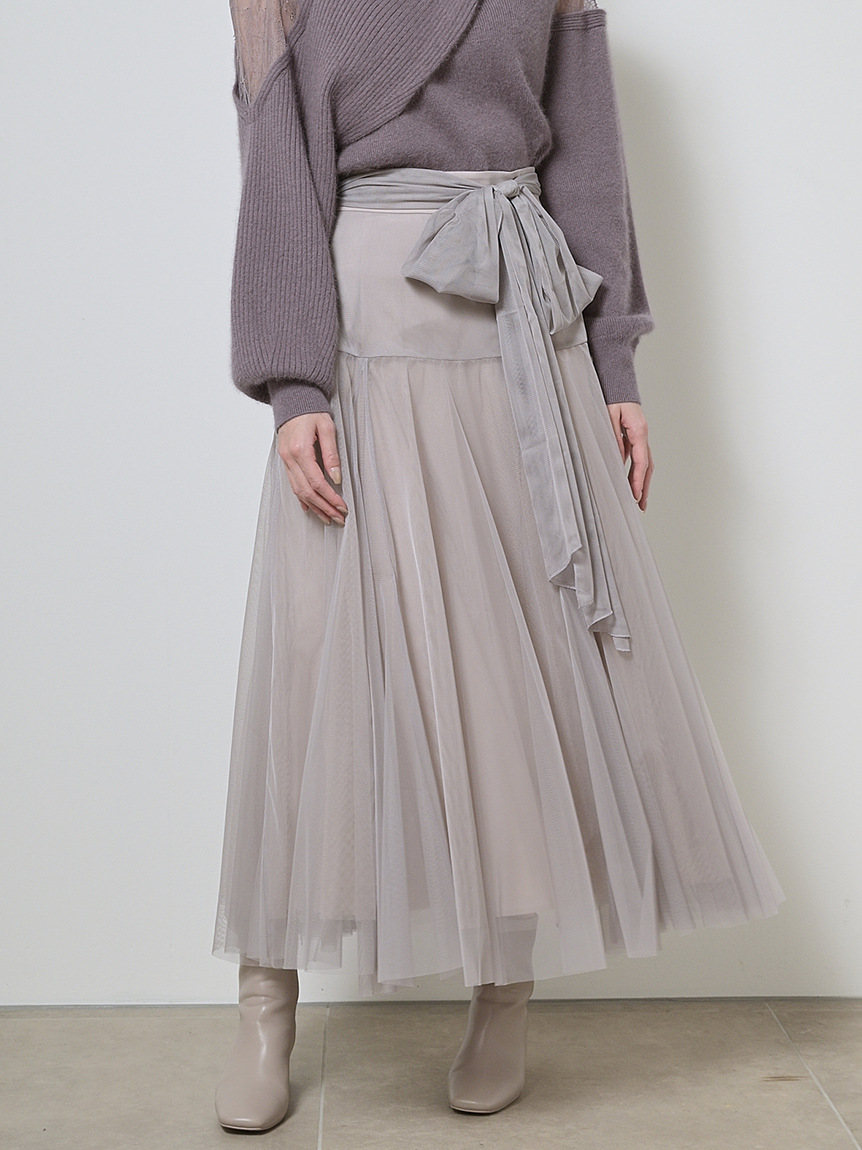 ヘルシーな肌魅せとアシンメトリーデザインで、甘さとモードをミックスしたニットプルオーバー。左袖から左肩へと続くリブを太くし変化をつけることで、メリハリのあるデザインにしました。台形のネックラインは、鎖骨が見える絶妙な開き具合で顔回りをすっきりとした印象に。切り替えた袖のレースが色香を纏い、重くなりがちなニットの引き算としても存在感を発揮します。