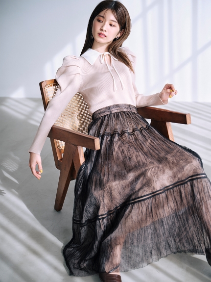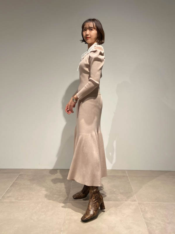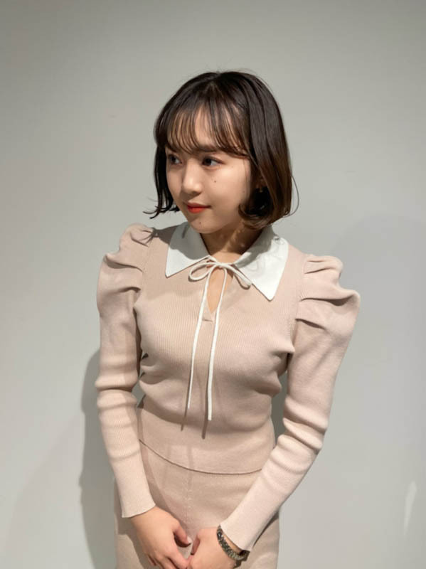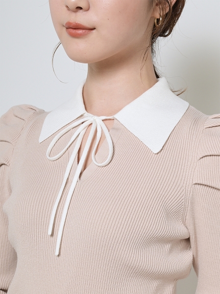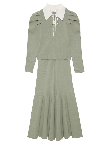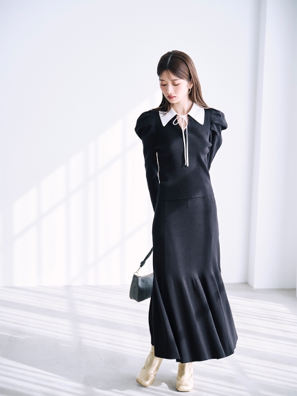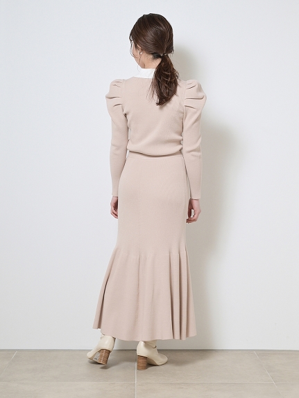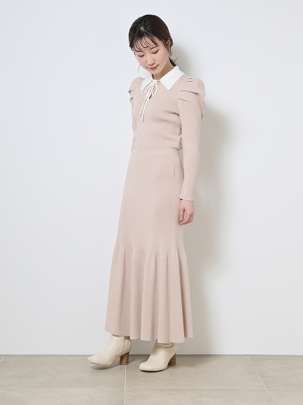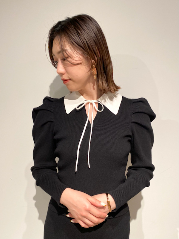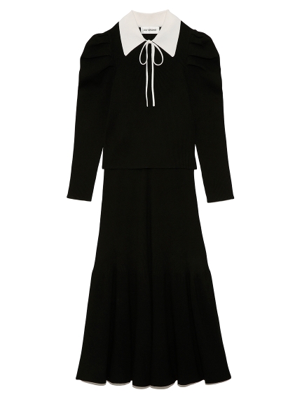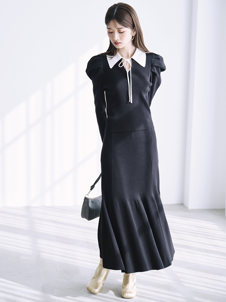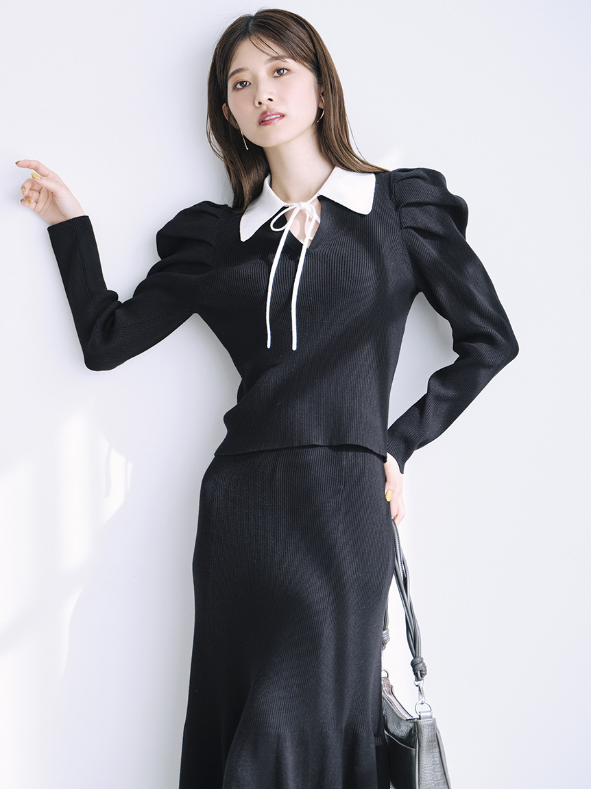 今シーズンマストなマーメイドシルエットが、スタイルアップを叶えてくれるニットアップ。ボディには着心地の良いリブ地を使用。袖は立体的なパフスリーブにしたことで、華やかさを演出してくれます。配色の襟に、とも糸の細リボンが女性らしさを引き立たせてくれます。