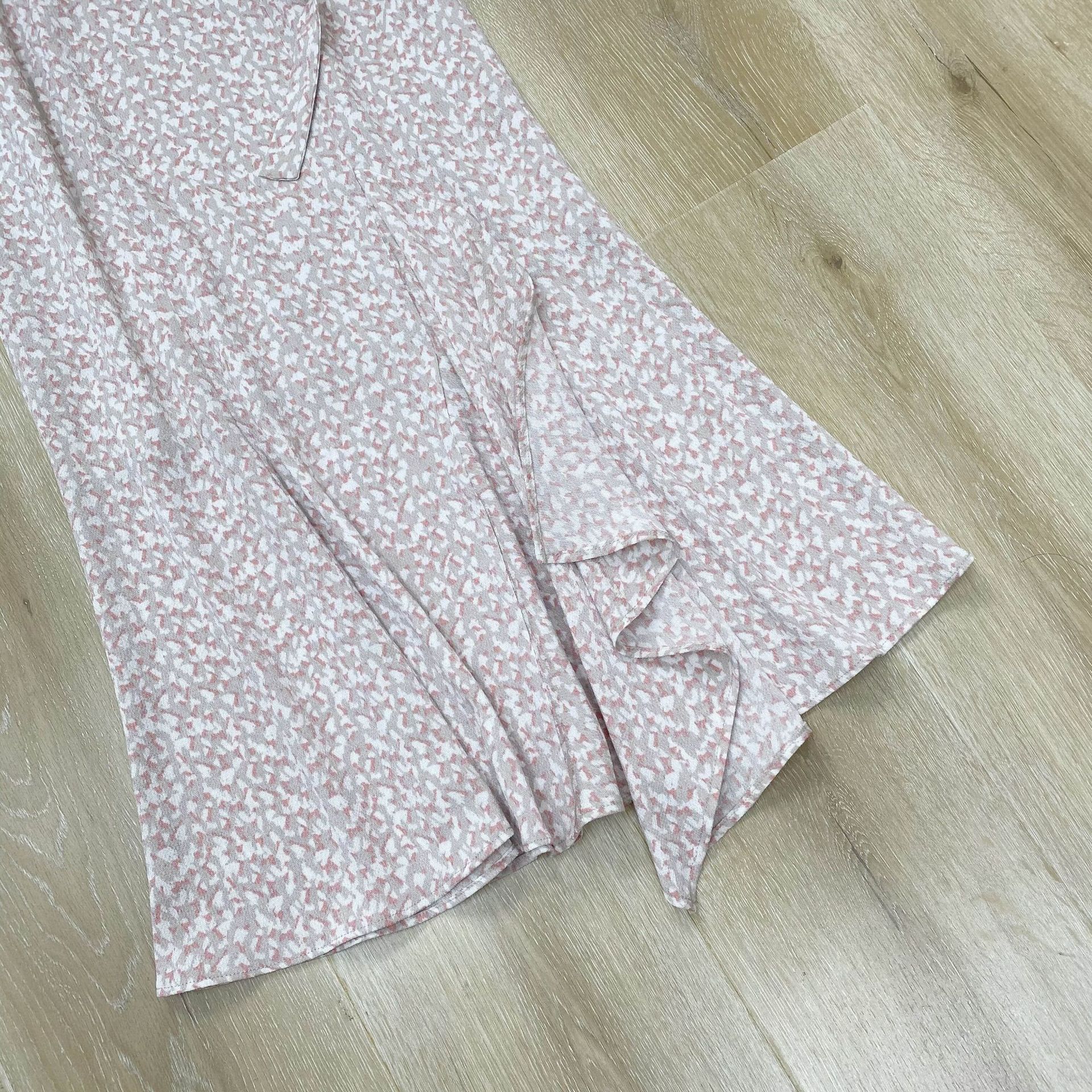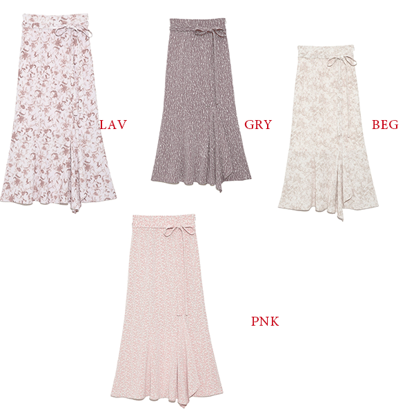 美しいフレアラインを演出してくれるしなやかなファブリックを使用。ランダムドット柄のダークグレー、大人っぽい雰囲気を与えるベージュ、華やかな印象のピンク、可愛らしさのあるラベンダーの4色展開。