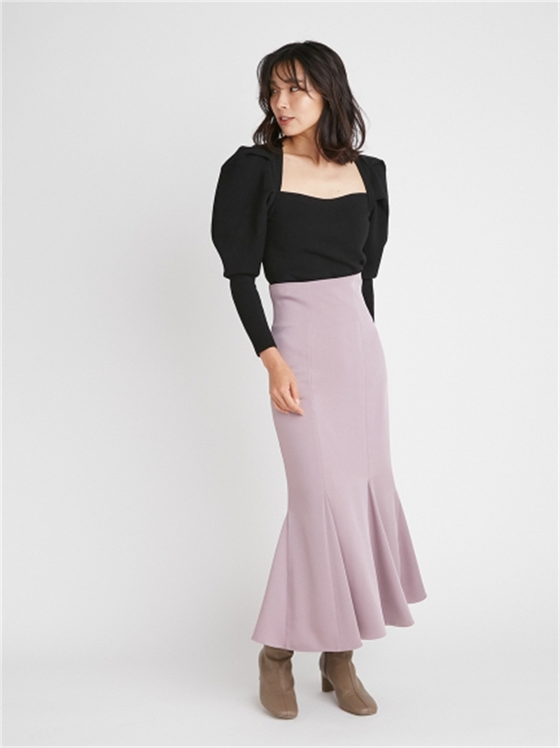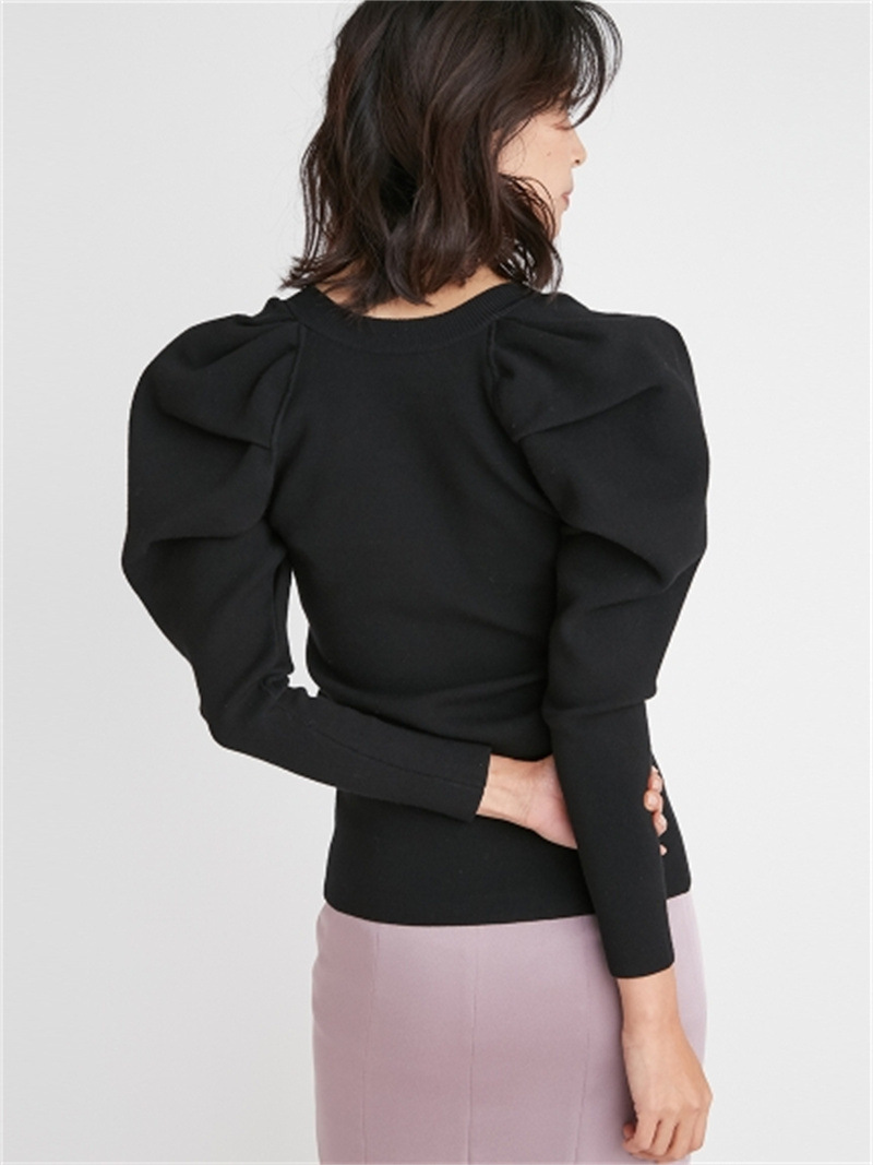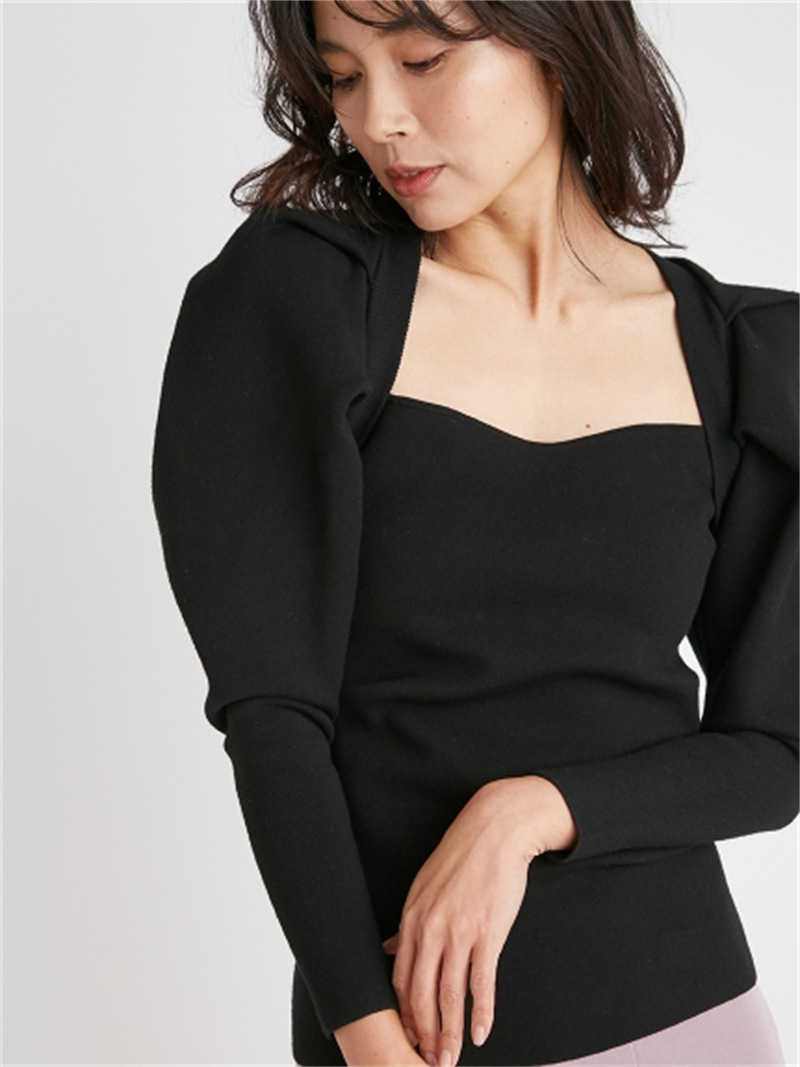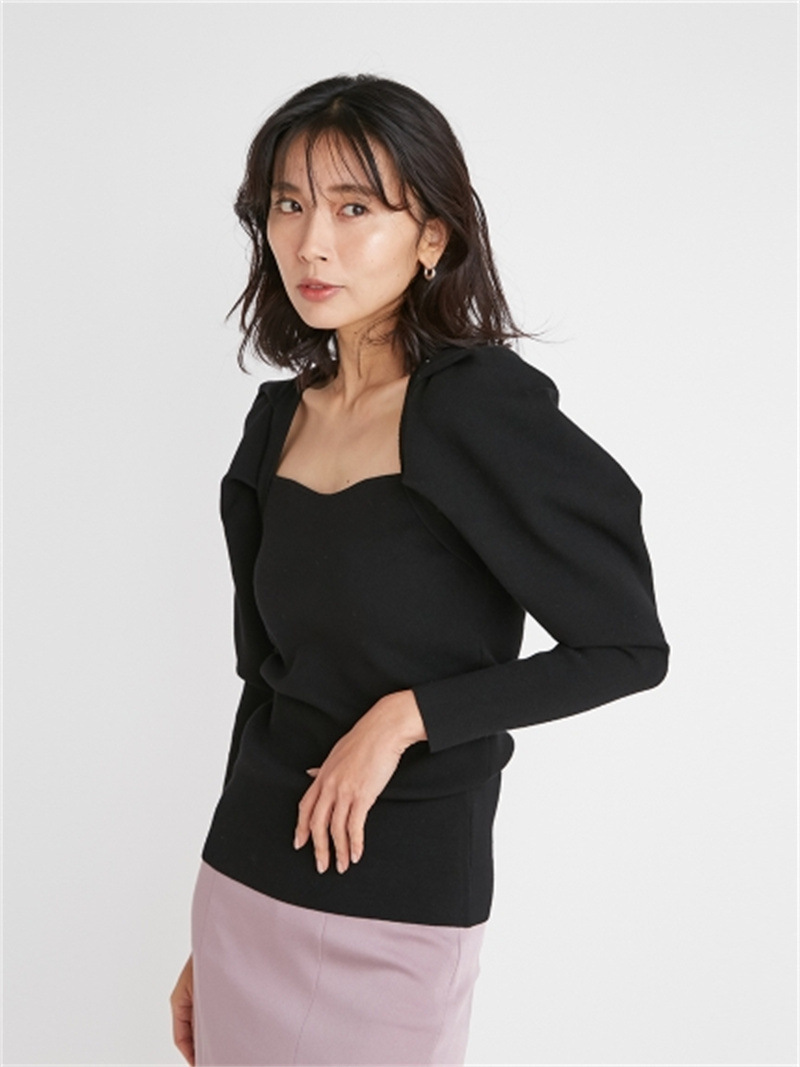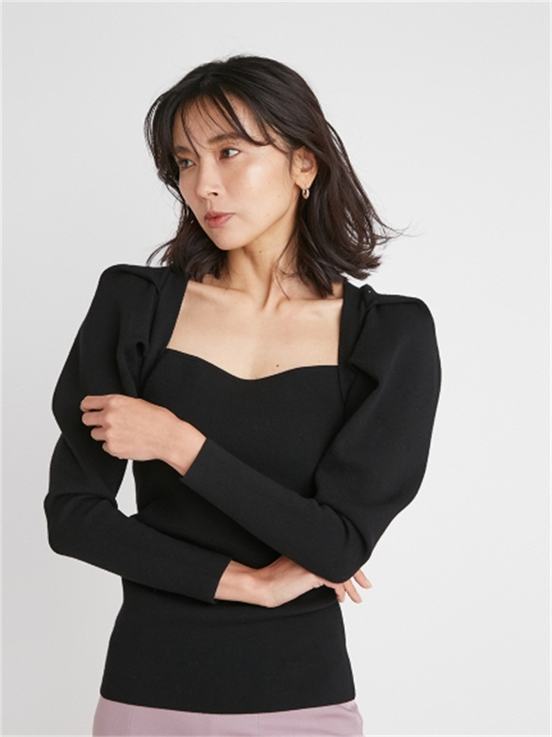まるでコルセットをレイヤードしているかのような技ありデザインが目を引く、上品クラシカルなニットプルオーバー。絶妙なカーブを描く胸元のラインが、さり気なく女性らしさを高めてくれます。タックを効かせたっぷりとボリュームを持たせたパフスリーブとタイトな身頃のメリハリシルエットでスタイルアップ効果は抜群。ゆったりと広がるフレアスカートからパンツまで様々なボトムと相性が良く、着まわし力も◎です。