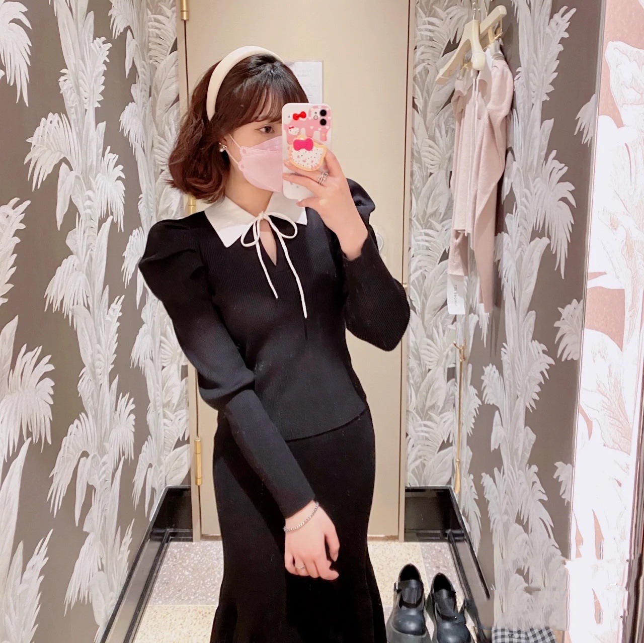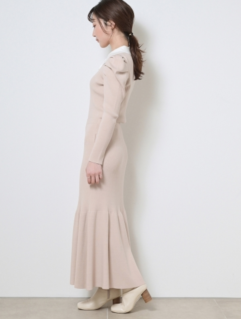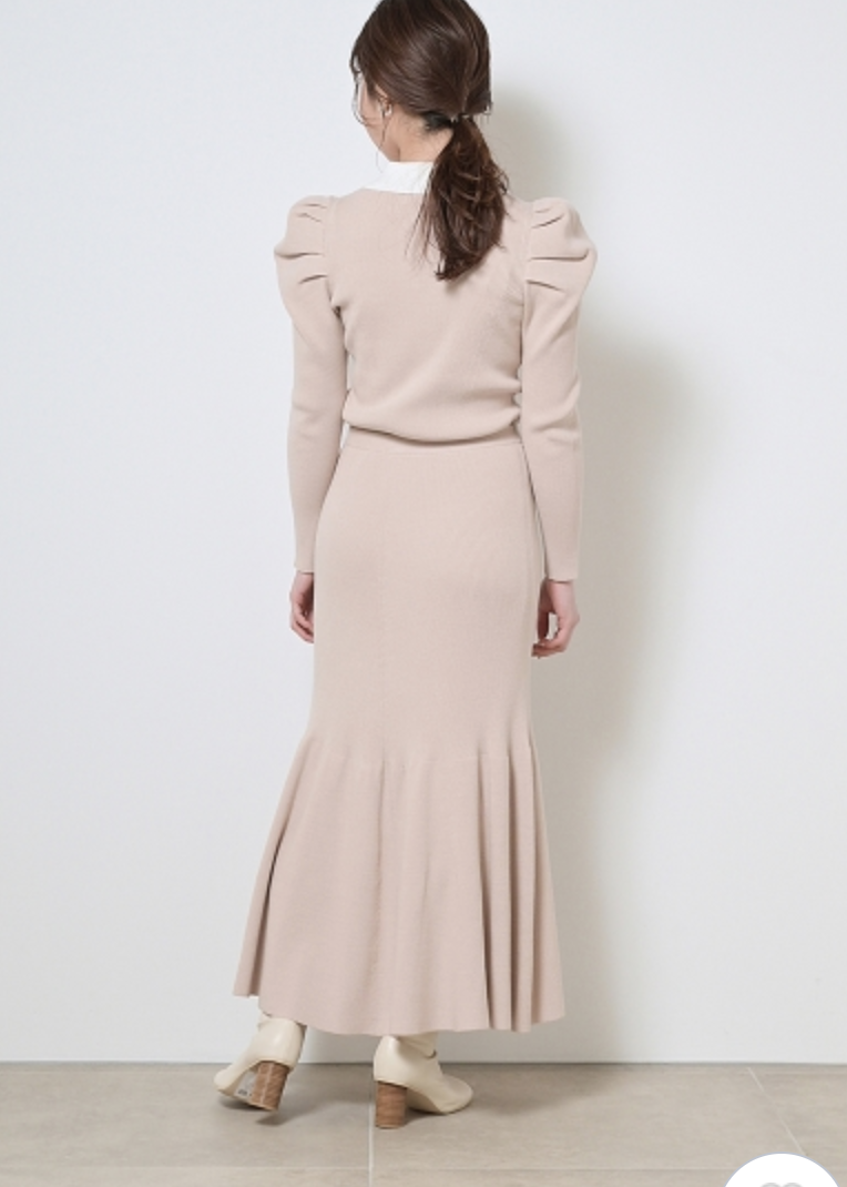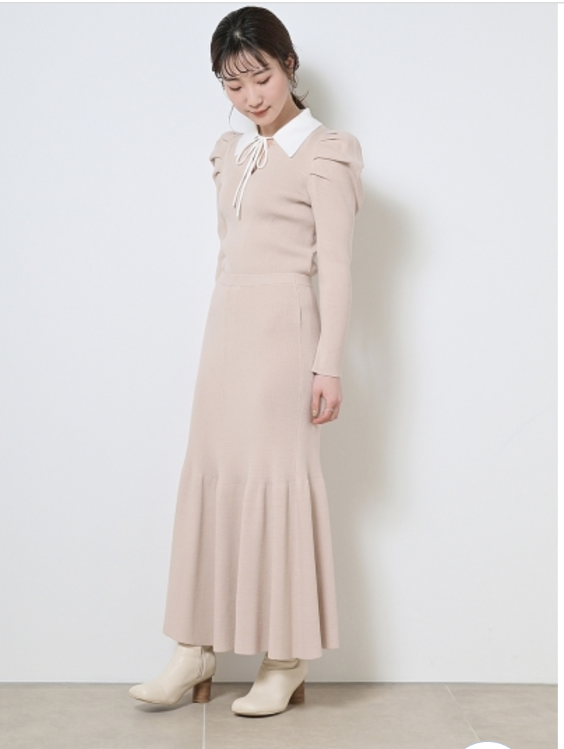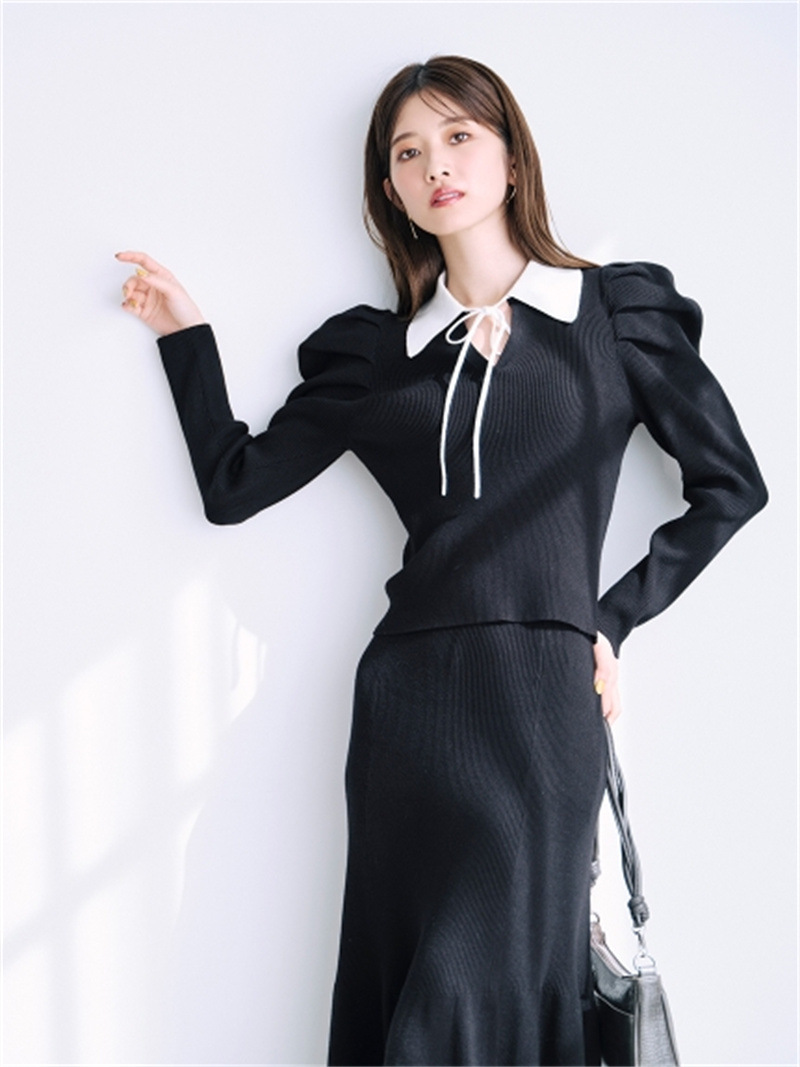 今シーズンマストなマーメイドシルエットが、スタイルアップを叶えてくれるニットアップ。ボディには着心地の良いリブ地を使用。袖は立体的なパフスリーブにしたことで、華やかさを演出してくれます。配色の襟に、とも糸の細リボンが女性らしさを引き立たせてくれます。