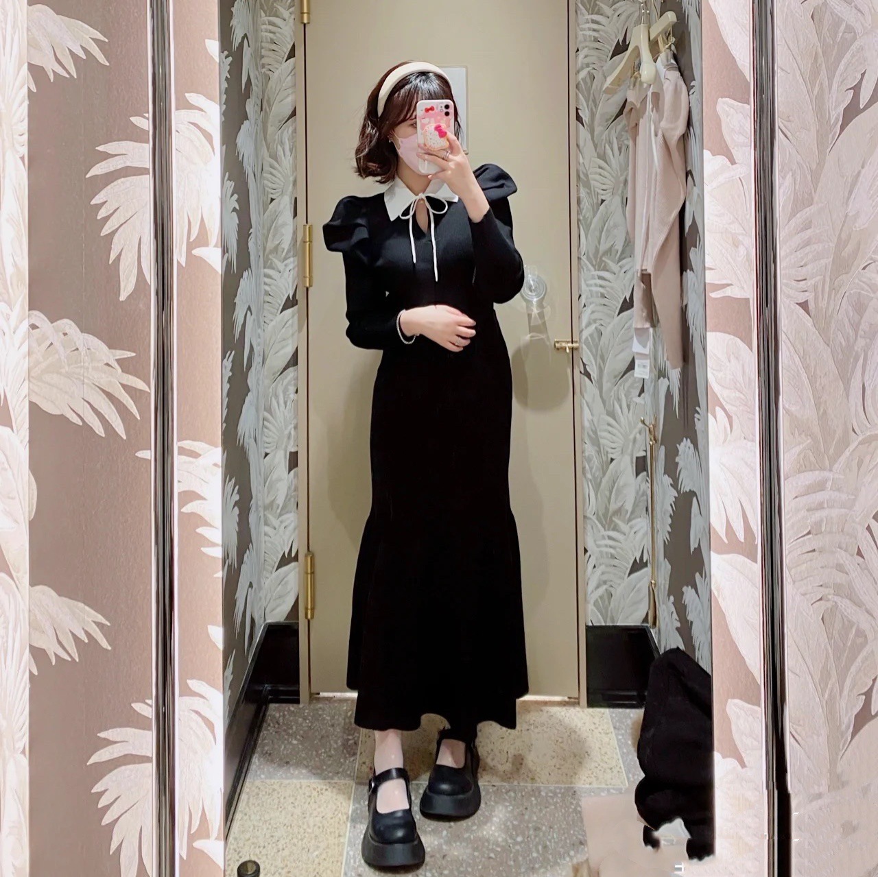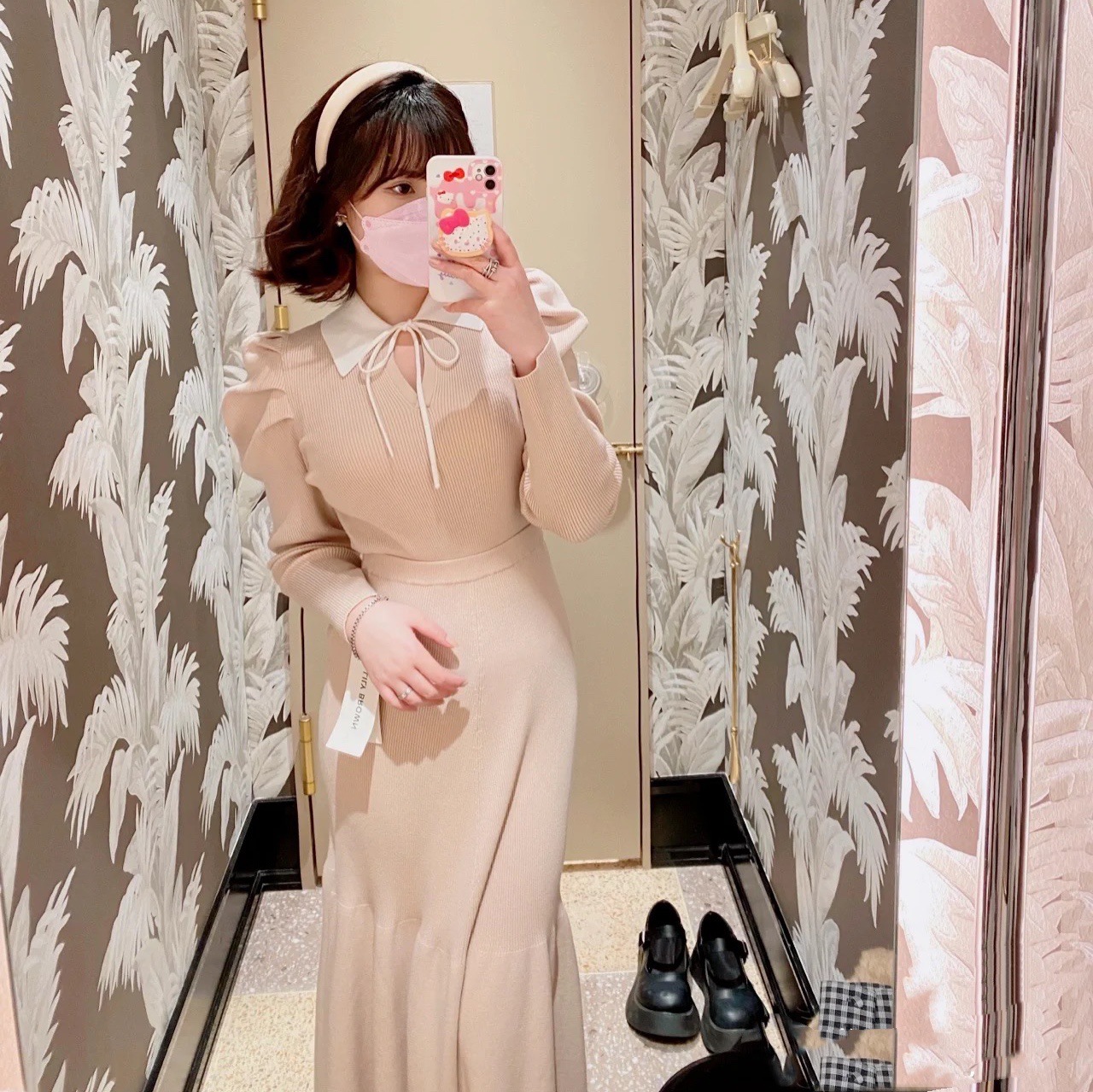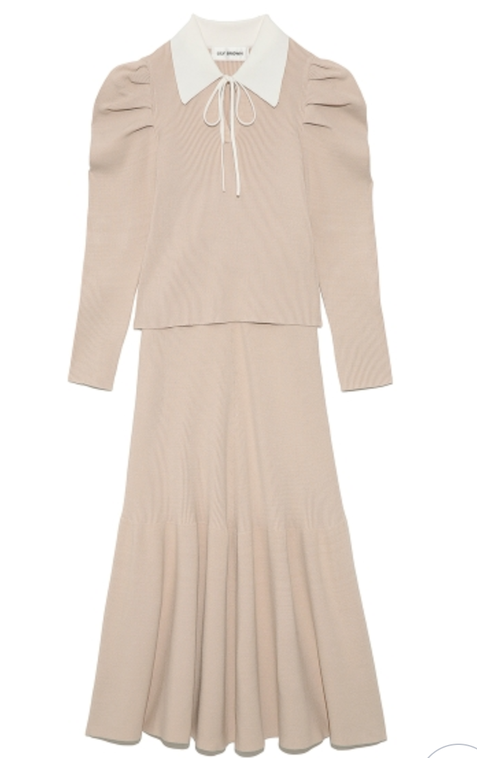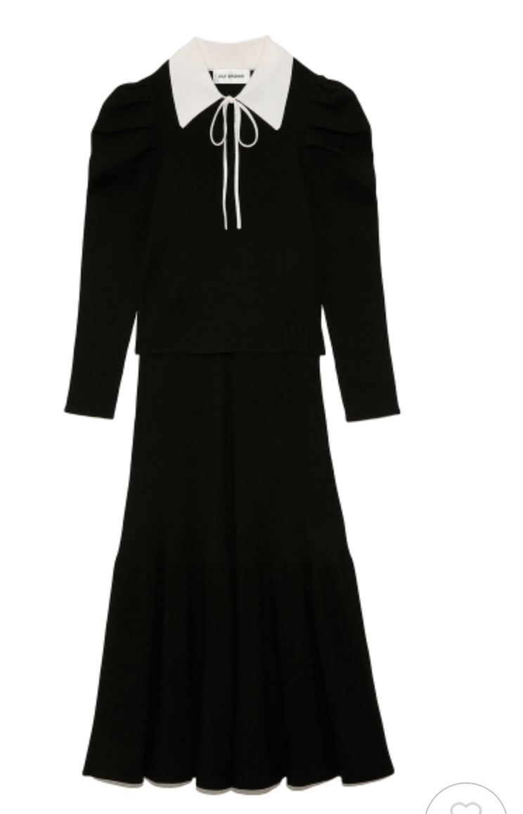 今シーズンマストなマーメイドシルエットが、スタイルアップを叶えてくれるニットアップ。ボディには着心地の良いリブ地を使用。袖は立体的なパフスリーブにしたことで、華やかさを演出してくれます。配色の襟に、とも糸の細リボンが女性らしさを引き立たせてくれます。
