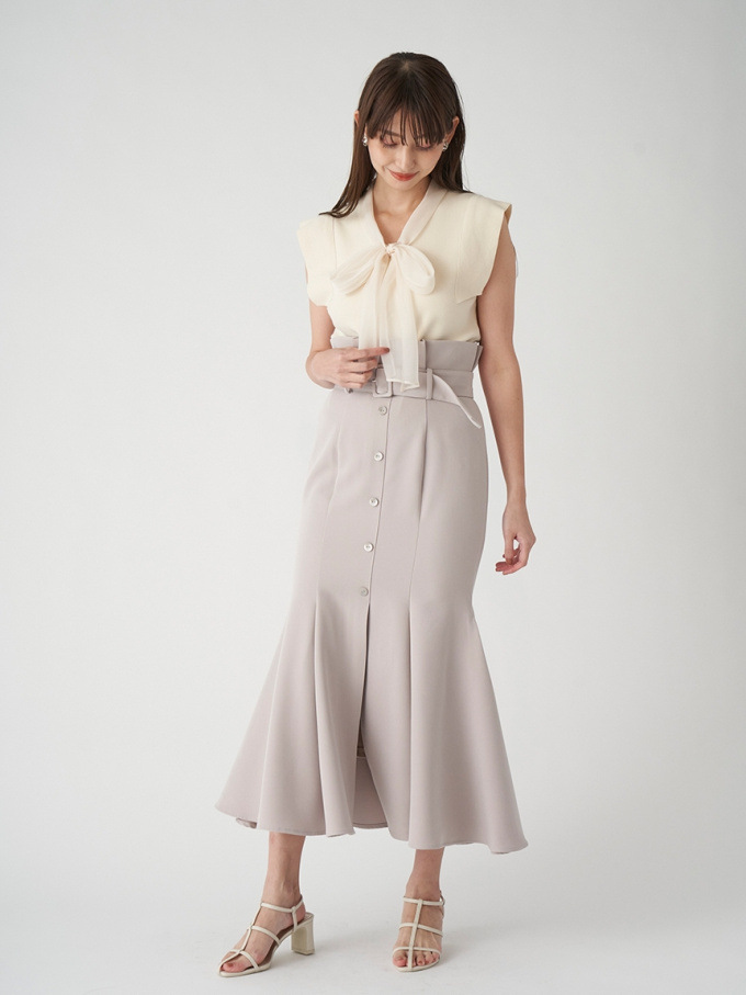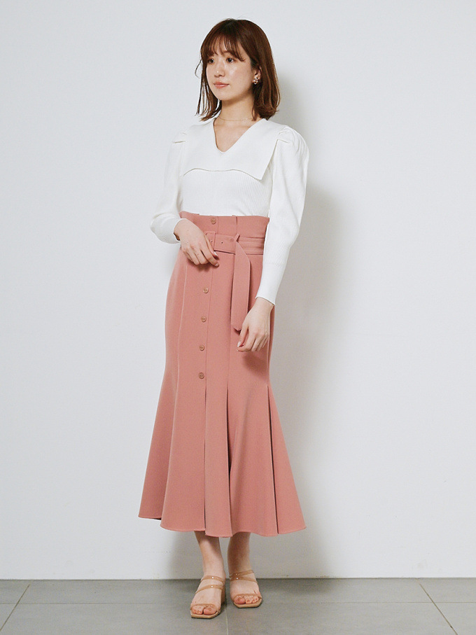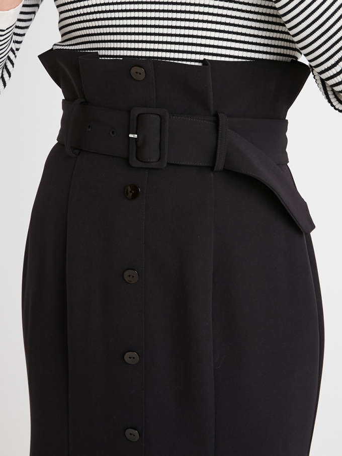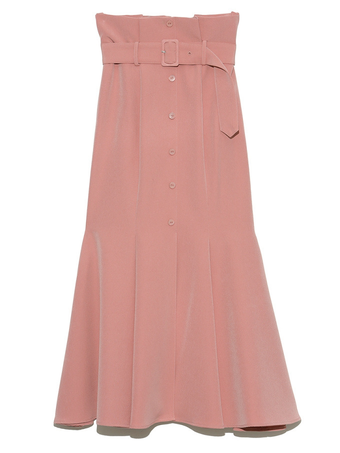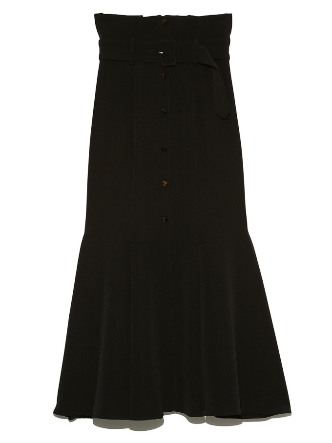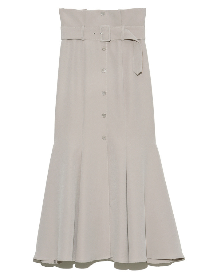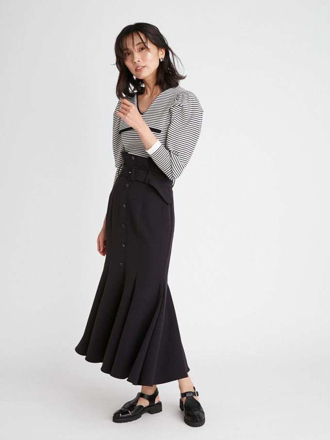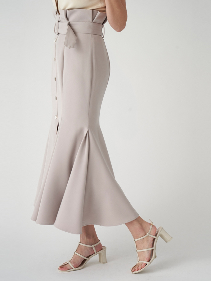 女性らしいラインを綺麗に魅せる美しいマーメイドシルエットが印象的なスカート。フロントにあしらわれたボタンが縦のラインを強調し、スタイルアップ効果をさらに高めてくれます。付属のベルトでマークしたハイウエストデザインはトレンド感◎。後ろファスナーを備えているので簡単に着脱でき、穿き心地も快適です。