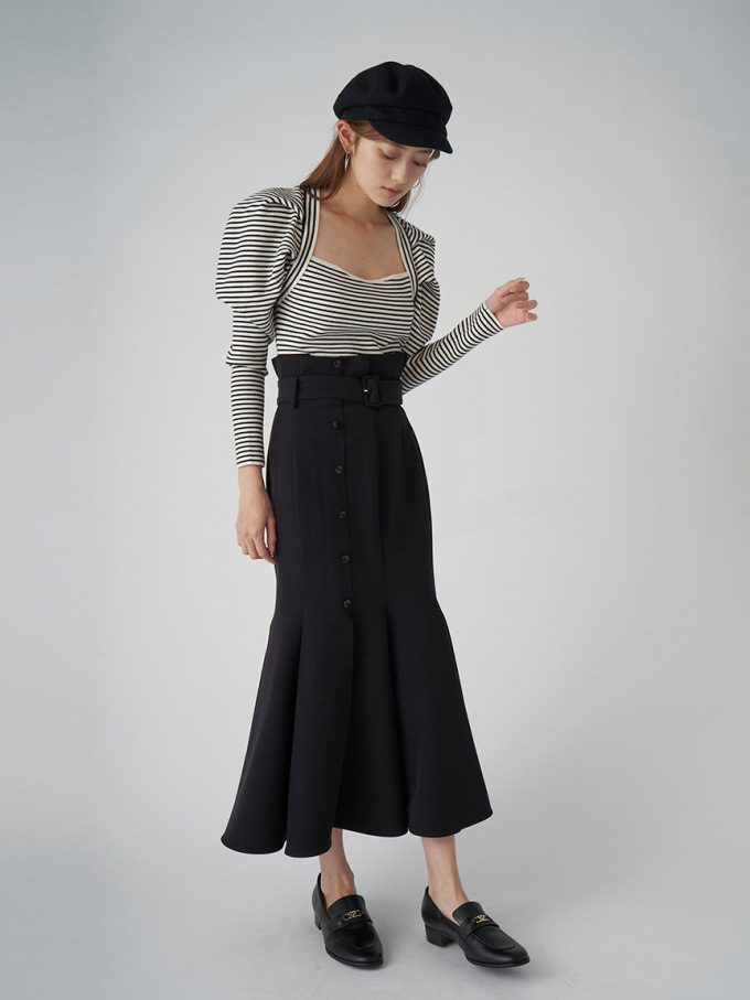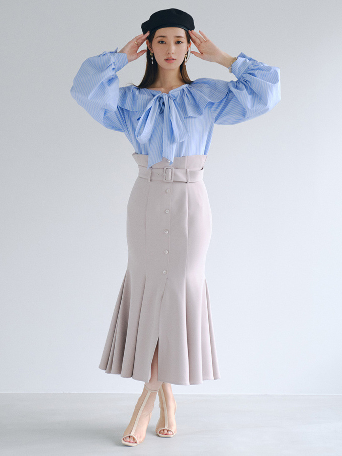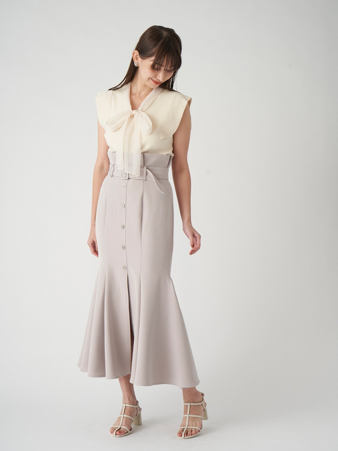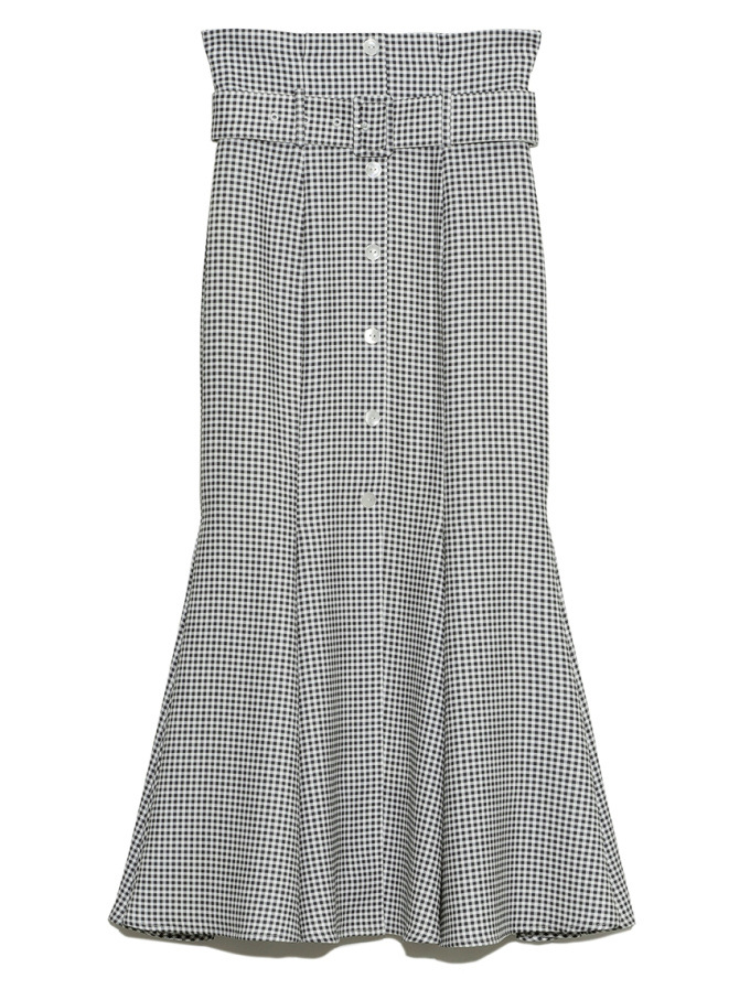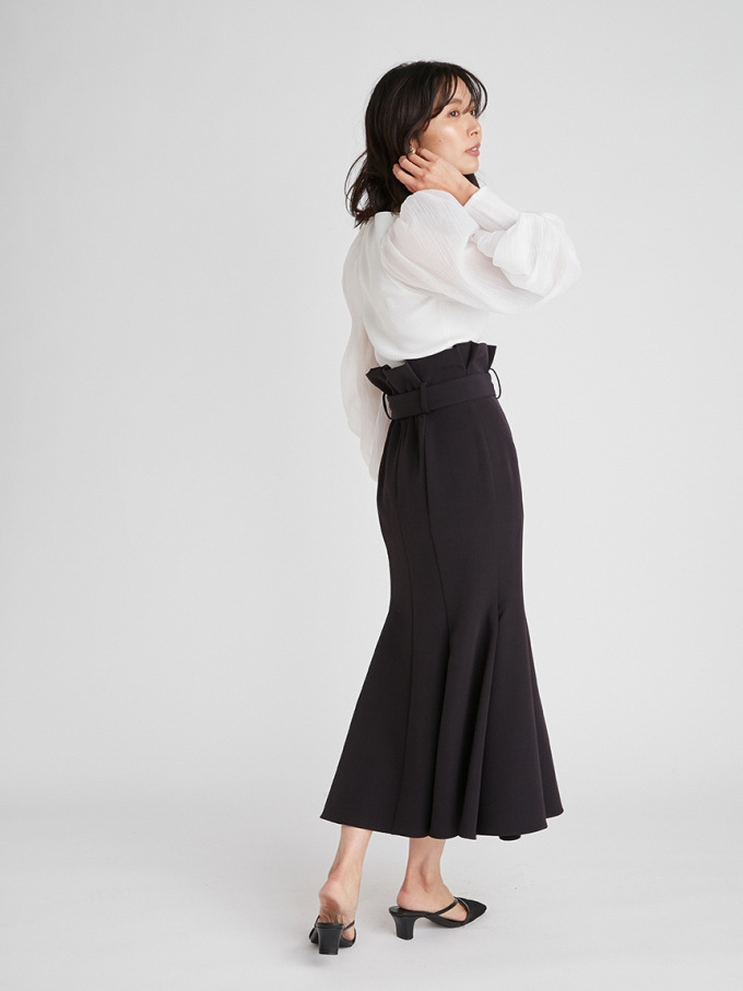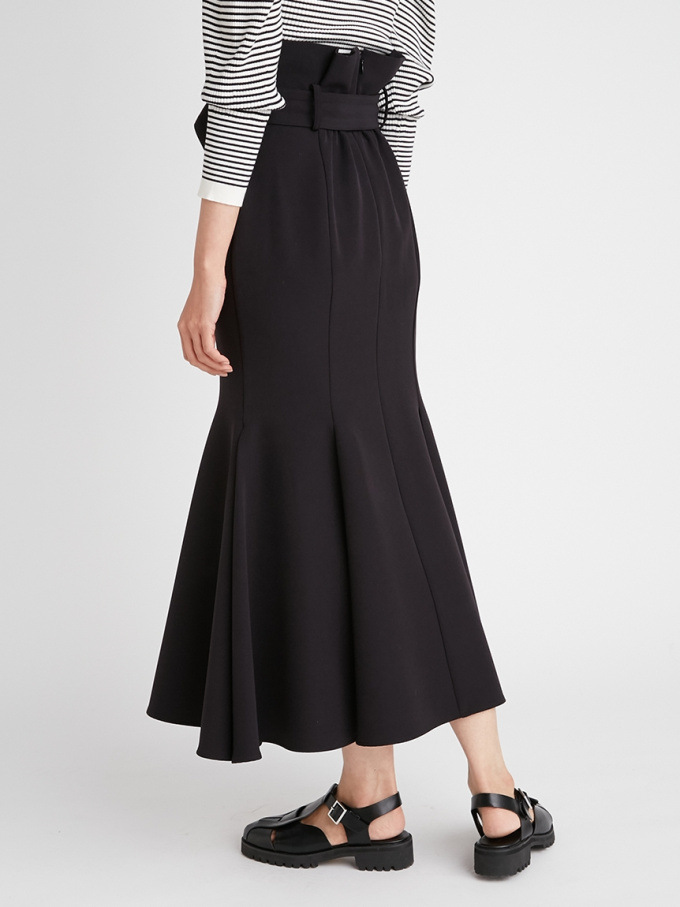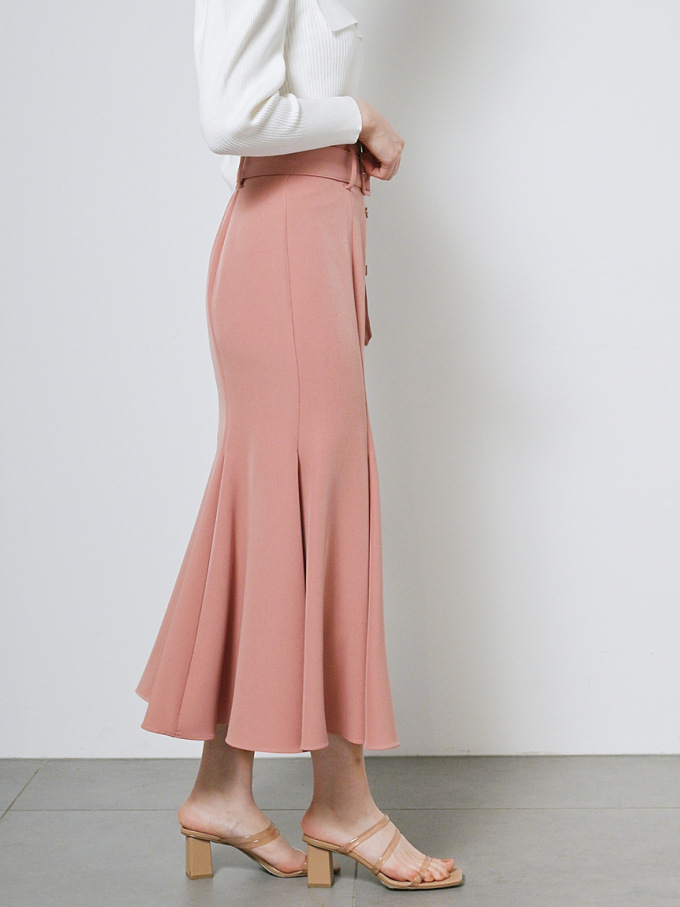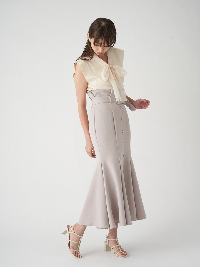 女性らしいラインを綺麗に魅せる美しいマーメイドシルエットが印象的なスカート。フロントにあしらわれたボタンが縦のラインを強調し、スタイルアップ効果をさらに高めてくれます。付属のベルトでマークしたハイウエストデザインはトレンド感◎。後ろファスナーを備えているので簡単に着脱でき、穿き心地も快適です。
