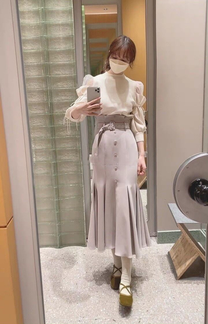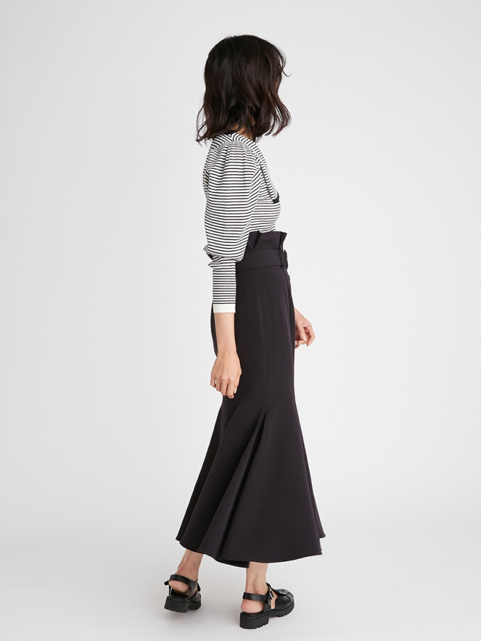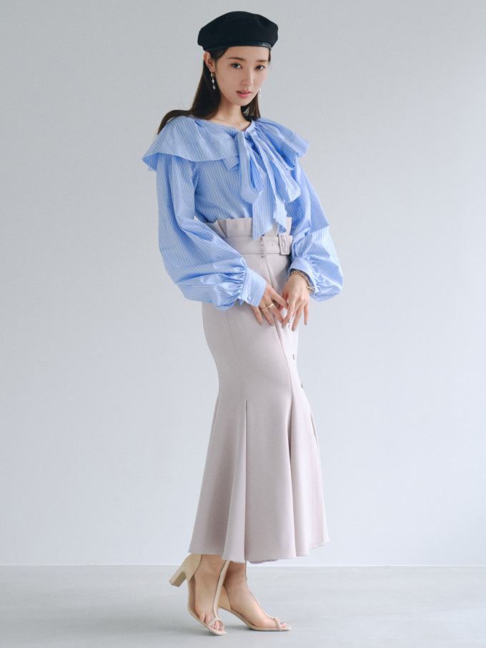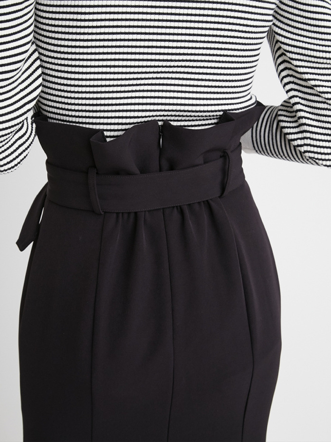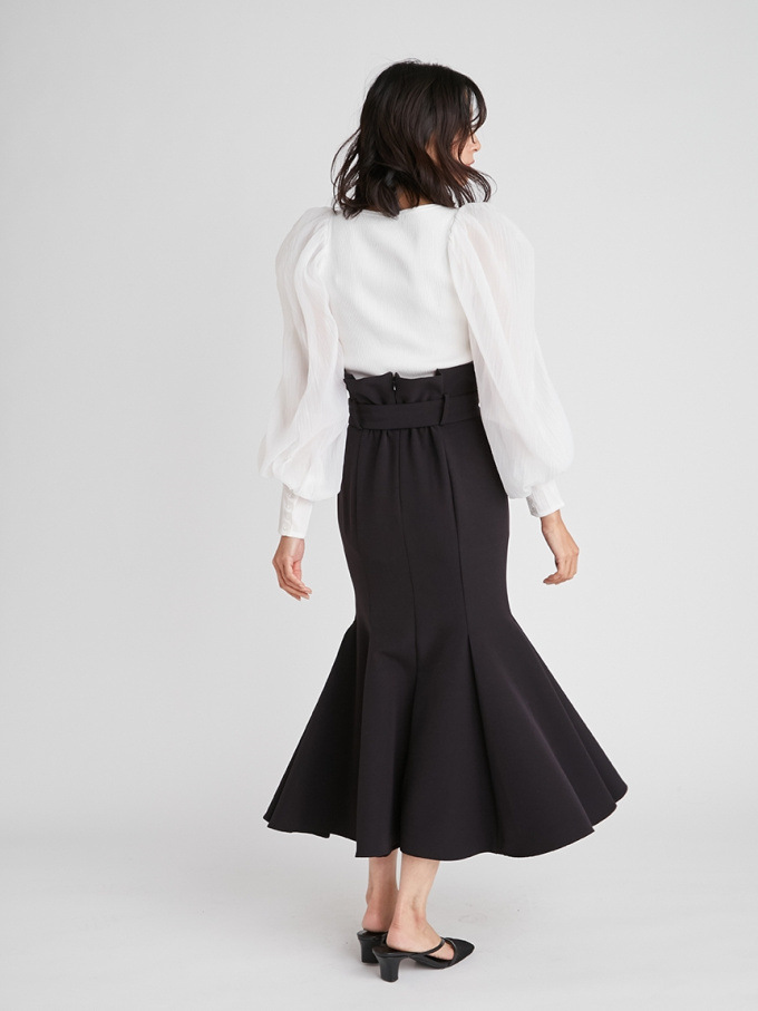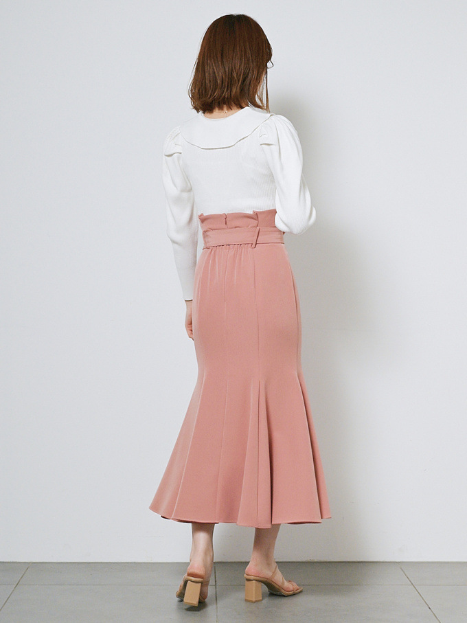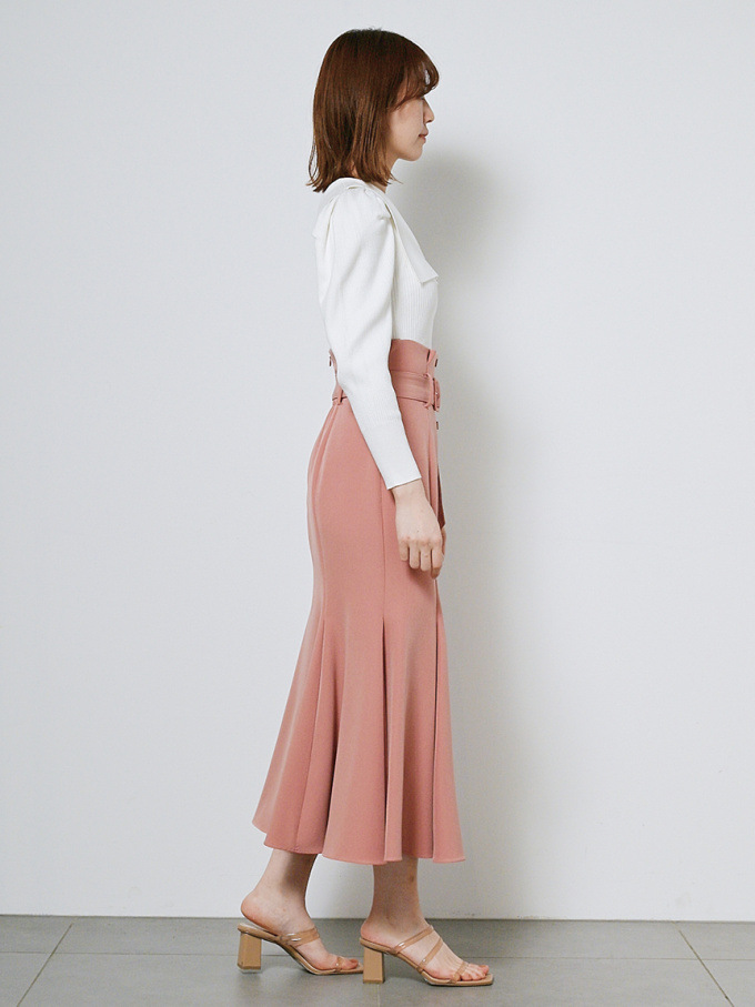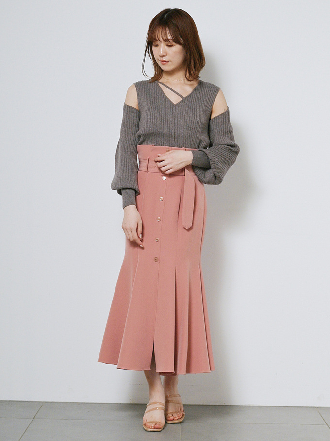 女性らしいラインを綺麗に魅せる美しいマーメイドシルエットが印象的なスカート。フロントにあしらわれたボタンが縦のラインを強調し、スタイルアップ効果をさらに高めてくれます。付属のベルトでマークしたハイウエストデザインはトレンド感◎。後ろファスナーを備えているので簡単に着脱でき、穿き心地も快適です。