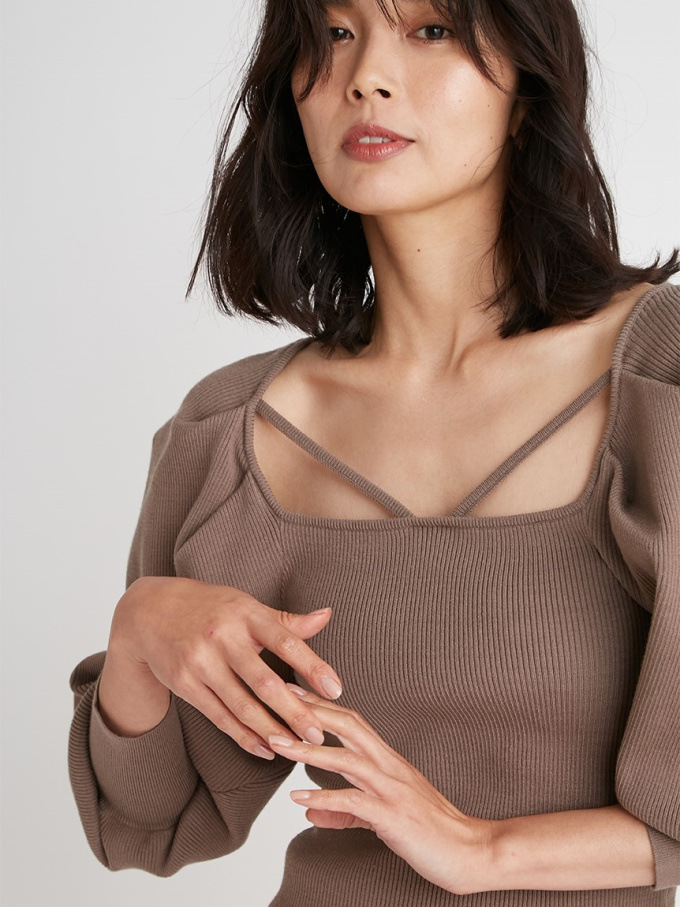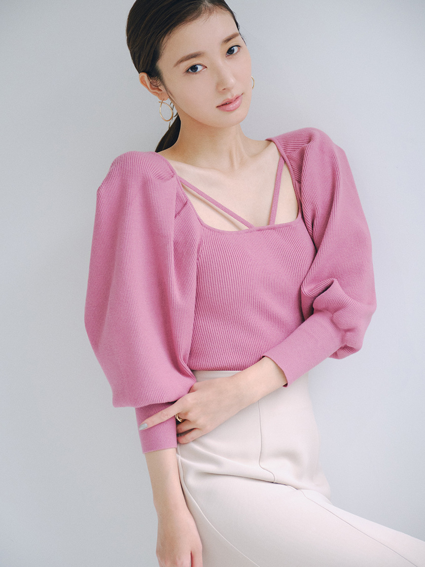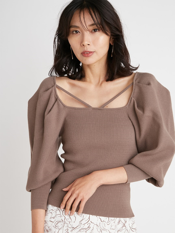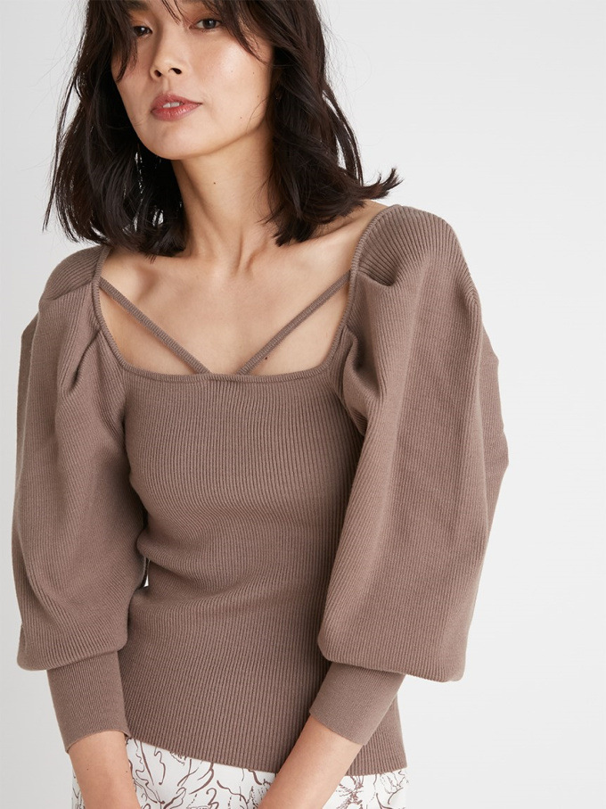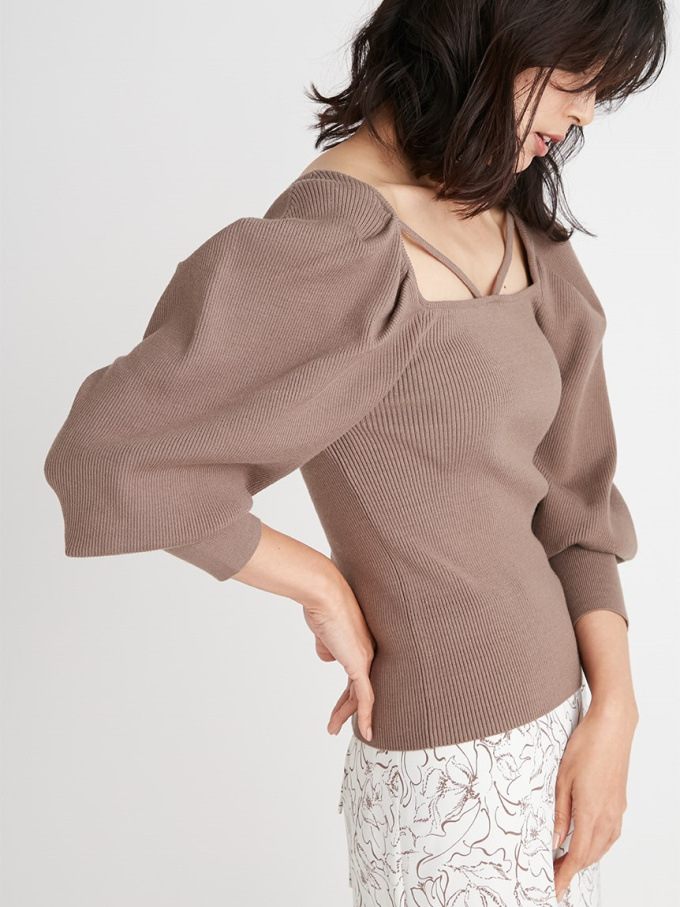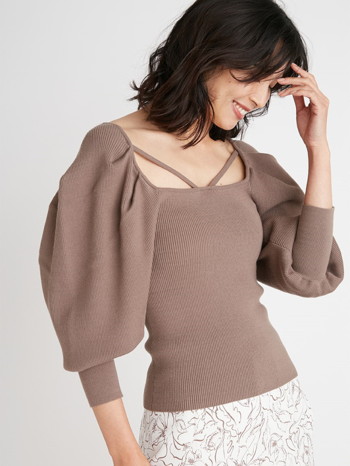 たっぷりとタックを効かせ丸みを持たせたボリュームスリーブが印象的な、レディムード溢れるニットプルオーバー。デコルテにあしらわれたセンシュアルなストラップでトレンド感をプラス。身頃部分はすっきりとしたラインに仕上げ、スタイルアップを狙えるメリハリシルエットをメイクしています。パンツともスカートともバランス良く決まり、着まわしやすいのも嬉しい。