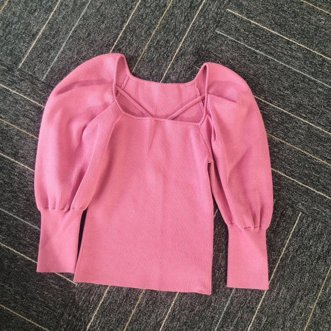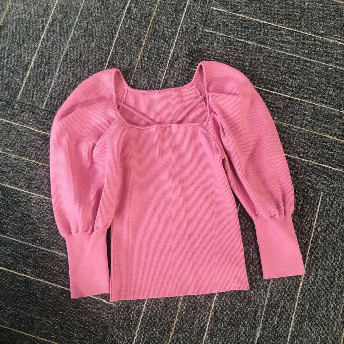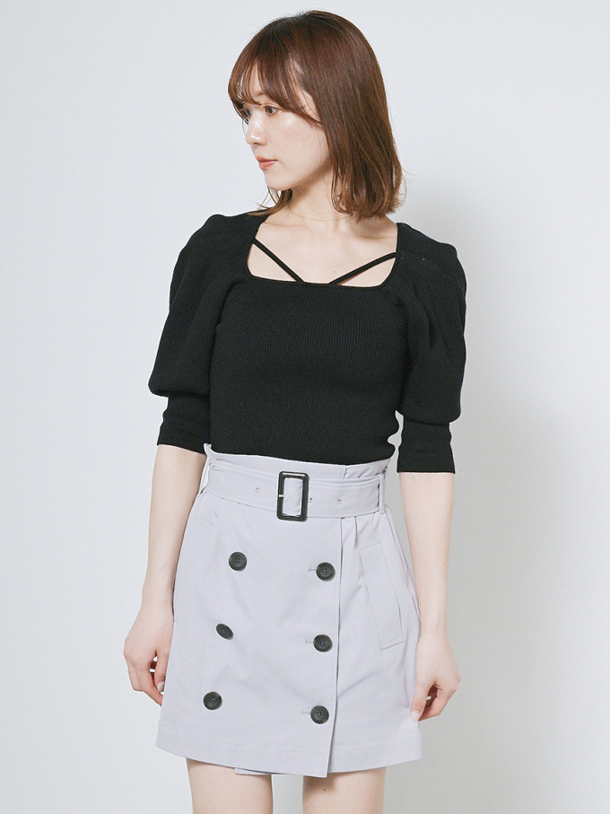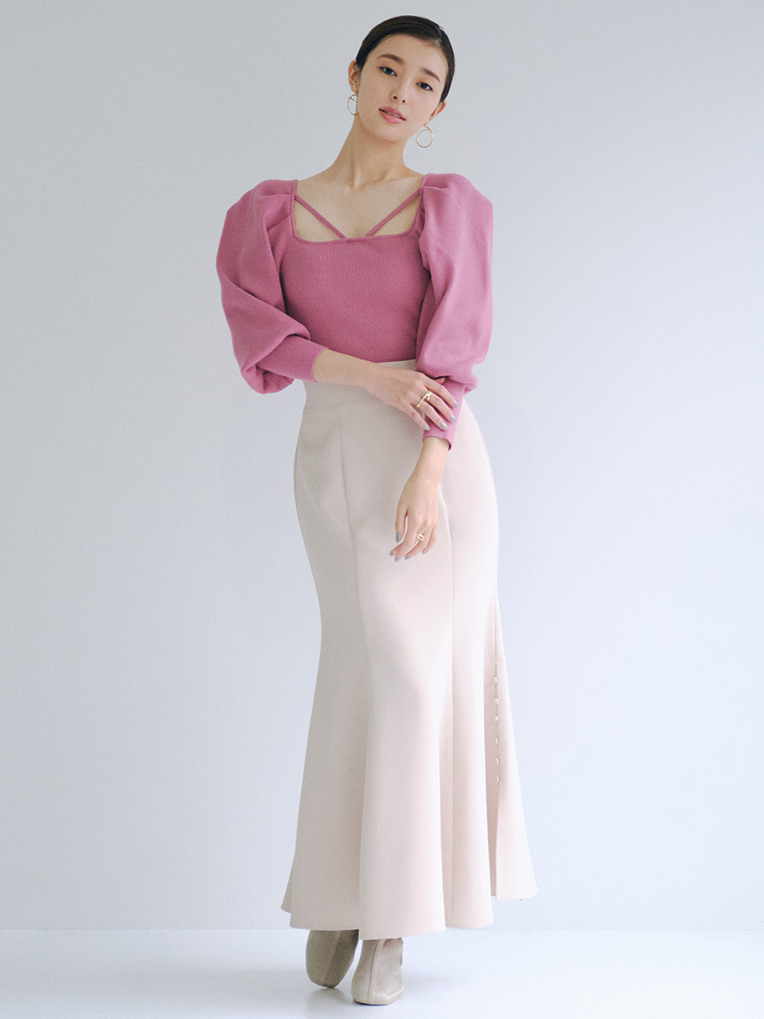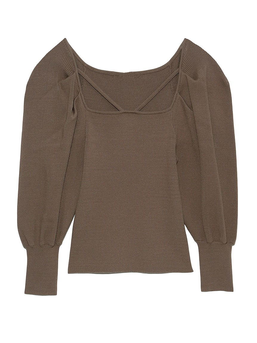 たっぷりとタックを効かせ丸みを持たせたボリュームスリーブが印象的な、レディムード溢れるニットプルオーバー。デコルテにあしらわれたセンシュアルなストラップでトレンド感をプラス。身頃部分はすっきりとしたラインに仕上げ、スタイルアップを狙えるメリハリシルエットをメイクしています。パンツともスカートともバランス良く決まり、着まわしやすいのも嬉しい。