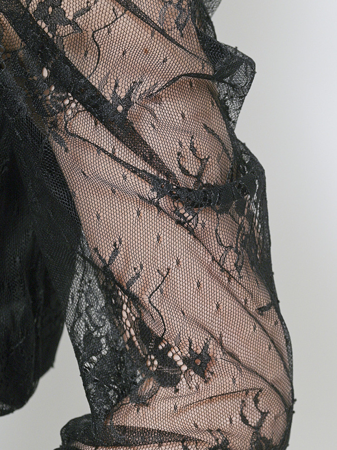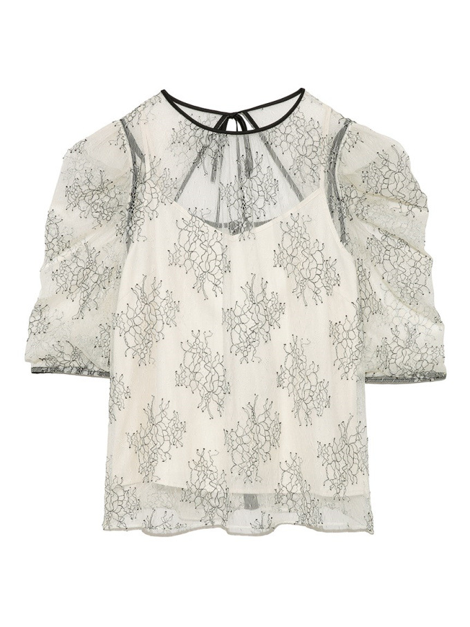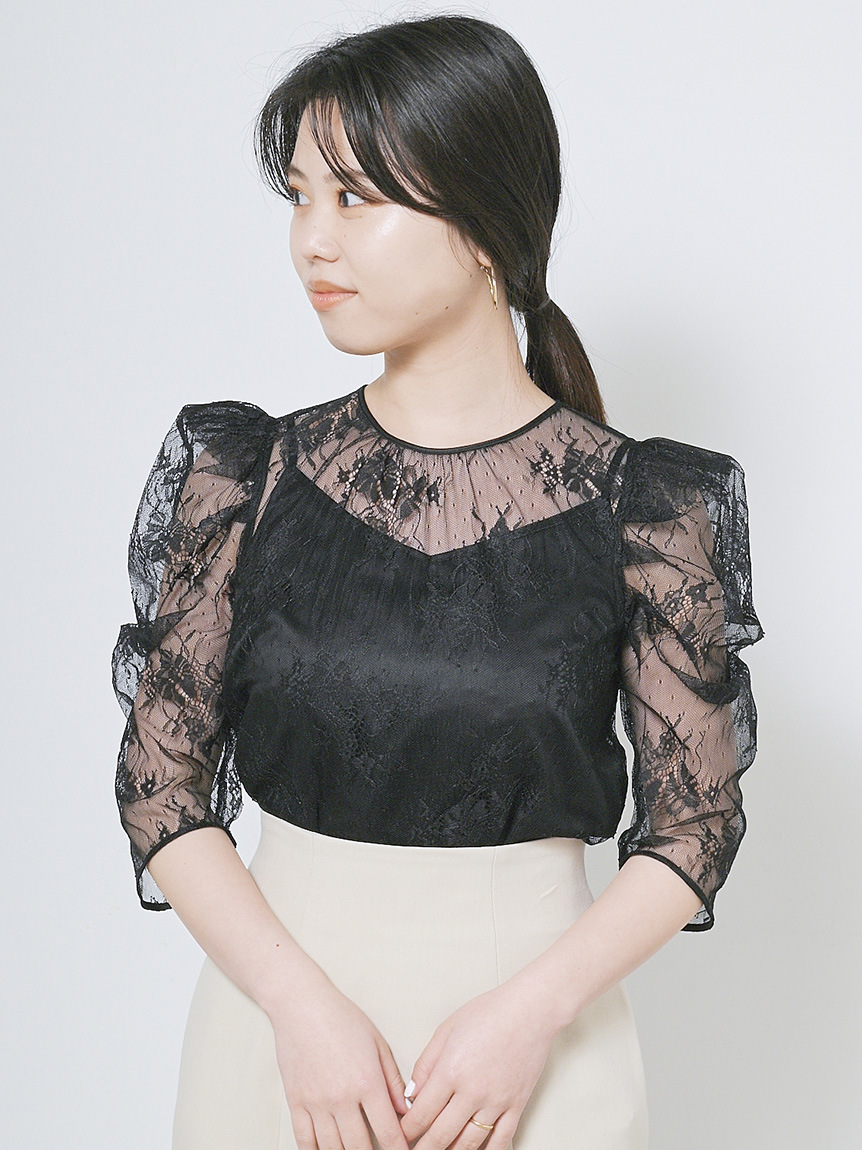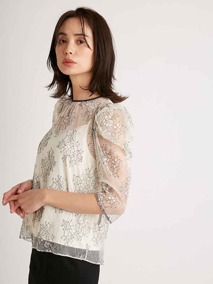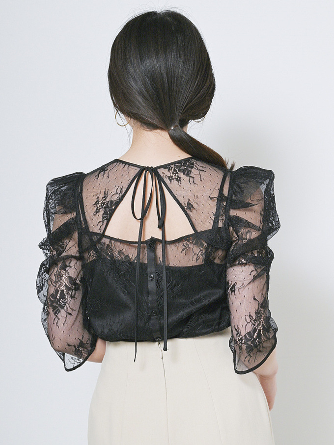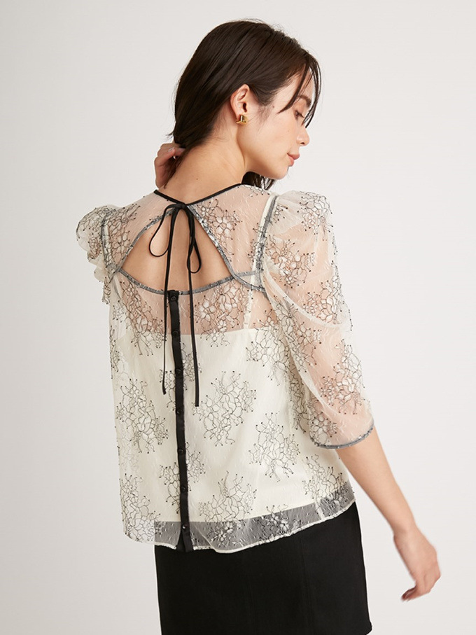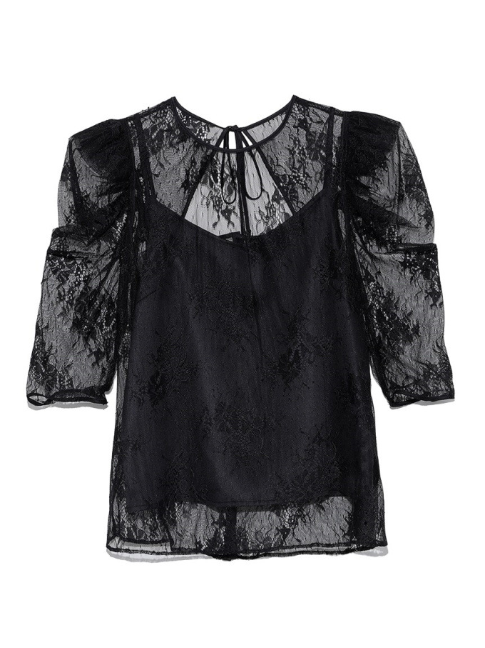 シアーで繊細なレース素材を使用した、センシュアルな雰囲気のブラウス。袖はタックとギャザーを入れ、尖がっているようなトレンド感のあるパフスリーブに仕上げました。バックネックには大胆なカッティングを施し、大人レディな表情を演出。1枚で着るのはもちろん、レイヤードスタイルのインに重ねてちらりと覗かせれば今年らしさがぐっと高まります。