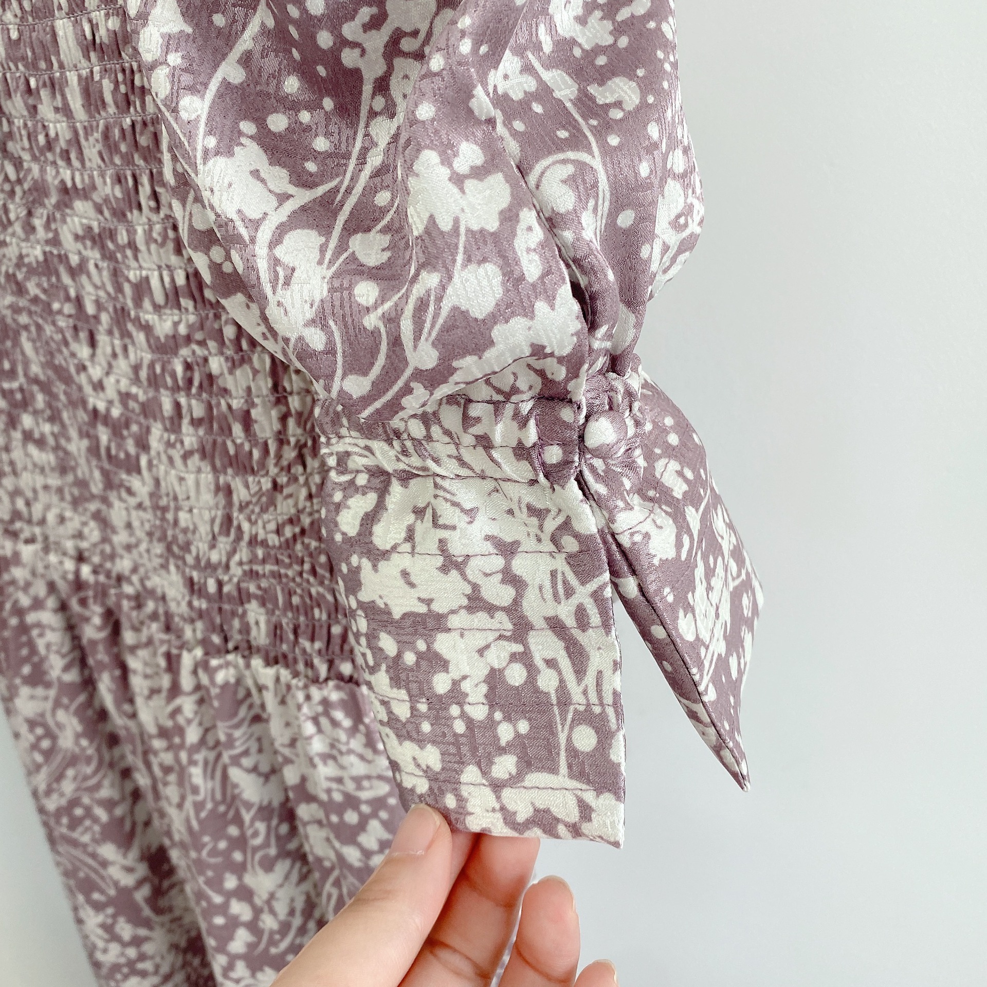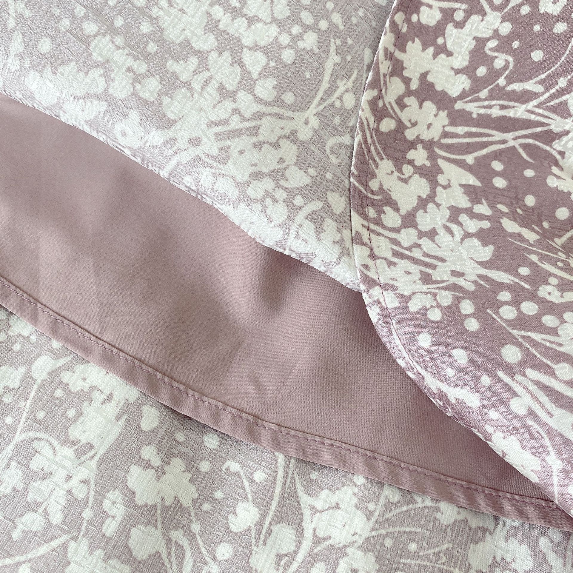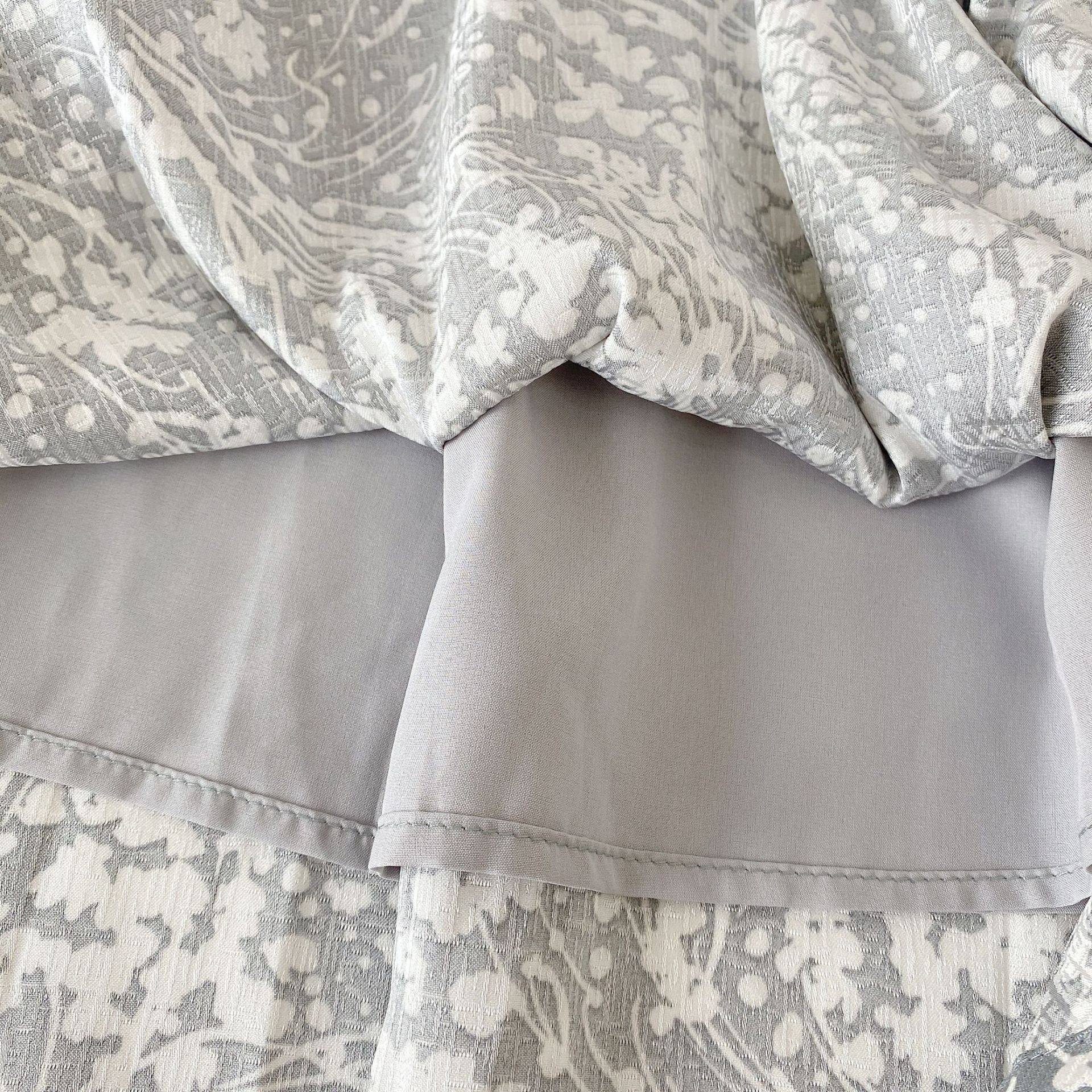 微光沢の繊細な模様のサテンジャガード生地に有機的なプリントを載せ、華やかに仕上げました。