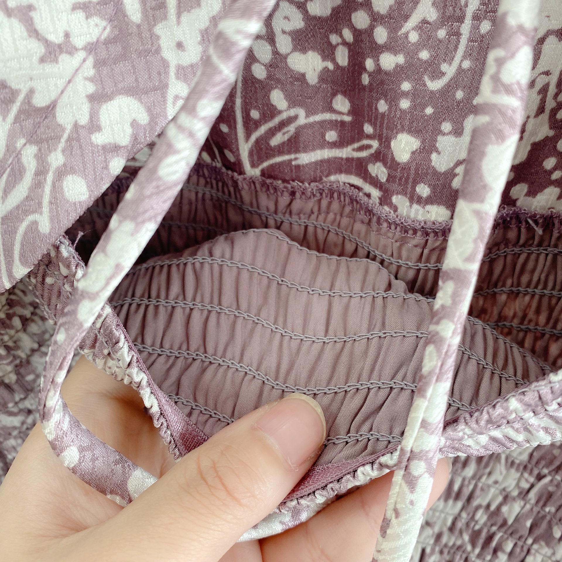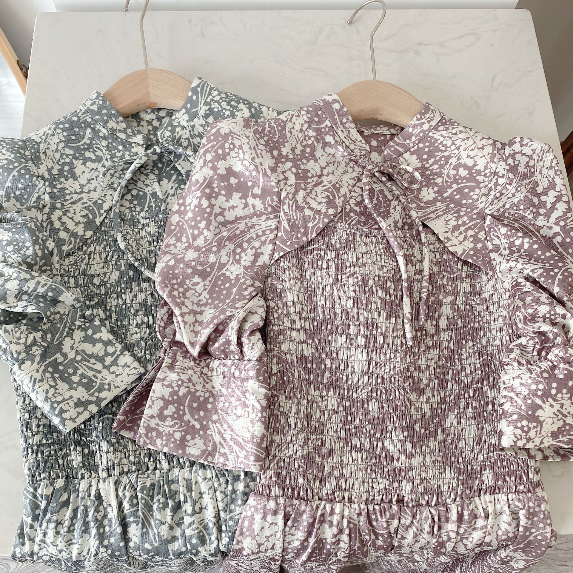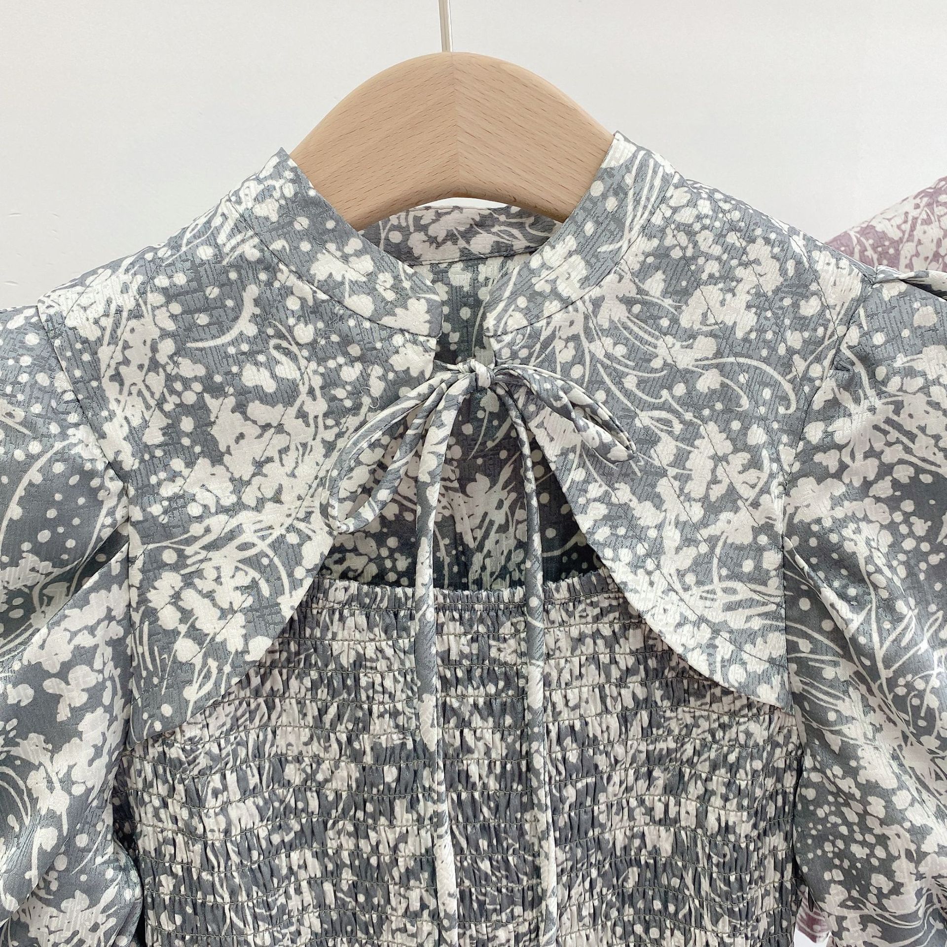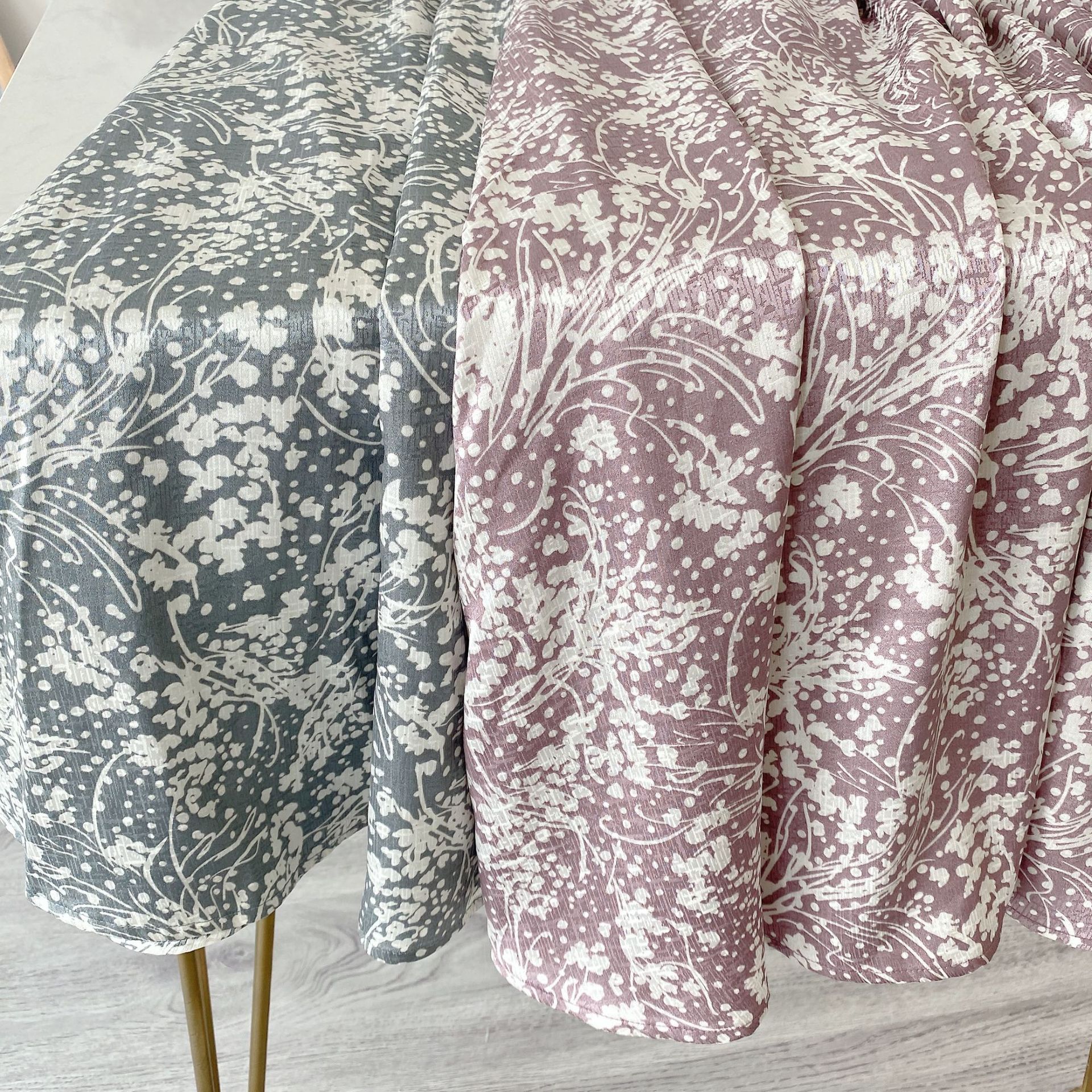 微光沢の繊細な模様のサテンジャガード生地に有機的なプリントを載せ、華やかに仕上げました。