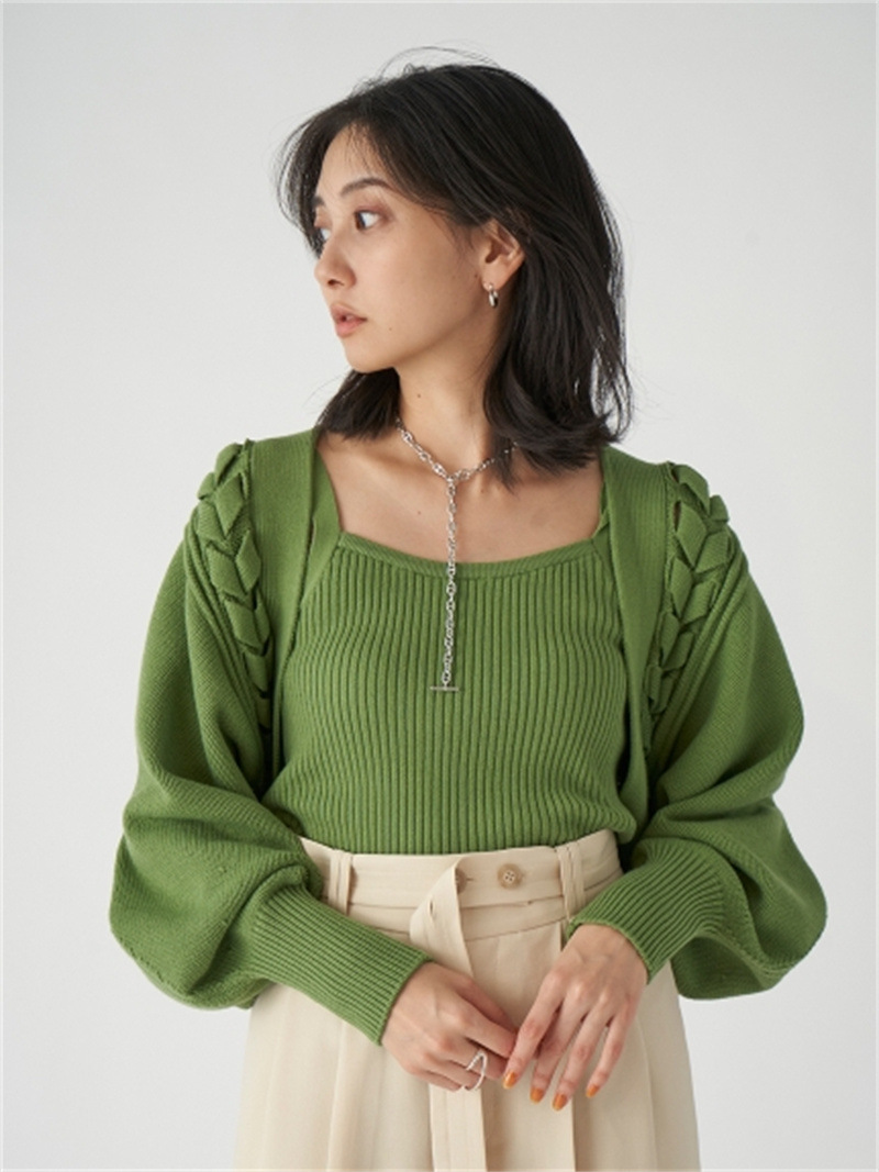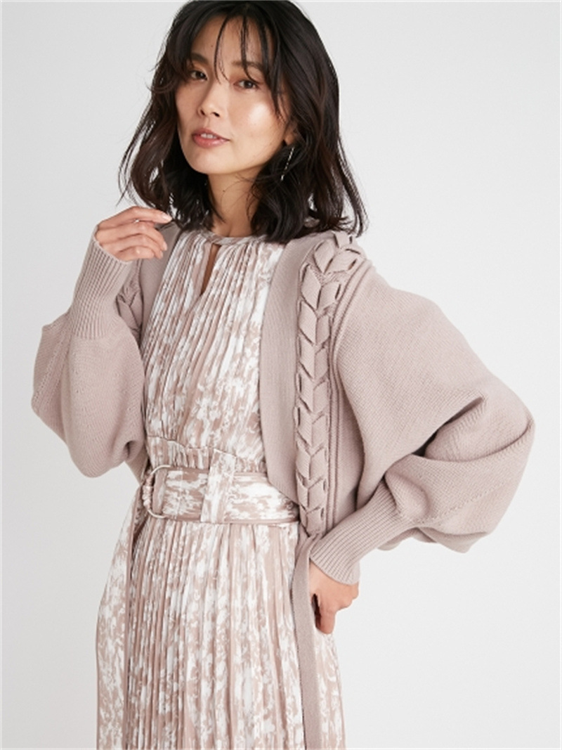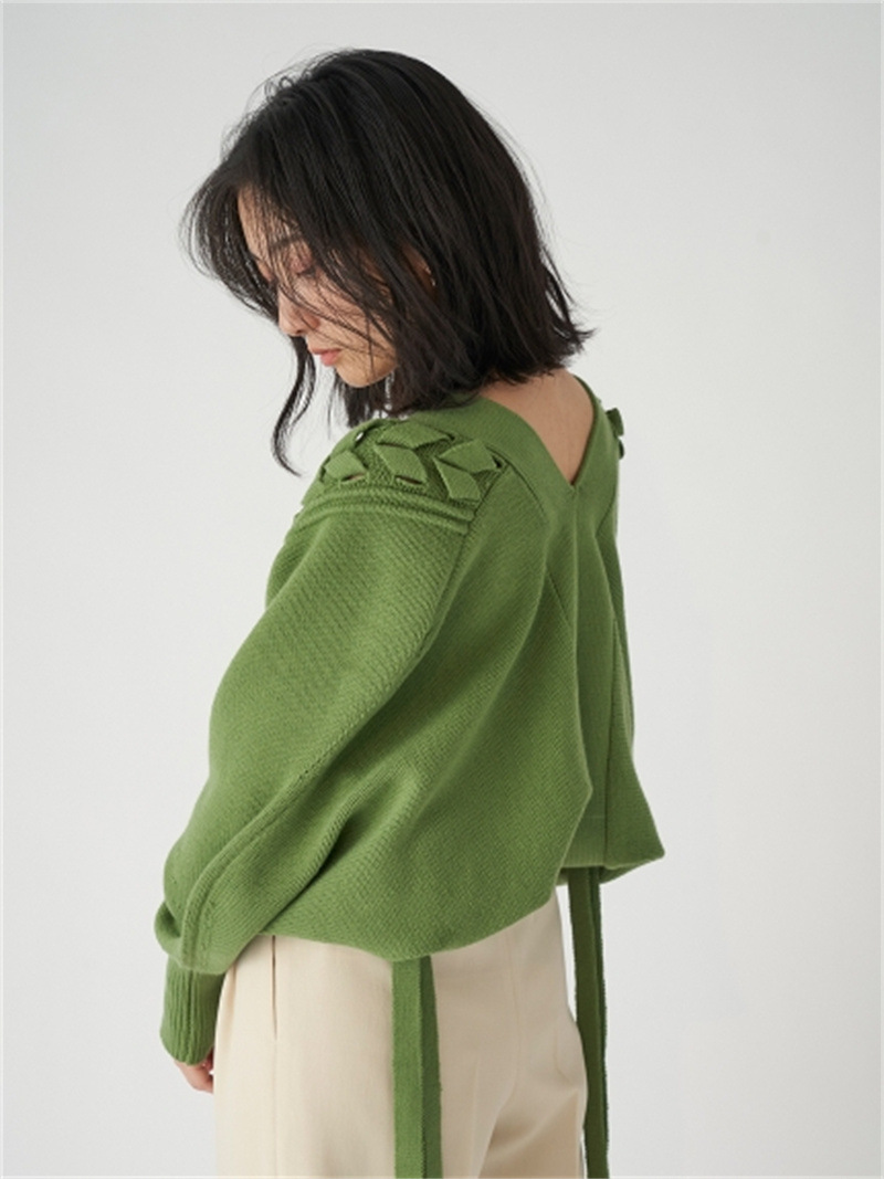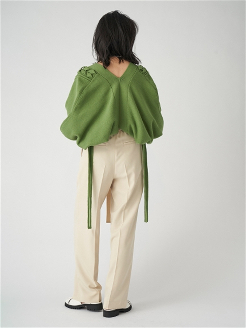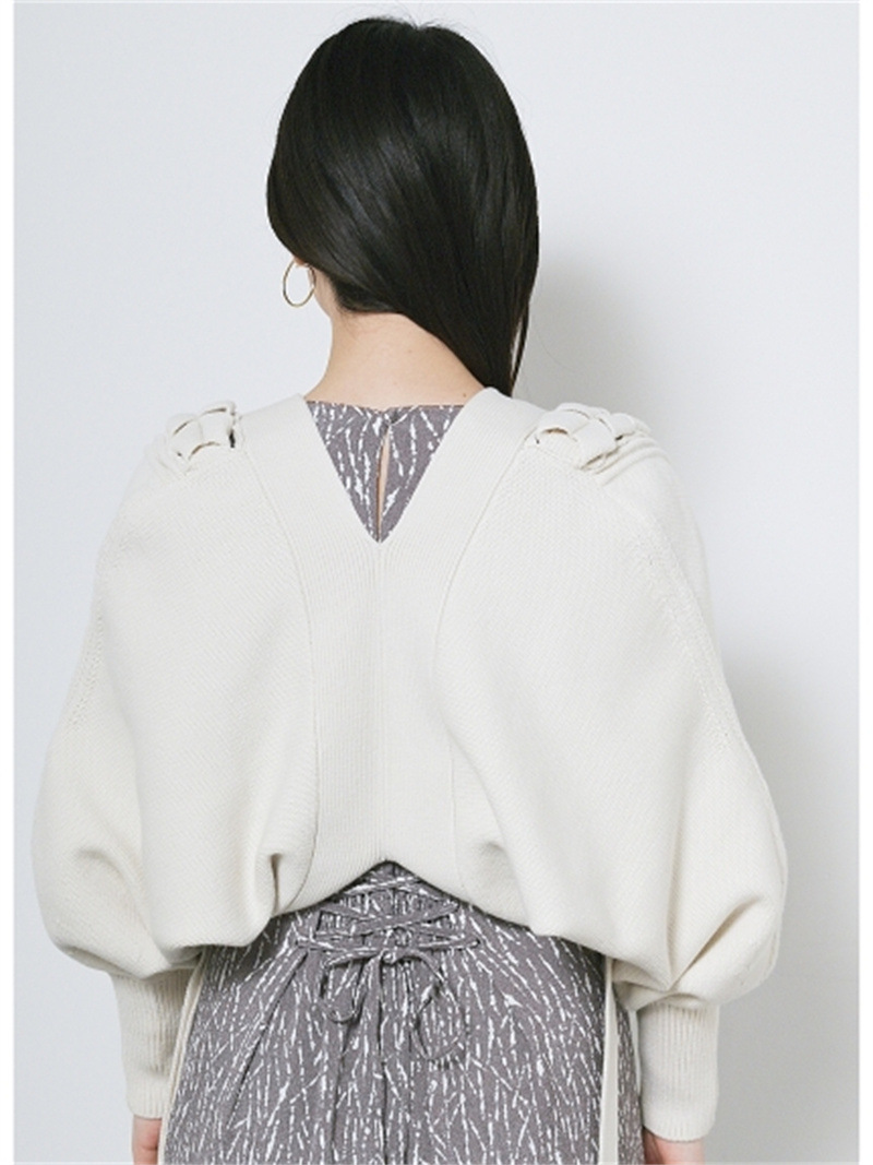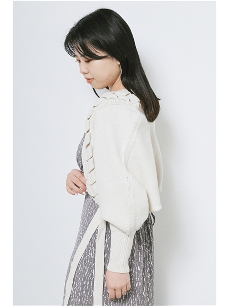 後ろに長く垂らしたレースアップデザインが特徴的。遊び心のあるユニークなディテールでモードに仕上げたボレロカーディガン。アーム部分をすっぽりと覆う丸みのあるシルエットが女性らしさを高める秘訣。ボリュームがありながらも絶妙な丈感に仕立てているので様々なボトムとバランスが取りやすく、インには同素材を用いたキャミソール(SWNT221190)を合わせるのもオススメです。