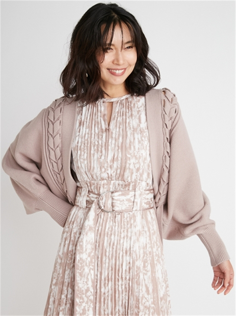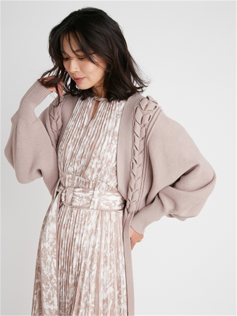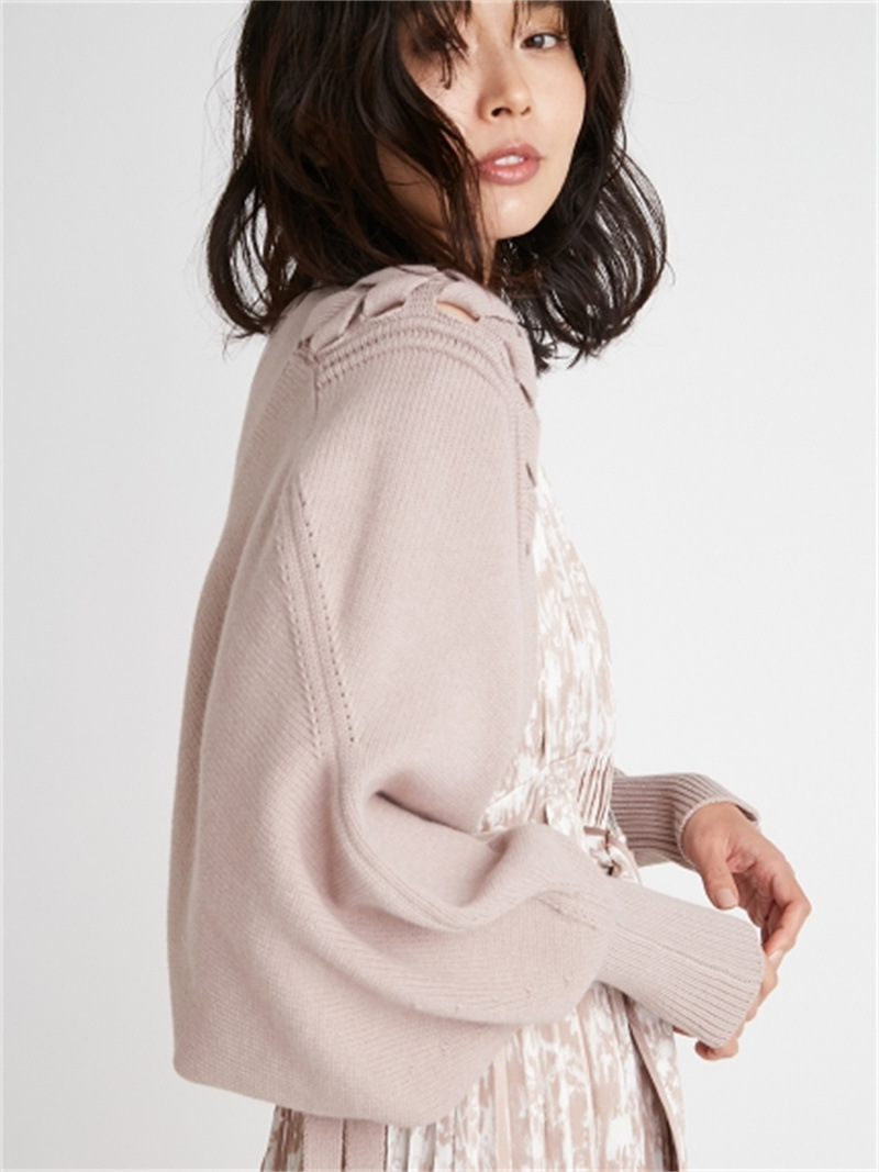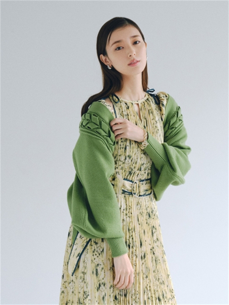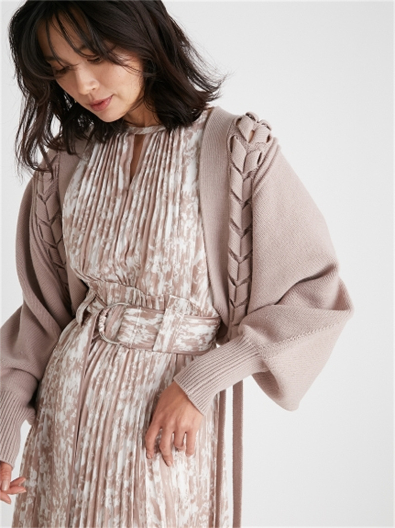 後ろに長く垂らしたレースアップデザインが特徴的。遊び心のあるユニークなディテールでモードに仕上げたボレロカーディガン。アーム部分をすっぽりと覆う丸みのあるシルエットが女性らしさを高める秘訣。ボリュームがありながらも絶妙な丈感に仕立てているので様々なボトムとバランスが取りやすく、インには同素材を用いたキャミソール(SWNT221190)を合わせるのもオススメです。