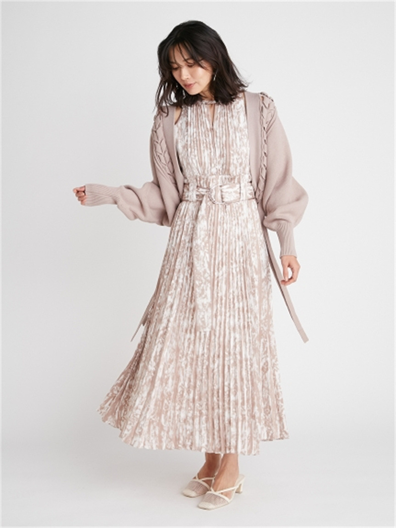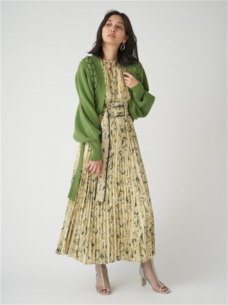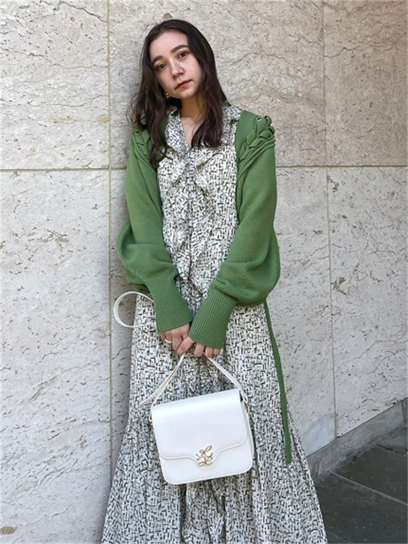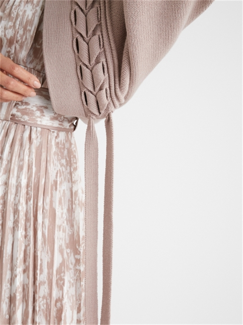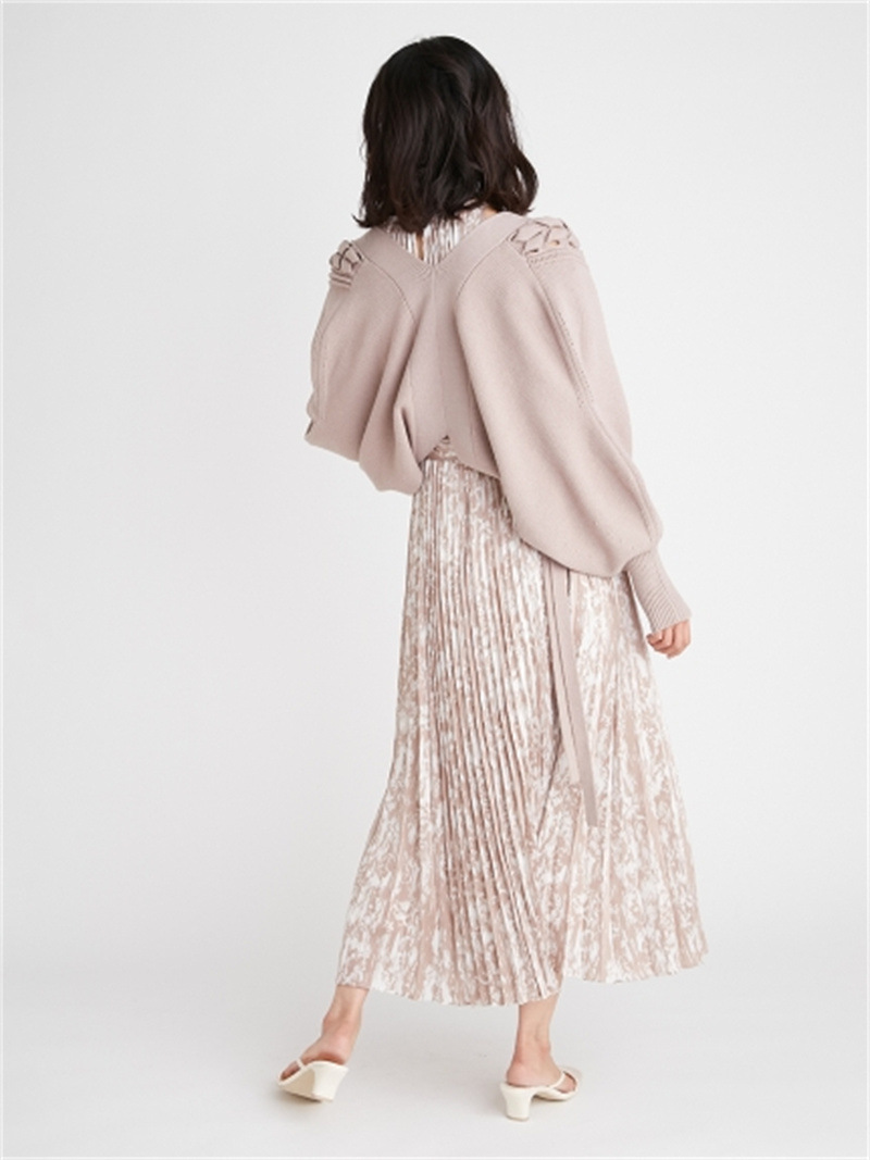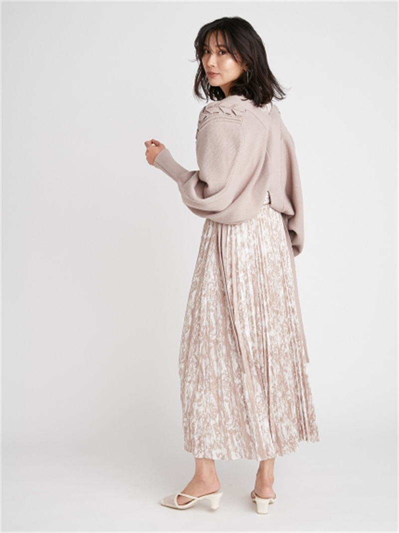 後ろに長く垂らしたレースアップデザインが特徴的。遊び心のあるユニークなディテールでモードに仕上げたボレロカーディガン。アーム部分をすっぽりと覆う丸みのあるシルエットが女性らしさを高める秘訣。ボリュームがありながらも絶妙な丈感に仕立てているので様々なボトムとバランスが取りやすく、インには同素材を用いたキャミソール(SWNT221190)を合わせるのもオススメです。