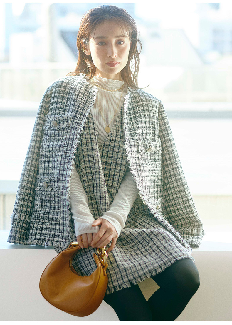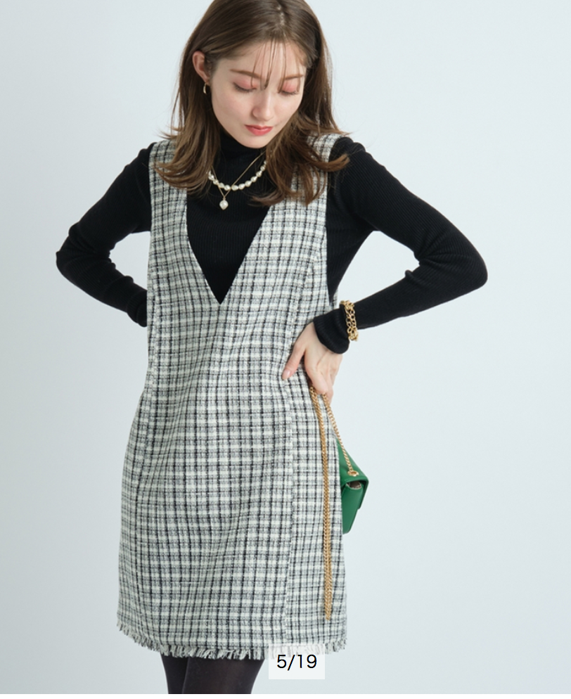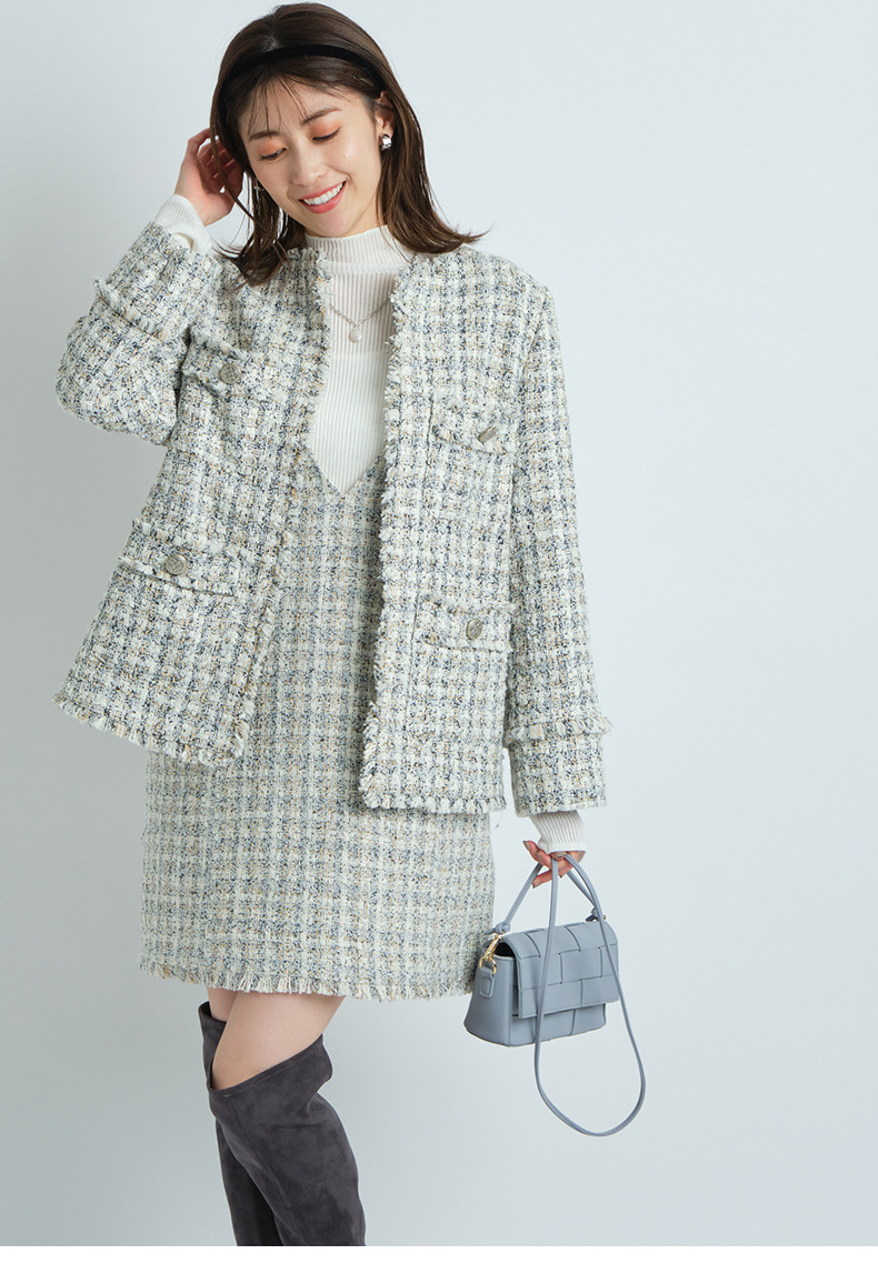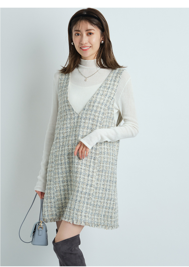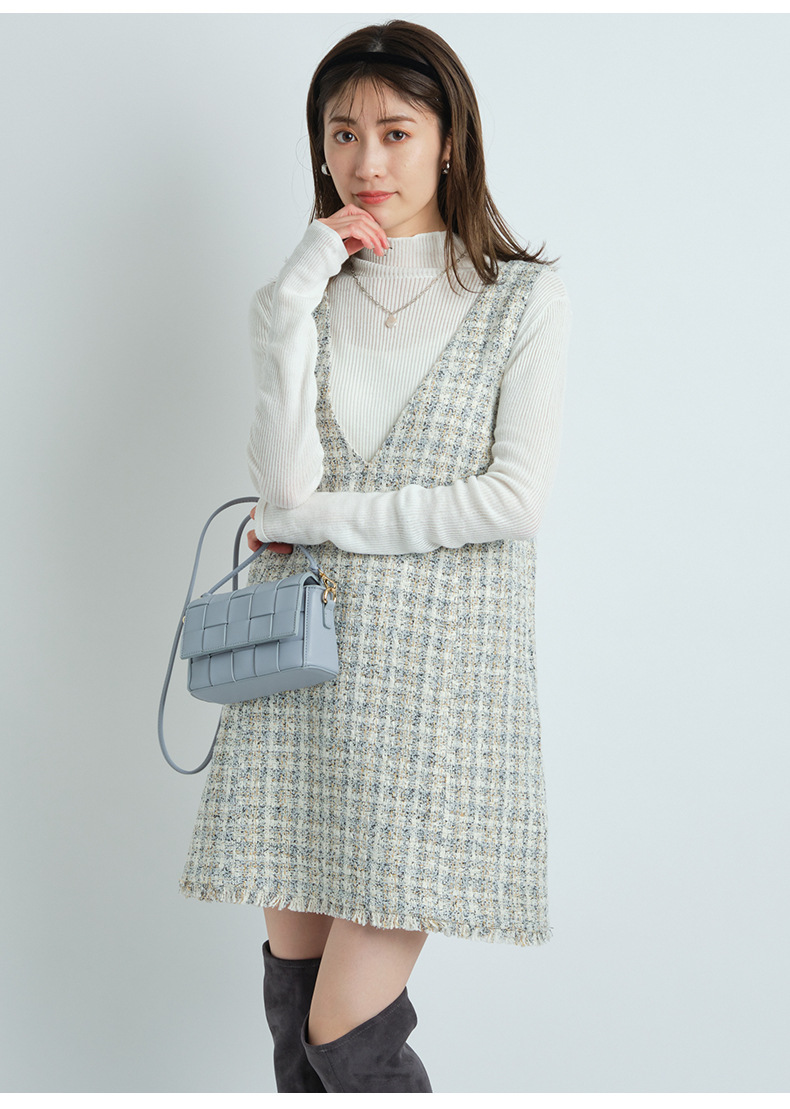 多色使いと立体感のあるツイード生地で、華やかな印象に仕上げたジャンパースカート。