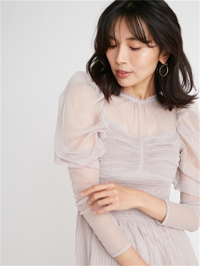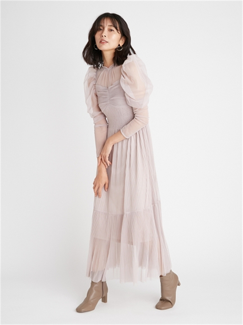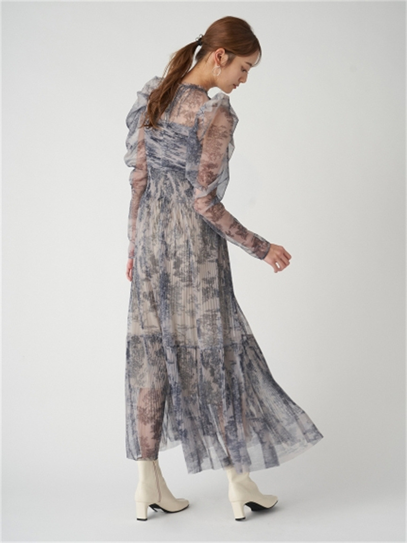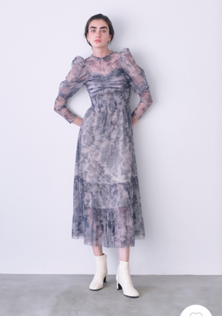 シアーなチュール素材を用いた人気のワンピースが登場。今季は春らしいカラーに加え、エレガントなトワルドジュイ柄を揃えました。巧みなプリーツの切り替え&ゴムシャーリングで表情豊かな仕上がりに。立体的な丸みを持たせたボリュームスリーブは女性らしさを高めるうえに、ボディを華奢に見せてくれます。ハイウエストの位置から裾に向かってひらりと広がるフレアシルエットで、スタイルアップ効果も◎。