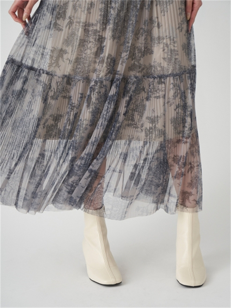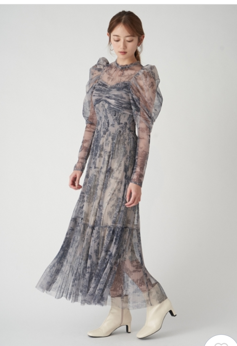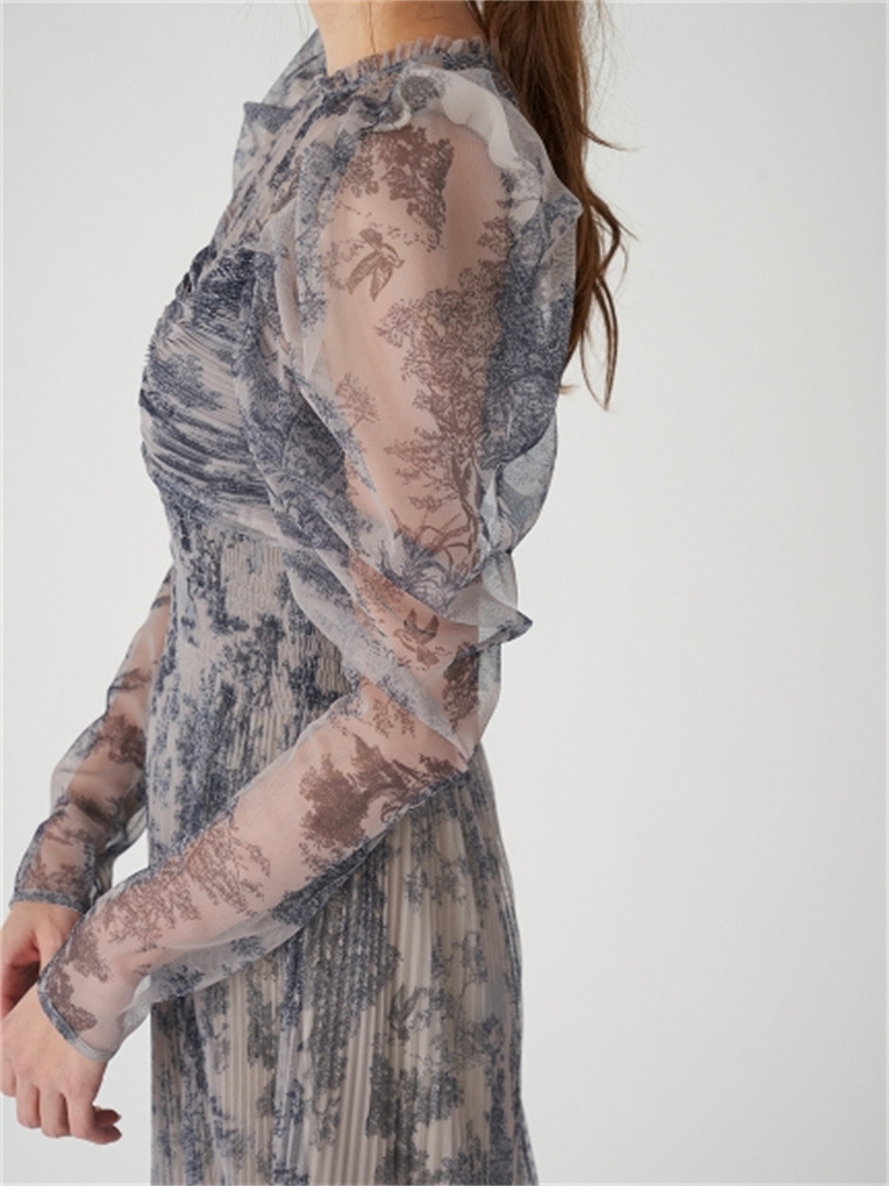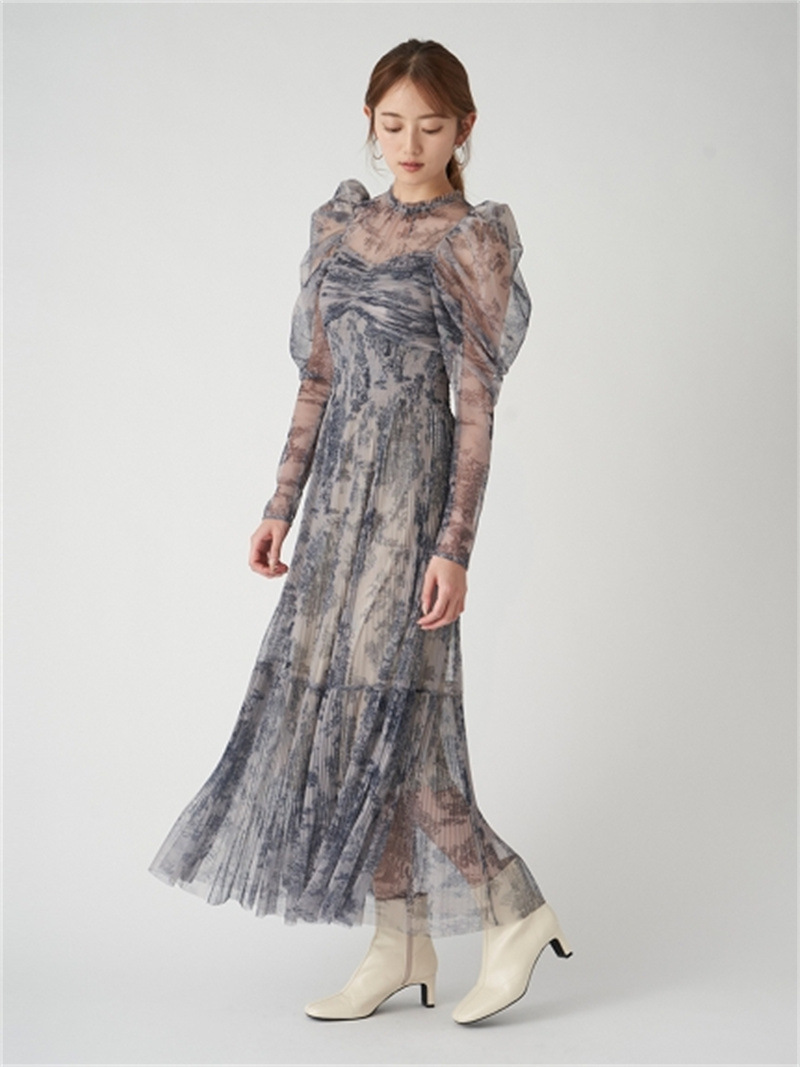 シアーなチュール素材を用いた人気のワンピースが登場。今季は春らしいカラーに加え、エレガントなトワルドジュイ柄を揃えました。巧みなプリーツの切り替え&ゴムシャーリングで表情豊かな仕上がりに。立体的な丸みを持たせたボリュームスリーブは女性らしさを高めるうえに、ボディを華奢に見せてくれます。ハイウエストの位置から裾に向かってひらりと広がるフレアシルエットで、スタイルアップ効果も◎。