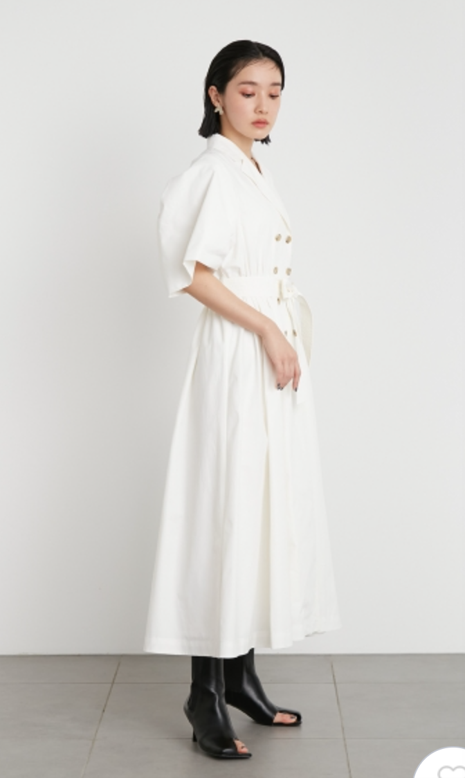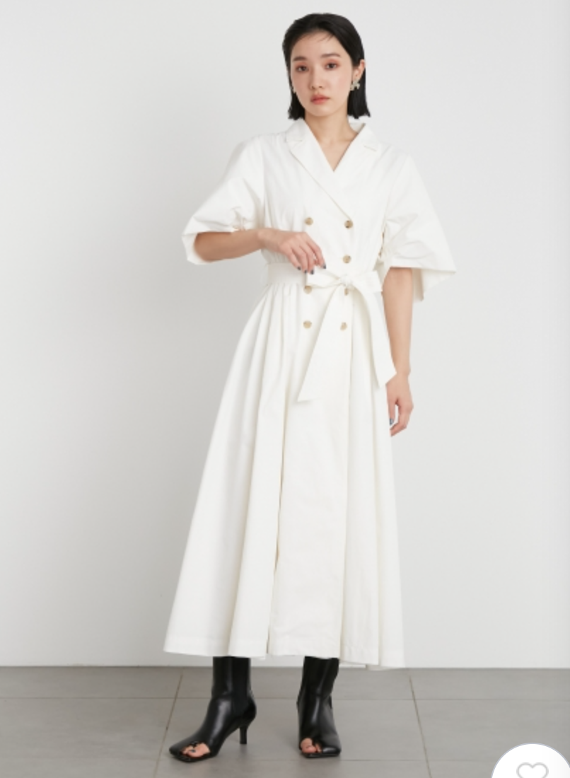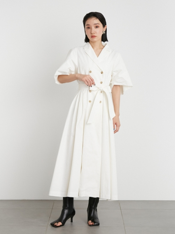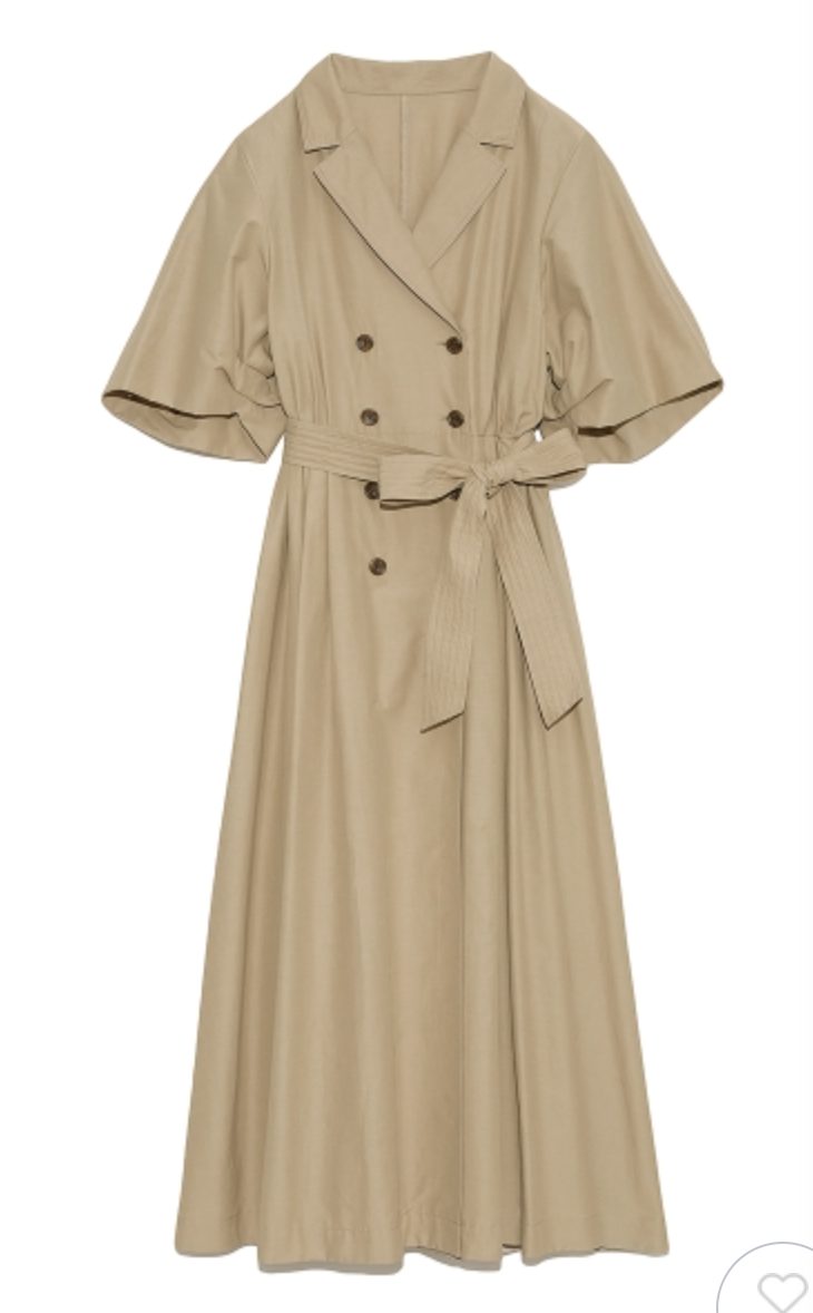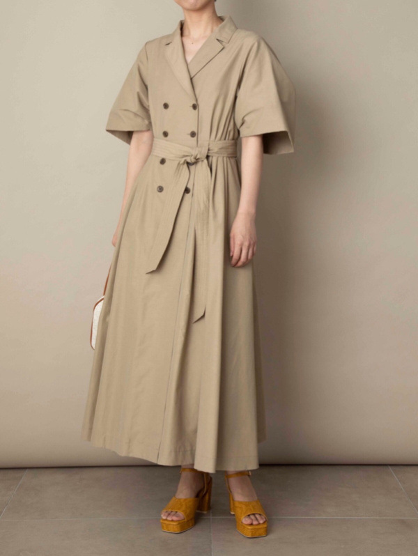 60‘sの映画で女優が着ているようなトレンチコートのディテールからオマージュしてワンピースに落とし込んだこだわりの1着。王道クラシカルなルックスが着こなしを新鮮に魅せるワンピースが届きました。巧みなタックワークが光るボリュームスリーブを採用し構築的なフォルムをメイク。ウエストにゴムを効かせることでメリハリ感をプラスし、着心地の良さもをキープしています。共地のベルトでウエストをマークしたレディなスタイリングがオススメ。