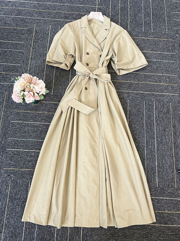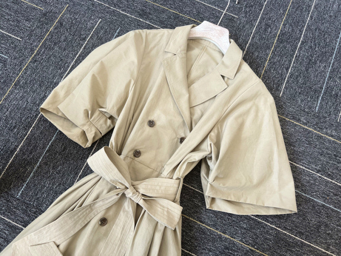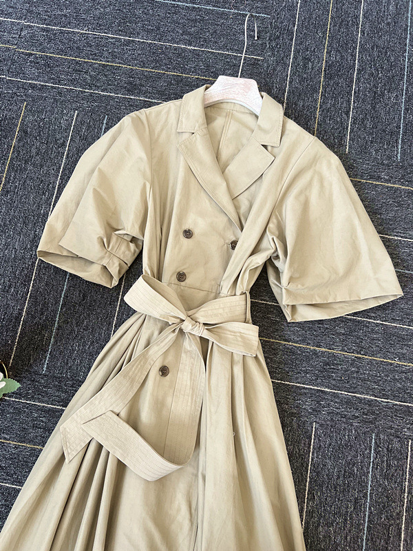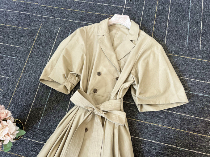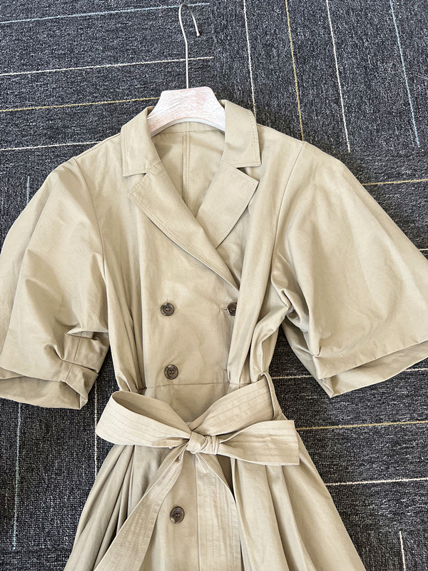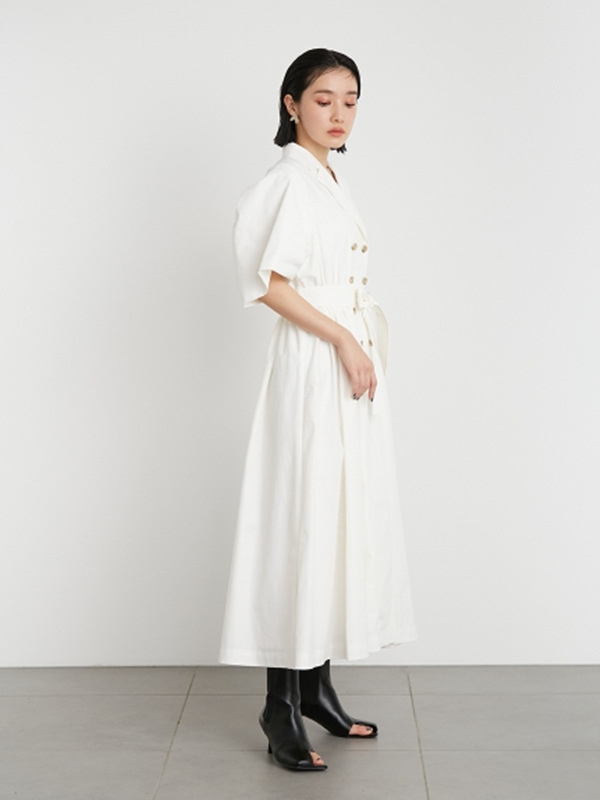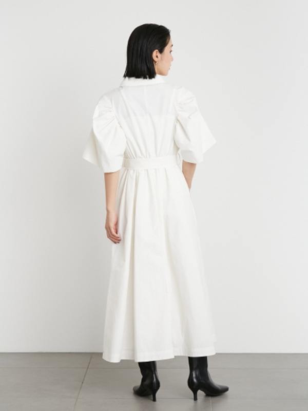 60‘sの映画で女優が着ているようなトレンチコートのディテールからオマージュしてワンピースに落とし込んだこだわりの1着。王道クラシカルなルックスが着こなしを新鮮に魅せるワンピースが届きました。巧みなタックワークが光るボリュームスリーブを採用し構築的なフォルムをメイク。ウエストにゴムを効かせることでメリハリ感をプラスし、着心地の良さもをキープしています。共地のベルトでウエストをマークしたレディなスタイリングがオススメ。