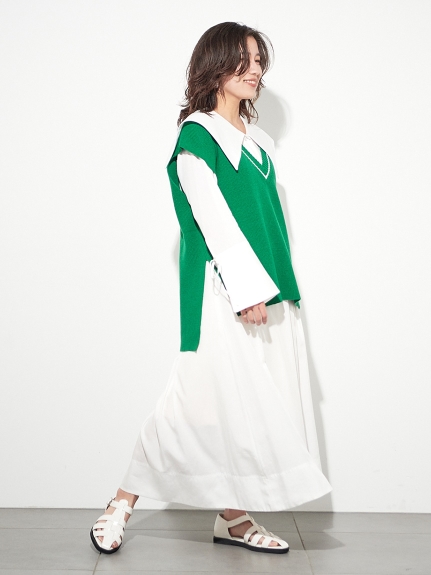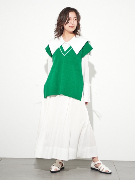 トレンド継続中のビッグカラーを取り入れた、クラシカルなワンピース。ピンタックやパイピングでヴィンテージ感のあるディテールをプラスし、トレンドの中にも個性が光るデザインに仕上げました。ハイウエストの位置に切り替えを入れたフレアシルエットは、リラックス感がありながらもすっきりと見えるように計算されています。ベルトやビスチェ、ベストなど、様々なアイテムでアレンジが楽しめ、カーディガンやジャケットから襟を出して着用しても愛らしくきまります。インナーキャミソール付き。