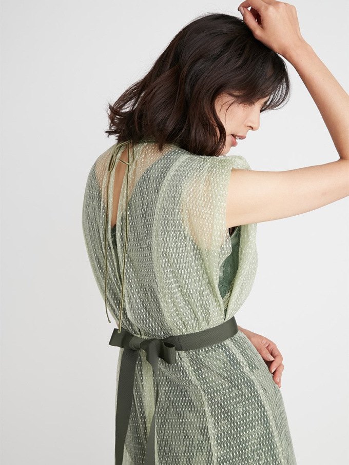 透明感のあるドットチュールと繊細なレース素材を使用しました。シックな雰囲気のグレー、春らしい印象のグリーン、フェミニンなニュアンスのラベンダーの3色でお届けします。