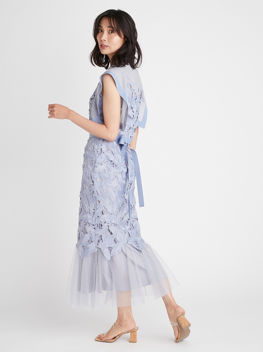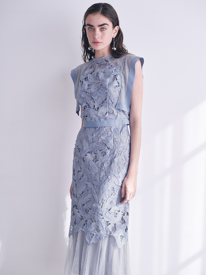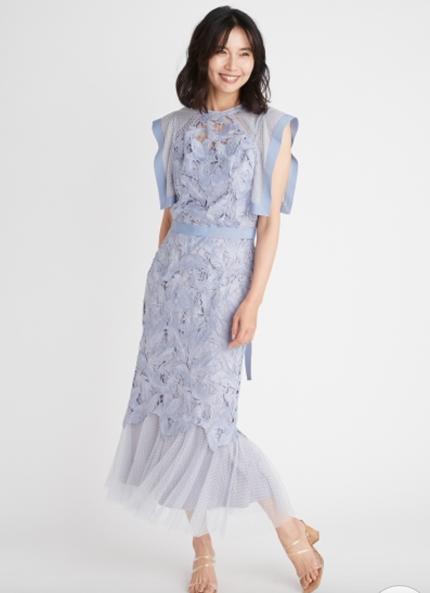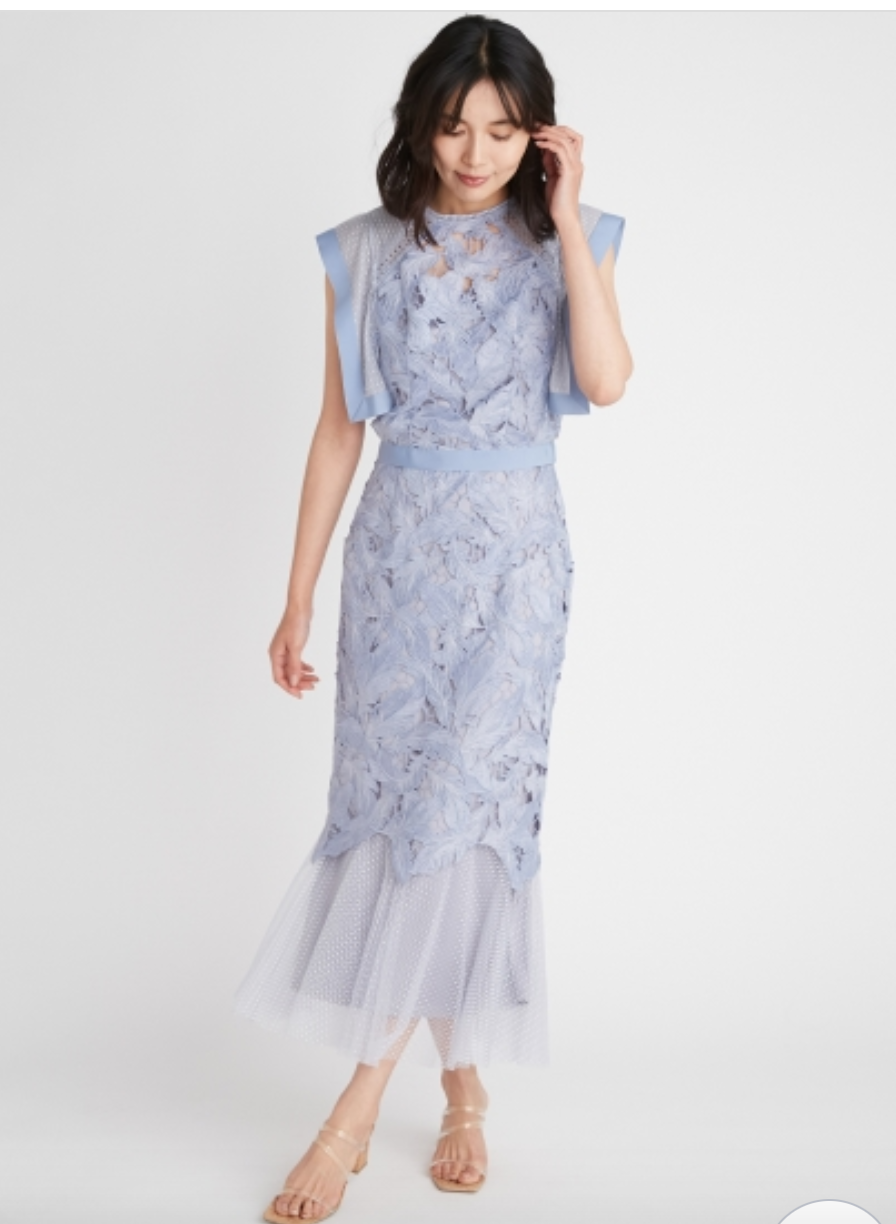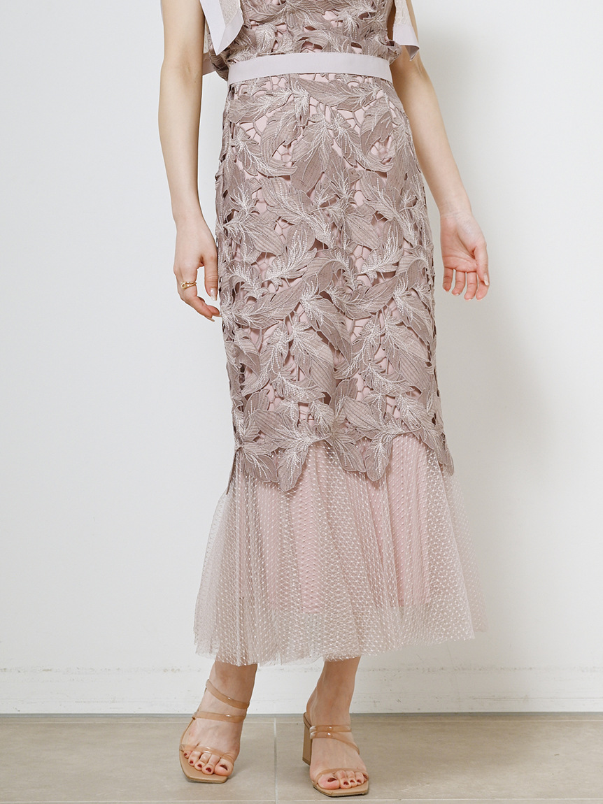 繊細なレース使いで人気を集める「SNIDEL」定番のスカートが登場。今シーズンはフェザーをモチーフにしたオリジナルレースで存在感たっぷりに仕上げました。裾部分はドットチュールで切り替え、軽やかさと華やかさをプラス。チュール部分にたっぷりとギャザーを入れたメリハリのあるシルエットは甘くなり過ぎず、品の良いスタイリングを叶えてくれます。ウエストはすっきりとしたデザインなのでトップスINでもアウトでも◎。同素材のトップス(SWFB221133)とセットアップでワンピース風に着こなすのもオススメです。