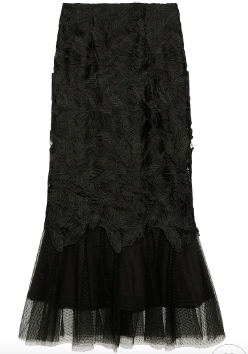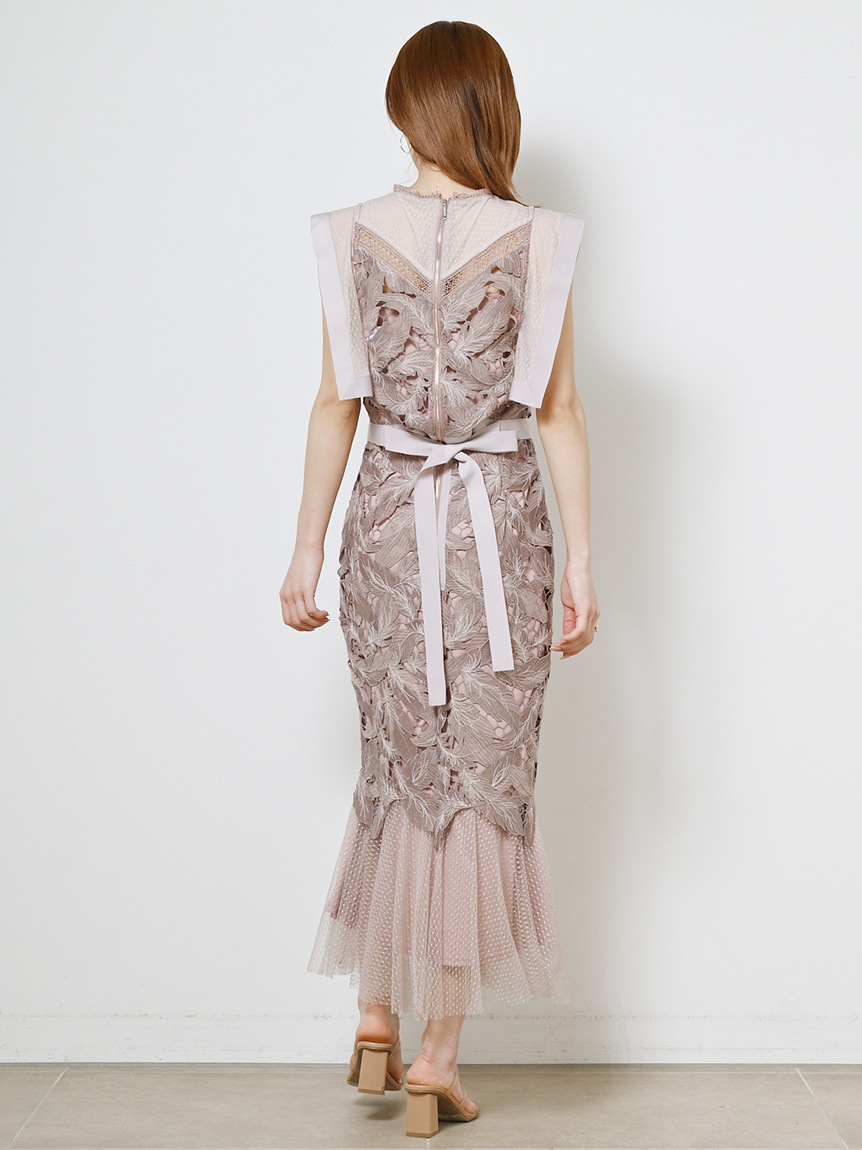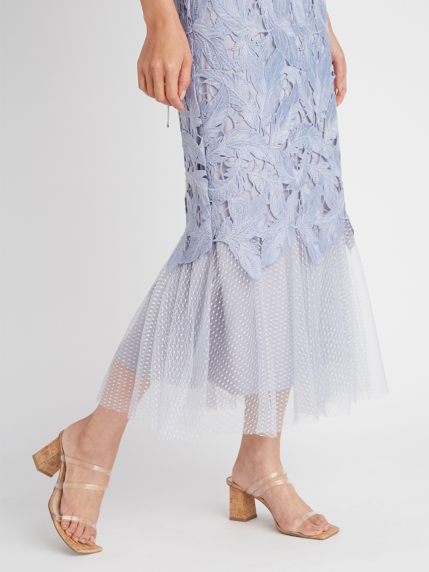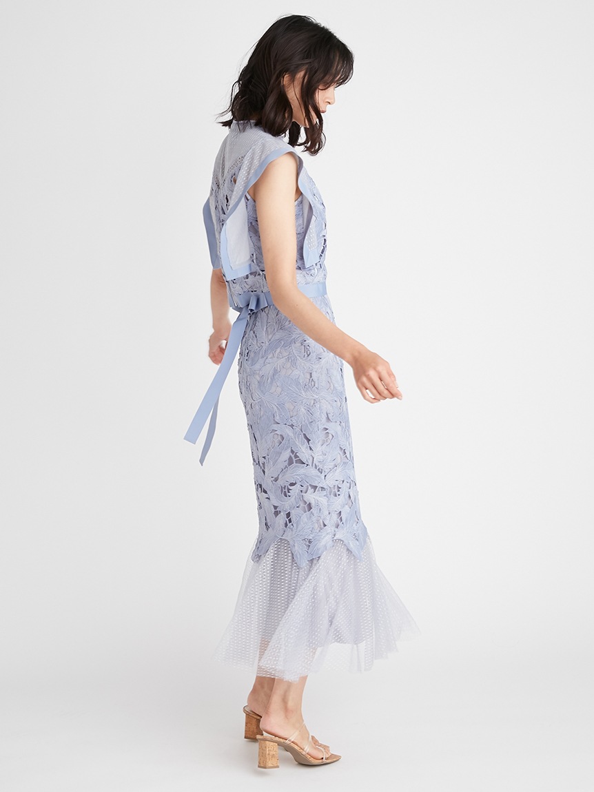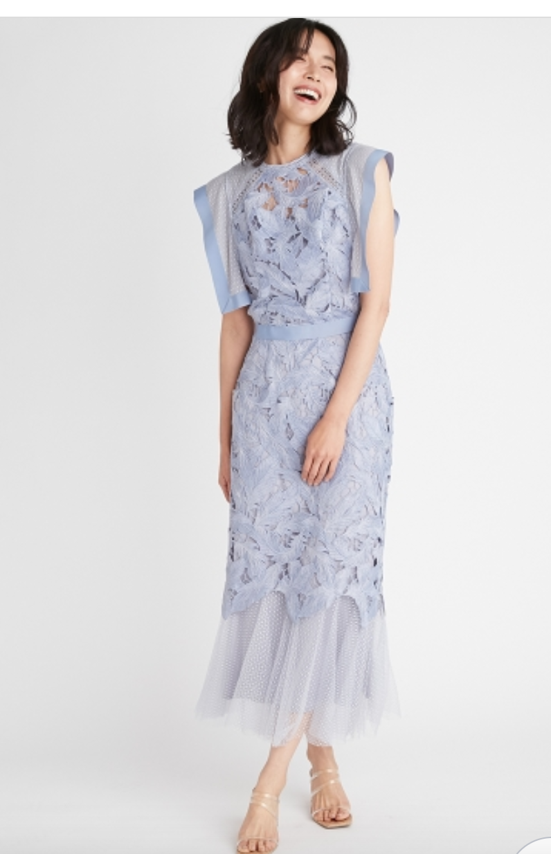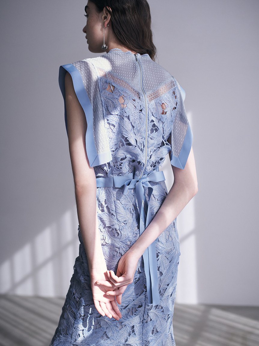 繊細なレース使いで人気を集める「SNIDEL」定番のスカートが登場。今シーズンはフェザーをモチーフにしたオリジナルレースで存在感たっぷりに仕上げました。裾部分はドットチュールで切り替え、軽やかさと華やかさをプラス。チュール部分にたっぷりとギャザーを入れたメリハリのあるシルエットは甘くなり過ぎず、品の良いスタイリングを叶えてくれます。ウエストはすっきりとしたデザインなのでトップスINでもアウトでも◎。同素材のトップス(SWFB221133)とセットアップでワンピース風に着こなすのもオススメです。