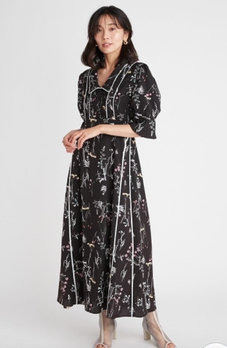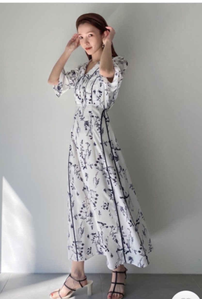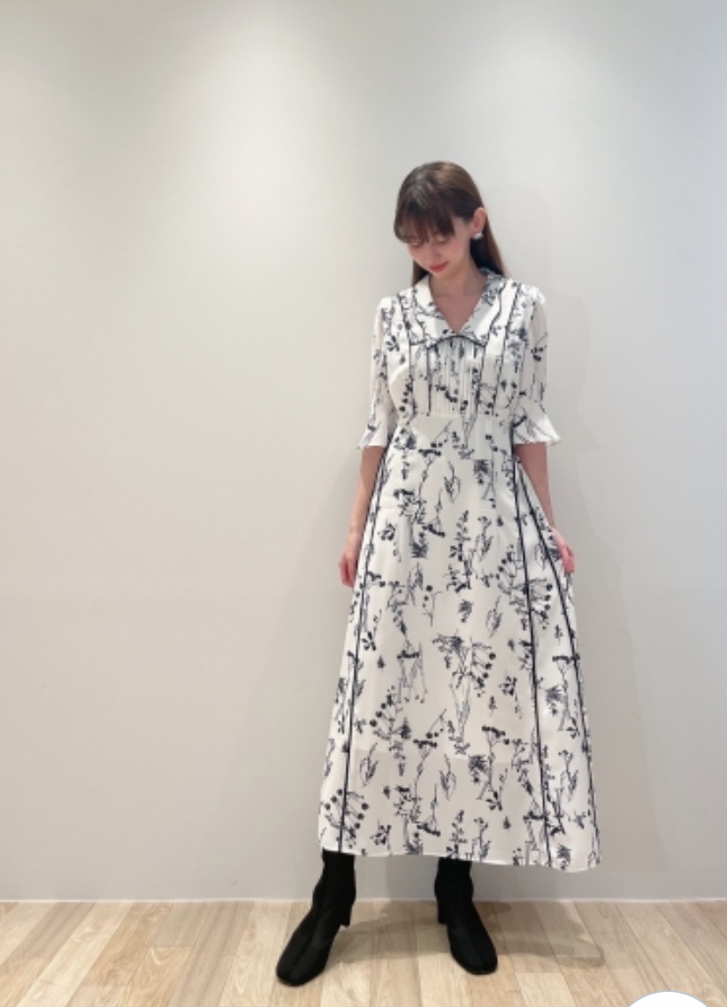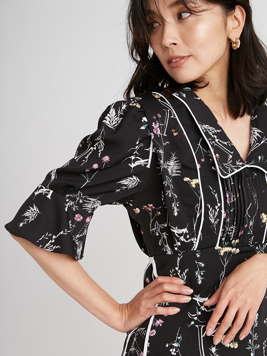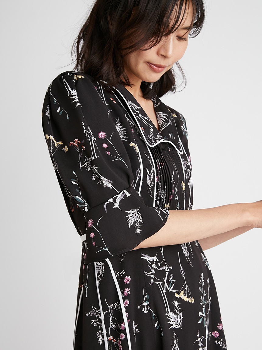 【こだわりのパイピングディテールが光るプリントワンピース】