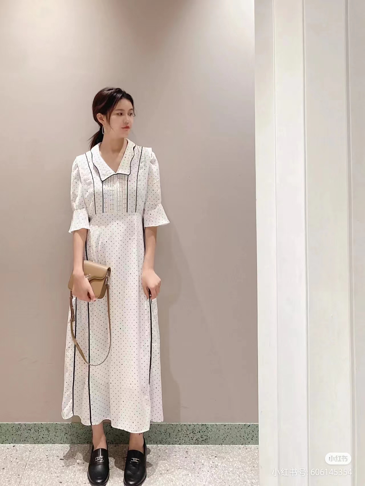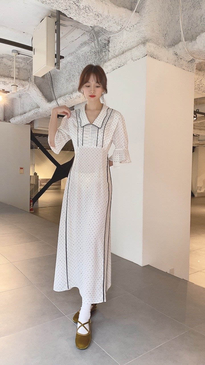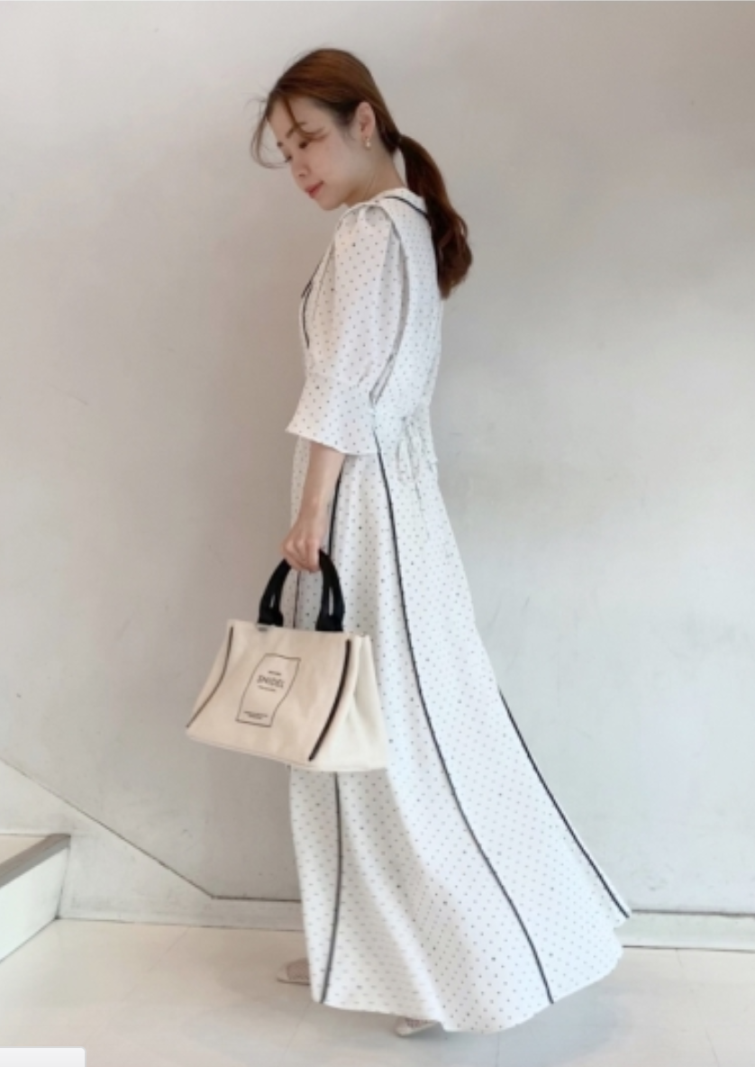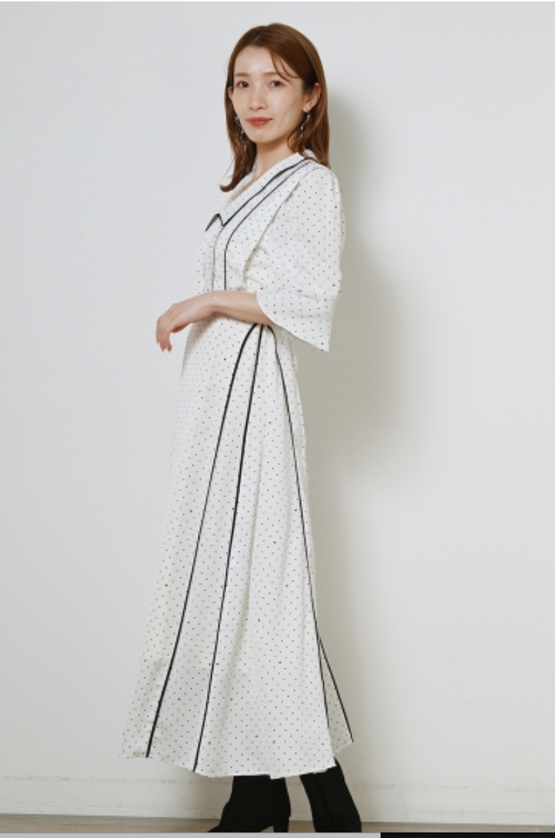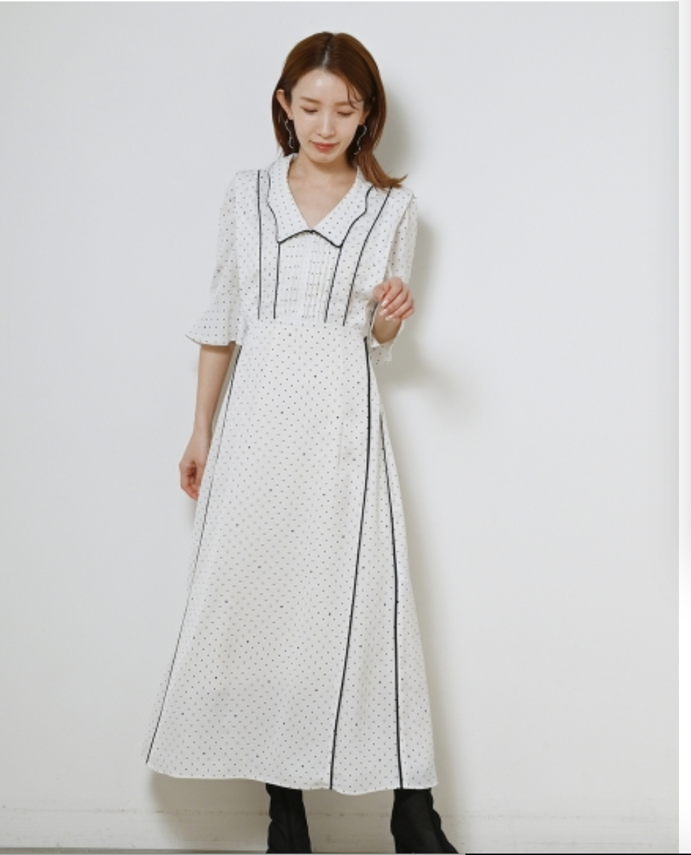 随所に効かせたパイピングが印象的な、クラシカルな雰囲気のワンピース。襟付きのきちんと感のあるルックスで大人の女性に似合う1着です。切り替えでキュッと絞ったボリュームスリーブが何気ない仕草を可憐に演出。ハイウエストの切り替えから裾に向かって緩やかに広がるフレアシルエットは脚長効果があり、スタイルアップも存分に期待できます。