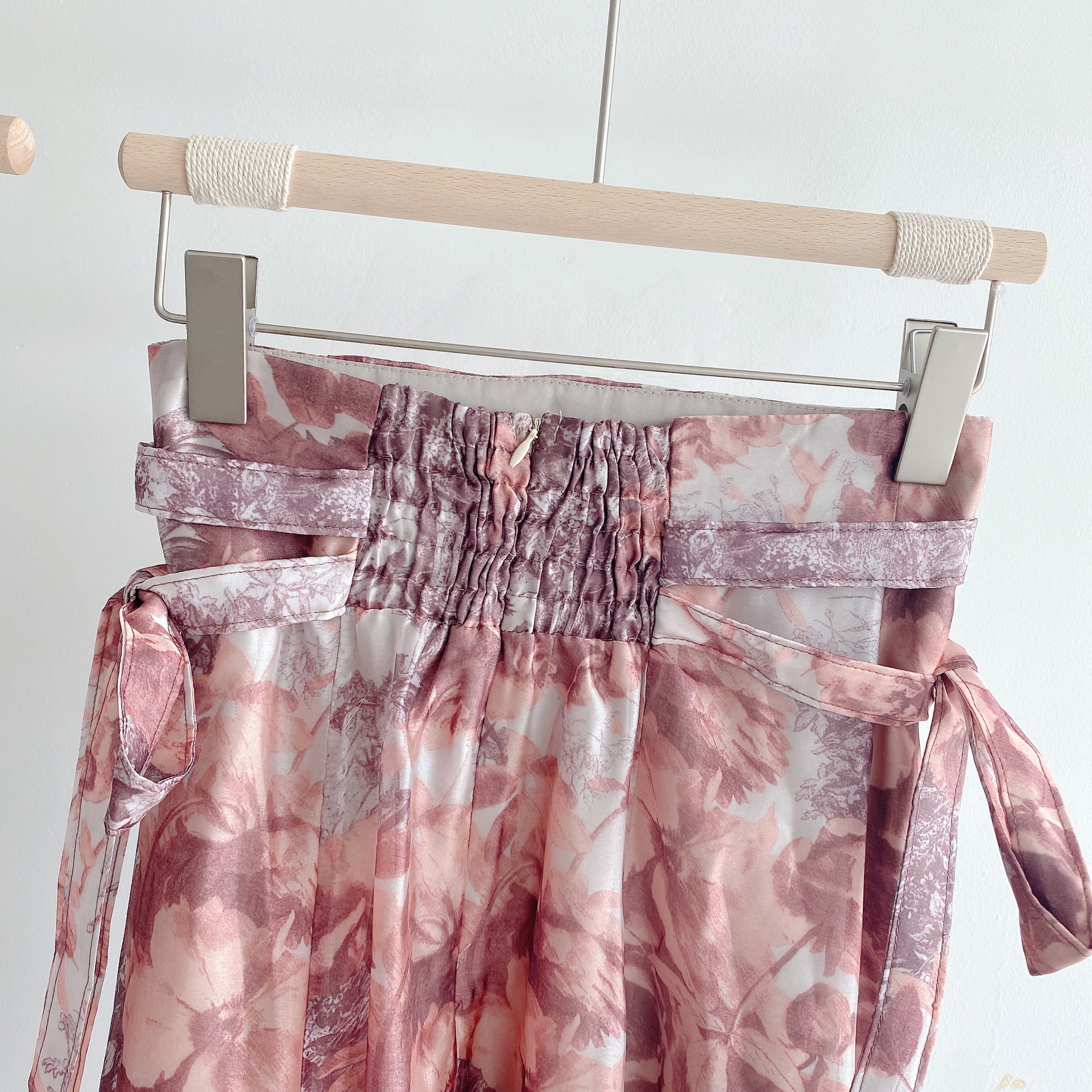 ロココ調の絵画を思わせるトワルドジュイの繊細なプリントをのせたスカート。裾に向かって軽やかに広がるナローフレアシルエットと相まって、エレガンスムードたっぷりに仕上がりました。両サイドでキュッと結んだウエストリボンは女性らしさを高めるアクセントに。こだわりのディテールを活かすならトップスをINした今年らしいスタイリングがオススメです。
