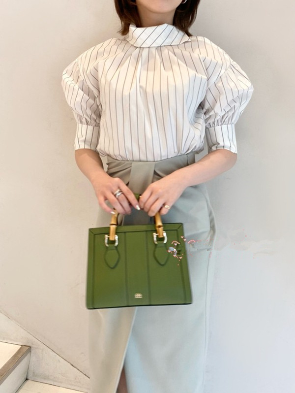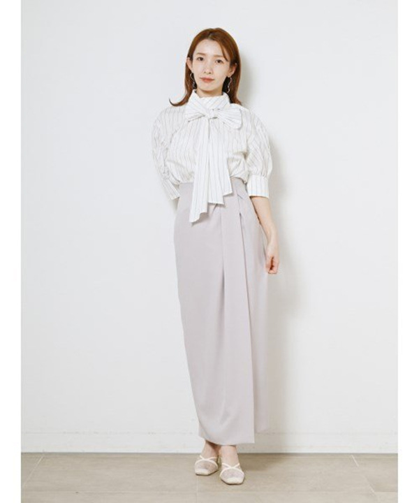 幅広のスタンドカラーに大きなリボンをプラスした、クラシカルレディなブラウス。随所に効かせたギャザーが女性らしい柔らかなニュアンスを添えるポイントに。ボウタイは取り外しできるので、その日の気分やスタイリングに合わせてアレンジも自由に楽しめます。ジャケットのインナーとして合わせやすく、ジレ&スカートのセットアップ(SWFO221067)やタイトスカート(SWFS221156)と着こなすのもおすすめ。