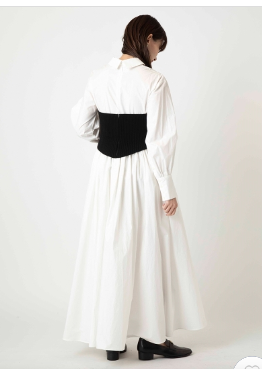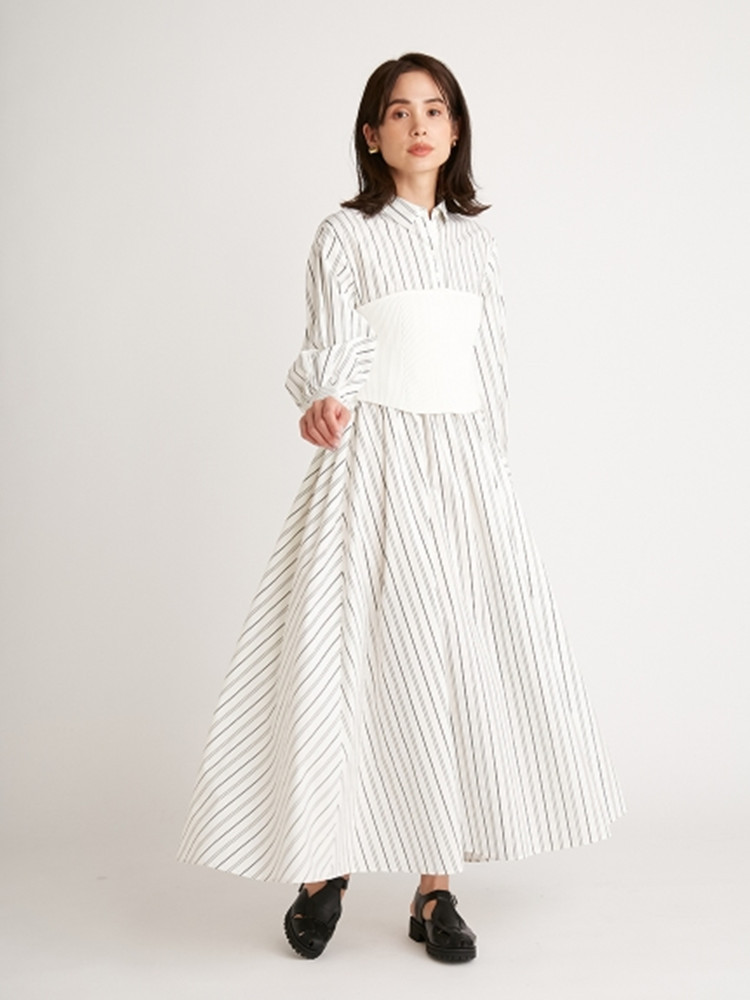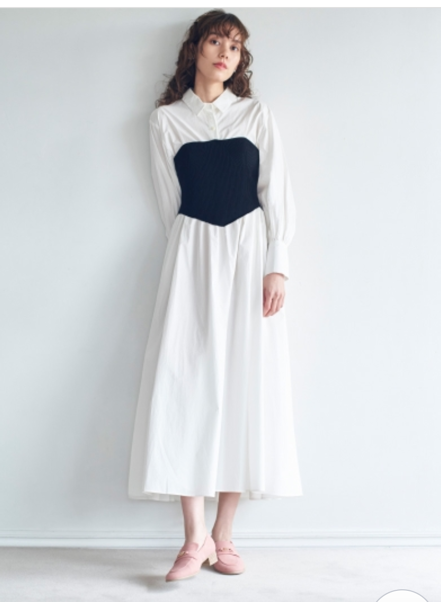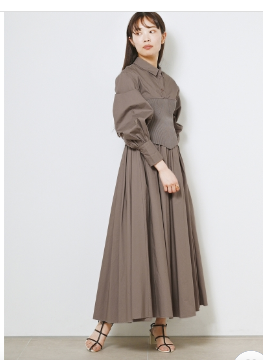 まるでシャツワンピースにニットビスチェを合わせたような技ありのドッキングデザインが魅力の1着。表面加工が施されたコットン生地を用いているので、分量感がありながらも軽い印象を与えてくれます。ドッキングされたビスチェ部分は適度にカーブを描く切り替えを施すことで、女性らしさを感じさせる表情に。フィット&フレアのメリハリシルエットだからスタイルアップ効果も存分に期待できます。
