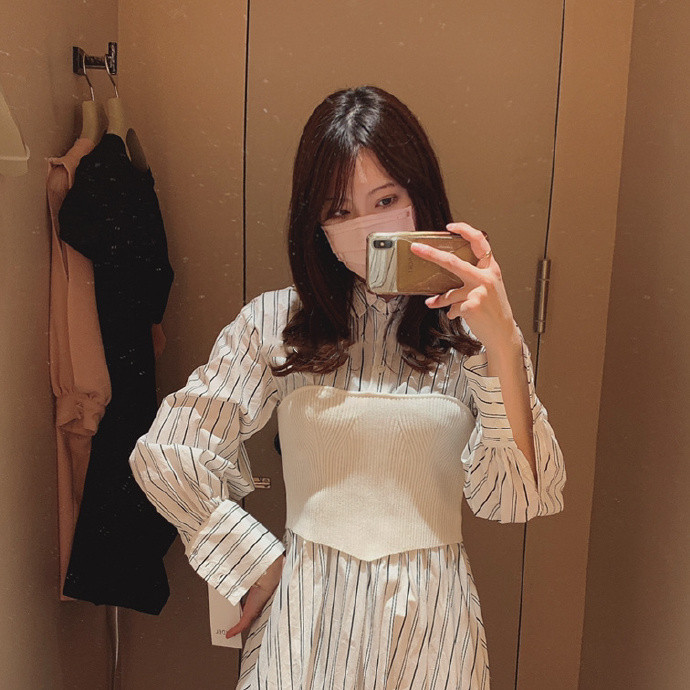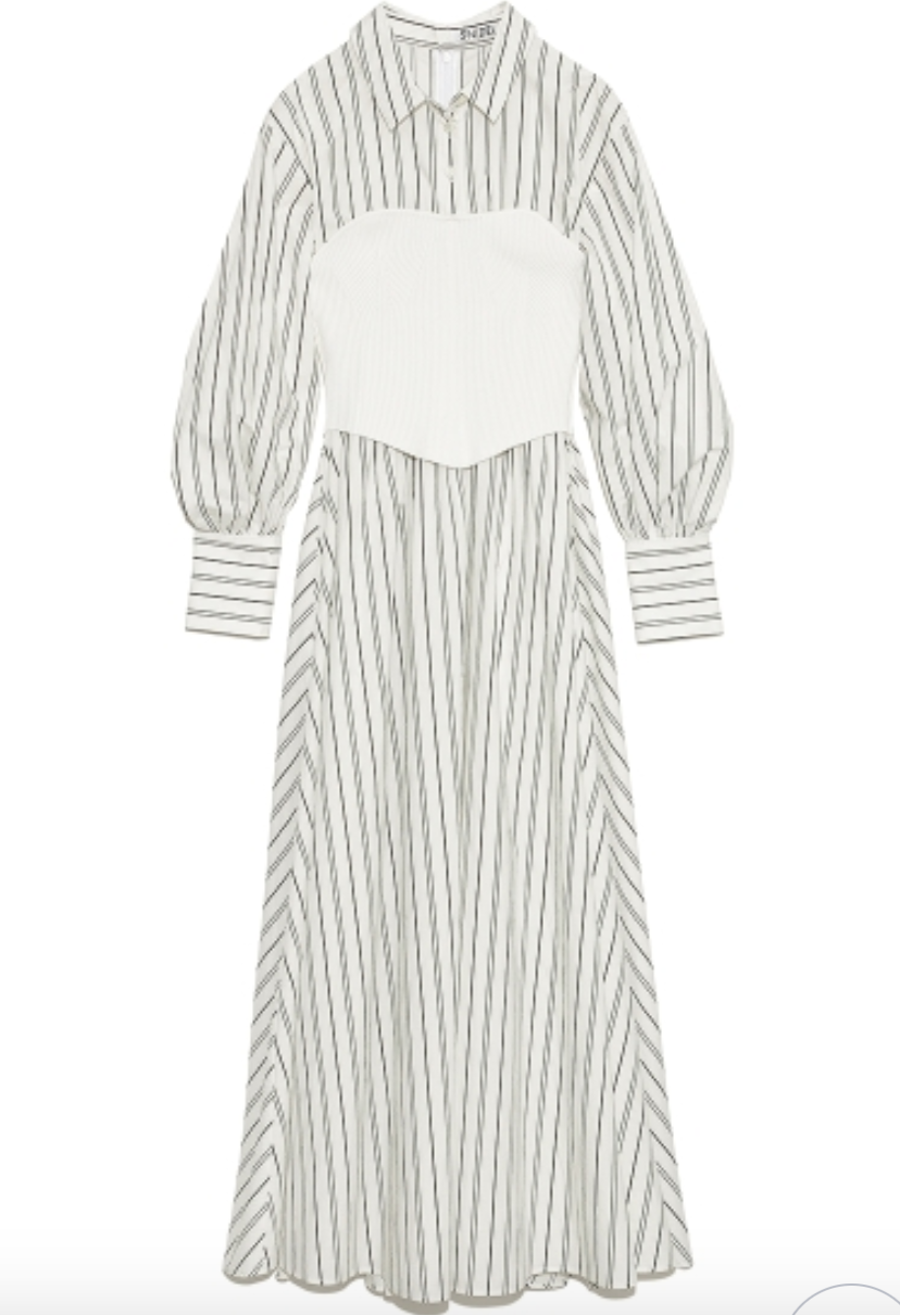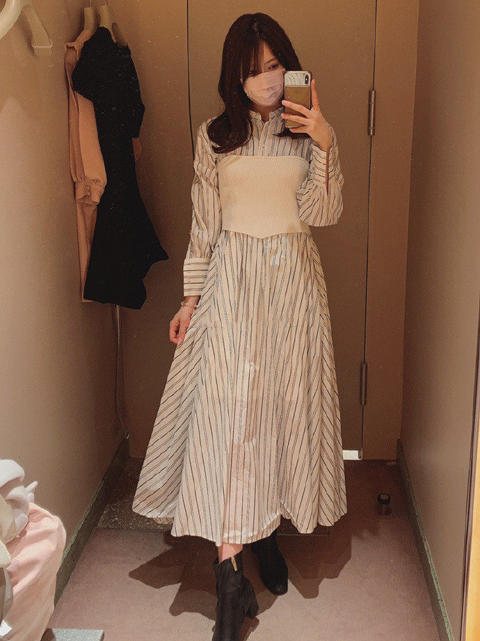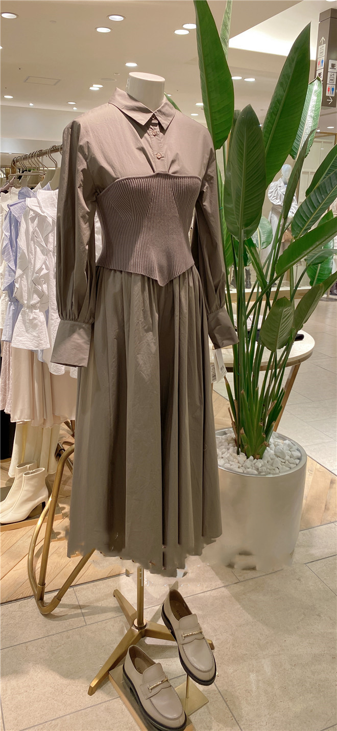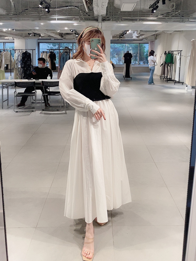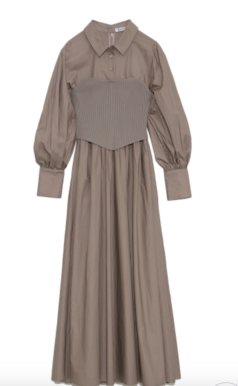 まるでシャツワンピースにニットビスチェを合わせたような技ありのドッキングデザインが魅力の1着。表面加工が施されたコットン生地を用いているので、分量感がありながらも軽い印象を与えてくれます。ドッキングされたビスチェ部分は適度にカーブを描く切り替えを施すことで、女性らしさを感じさせる表情に。フィット&フレアのメリハリシルエットだからスタイルアップ効果も存分に期待できます。