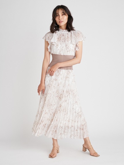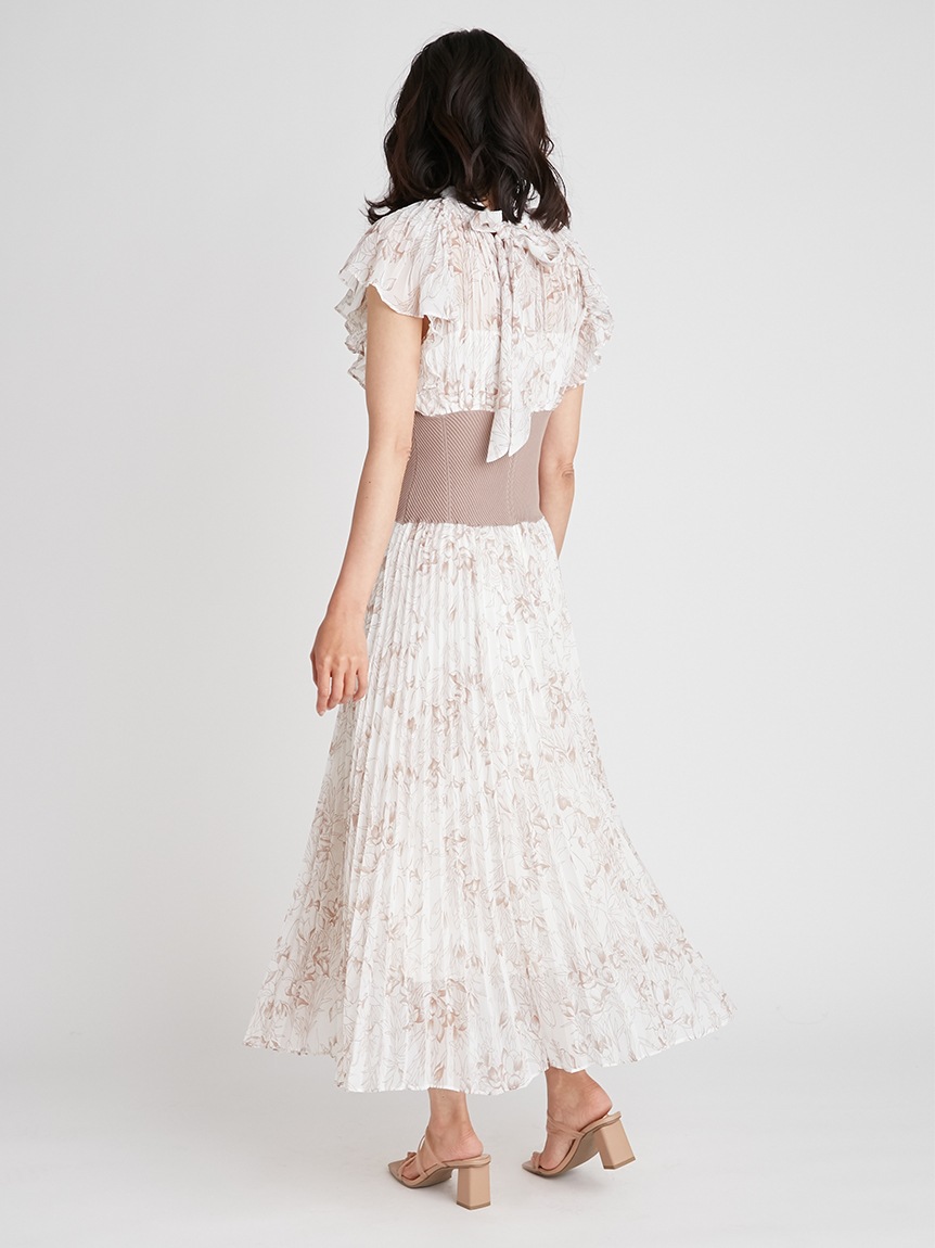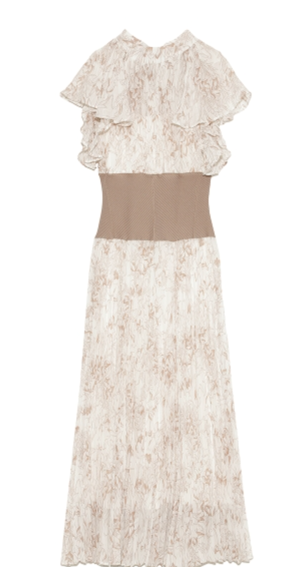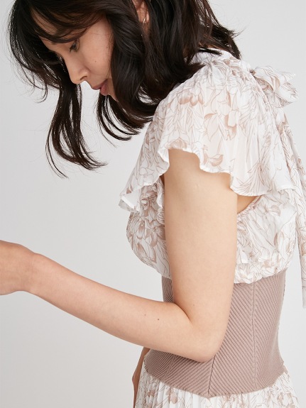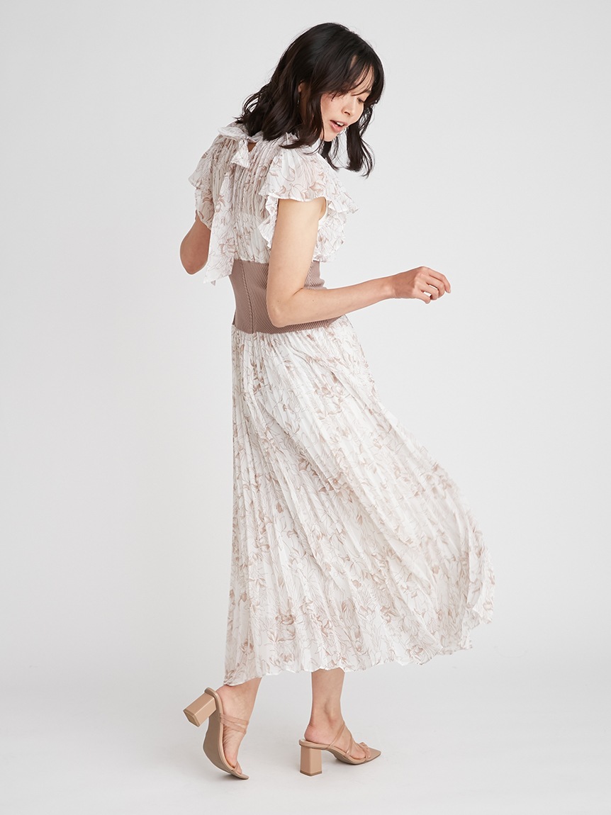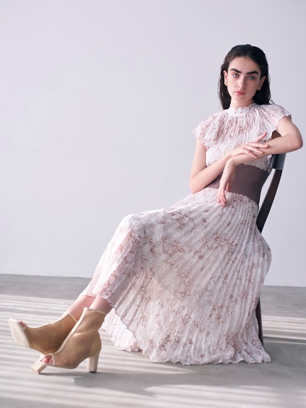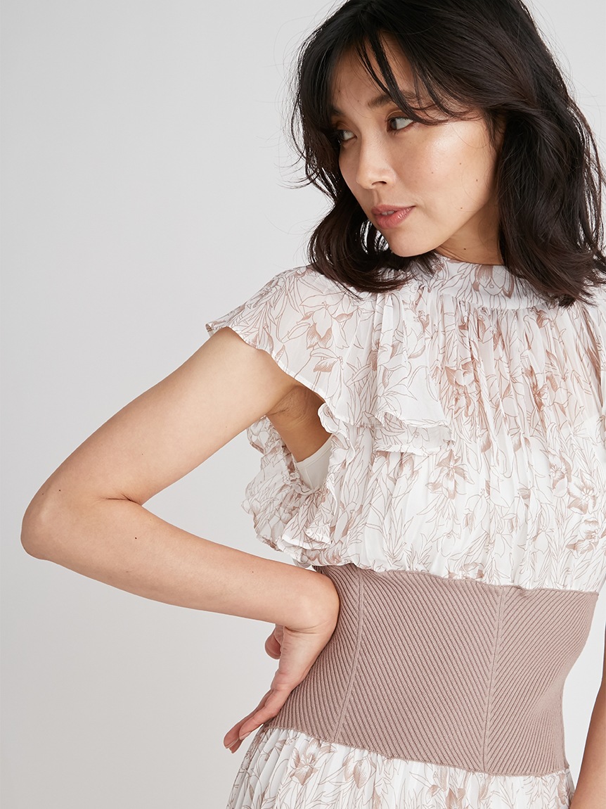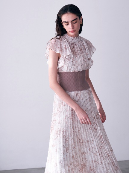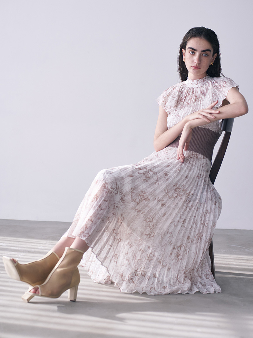 前シーズン人気を集めたワンピースが今季も登場。女性らしい華やかさを演出するシアーなシフォンに線画で表現した花柄を浮かべ大人っぽくまとめました。異素材の絶妙なバランスがモード感を演出するウエストのリブ切り替えは、身体のカーブを強調しスタイルアップ効果は絶大。エレガントに波打つフレアスリーブや品の良いスタンドカラーなど「SNIDEL」らしいディテールは継承し、どこまでも女性らしく仕上げています。