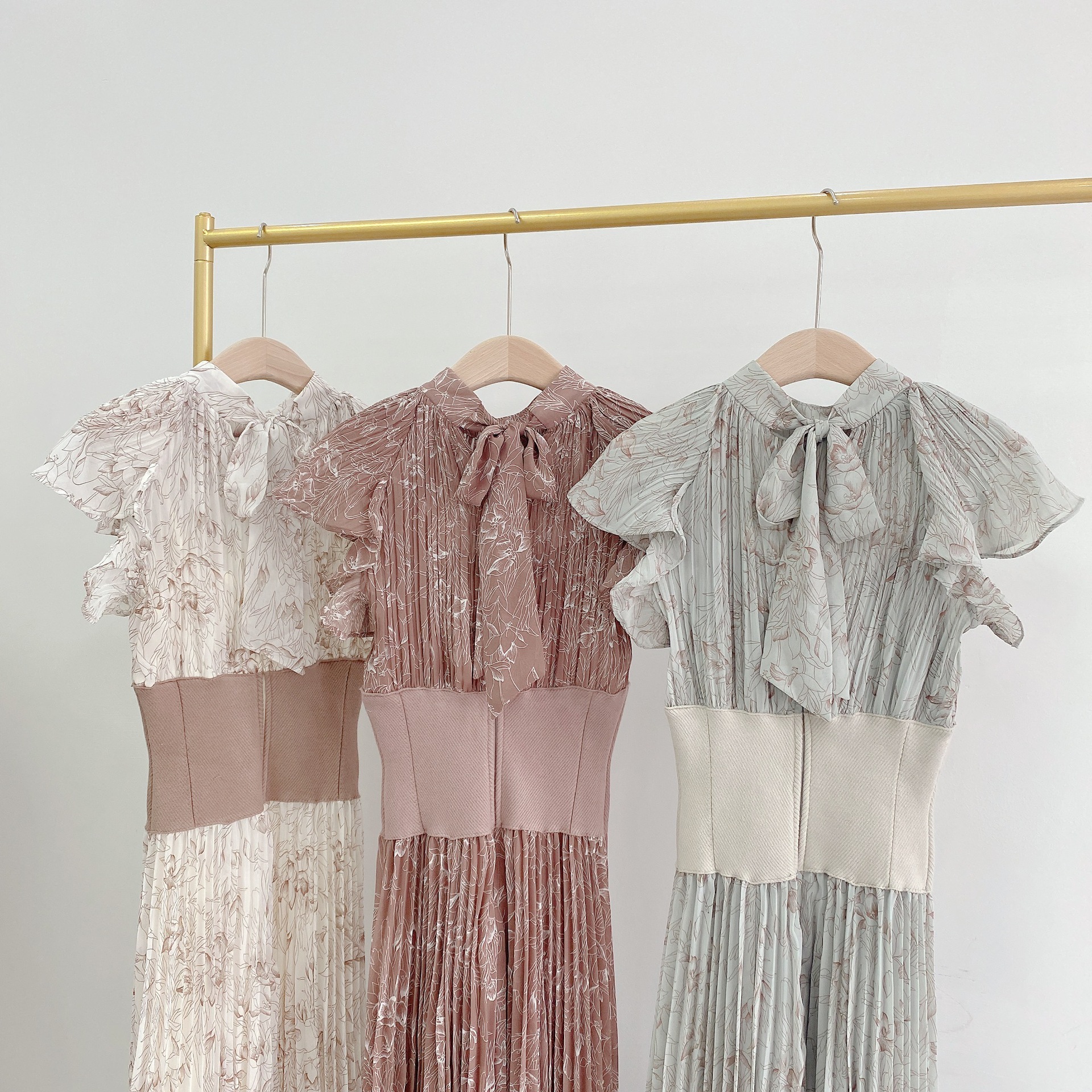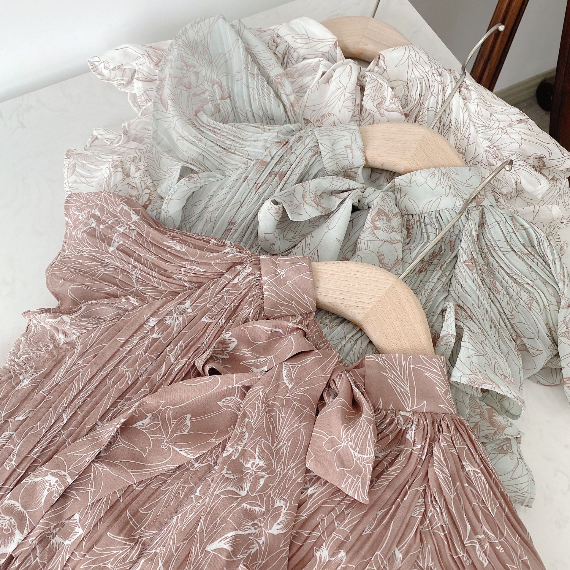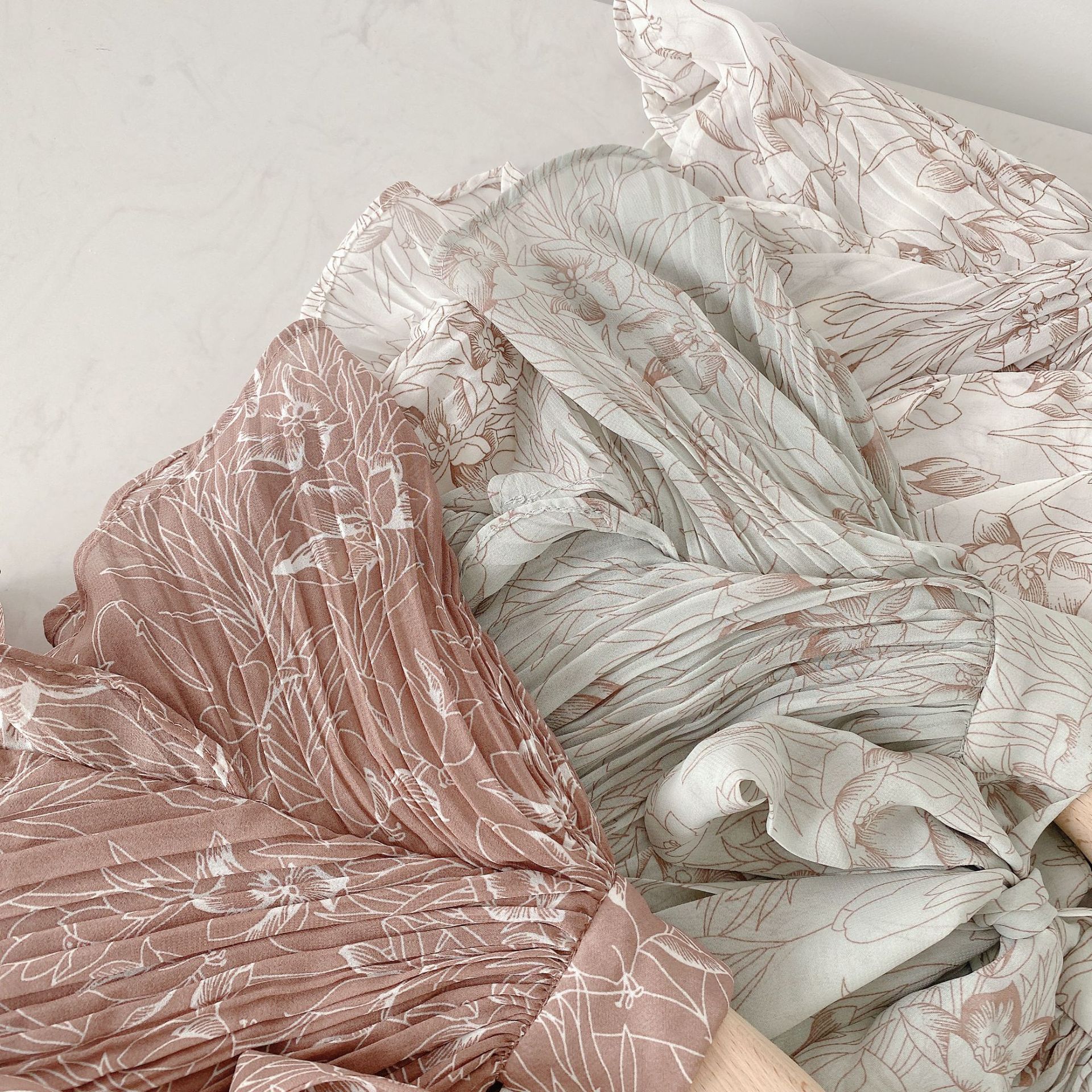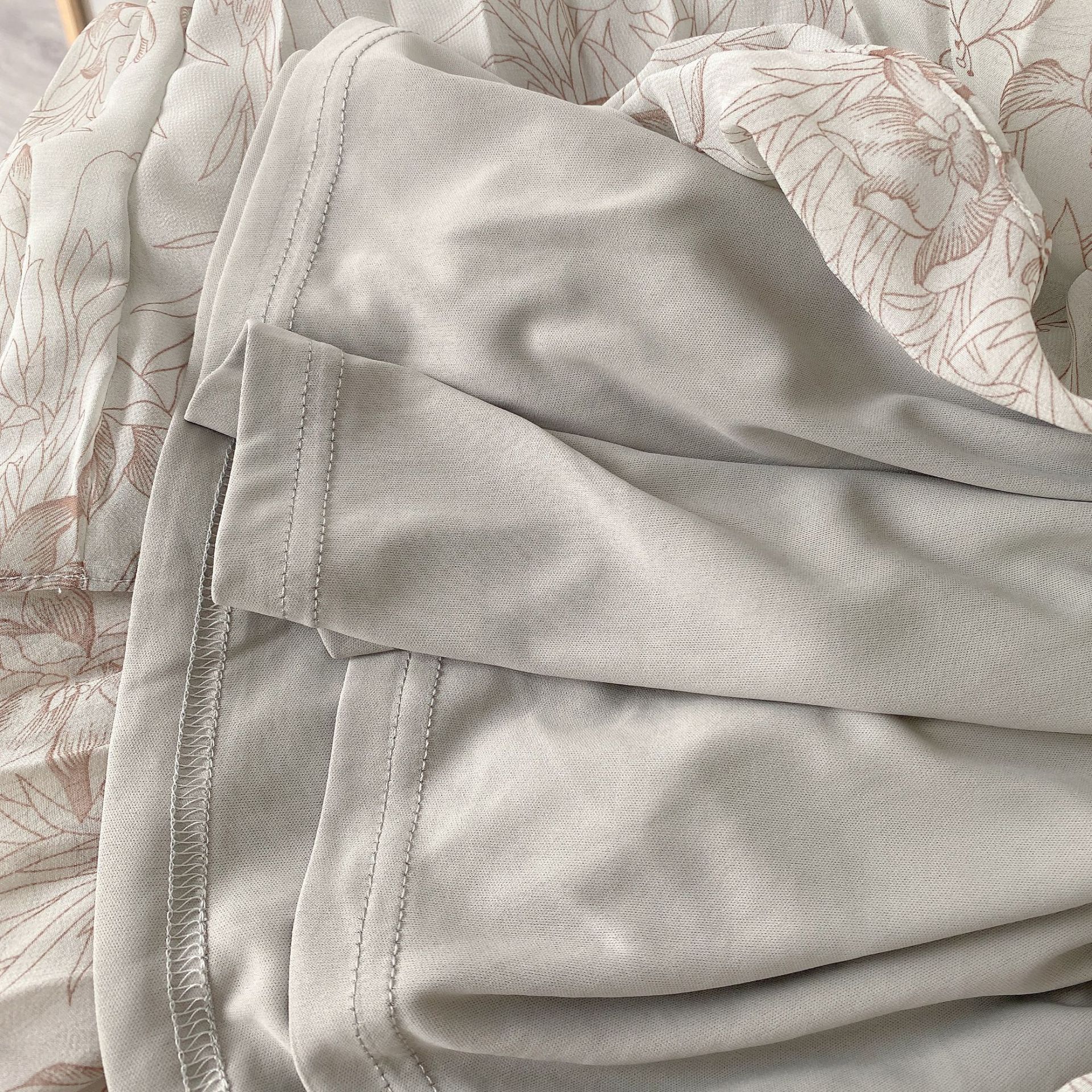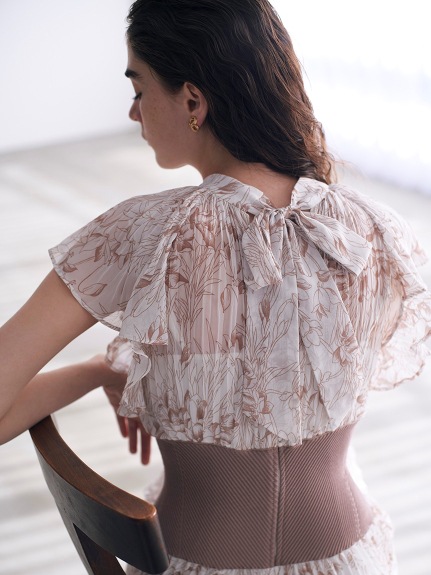 柔らかく透けるシフォンに、トレンド感のある線画タッチの花柄を描きました。アイボリー、グレー、モカの3色展開です。