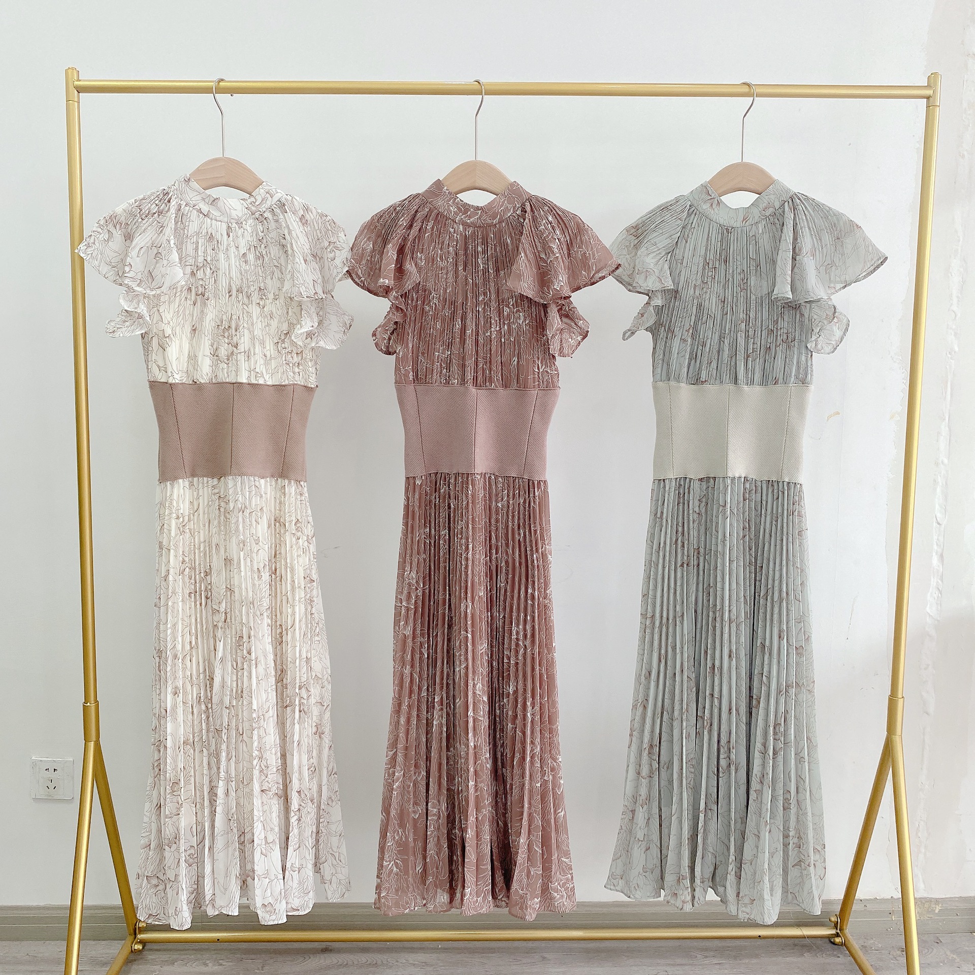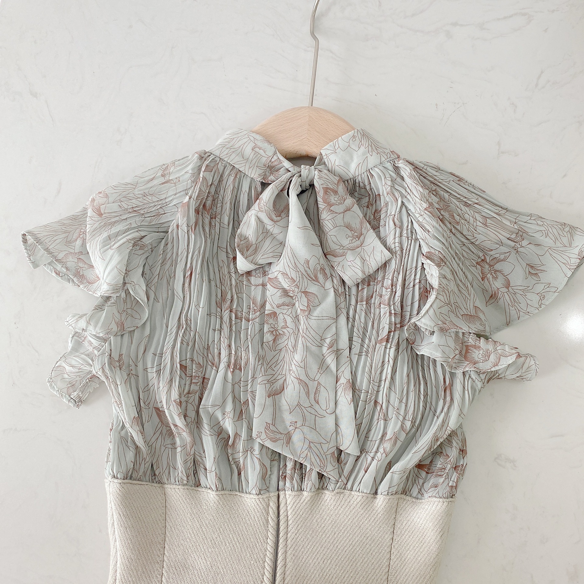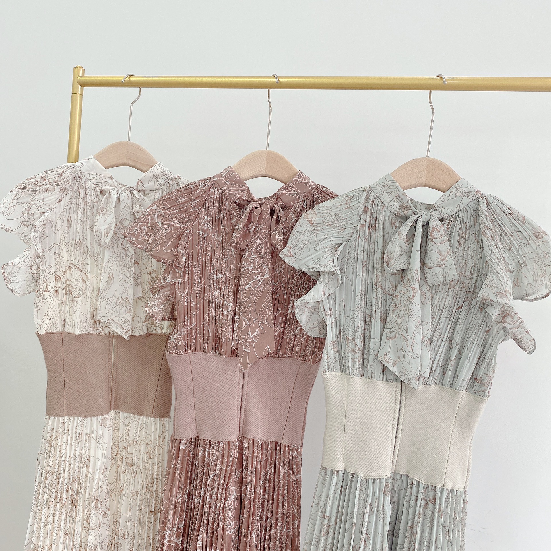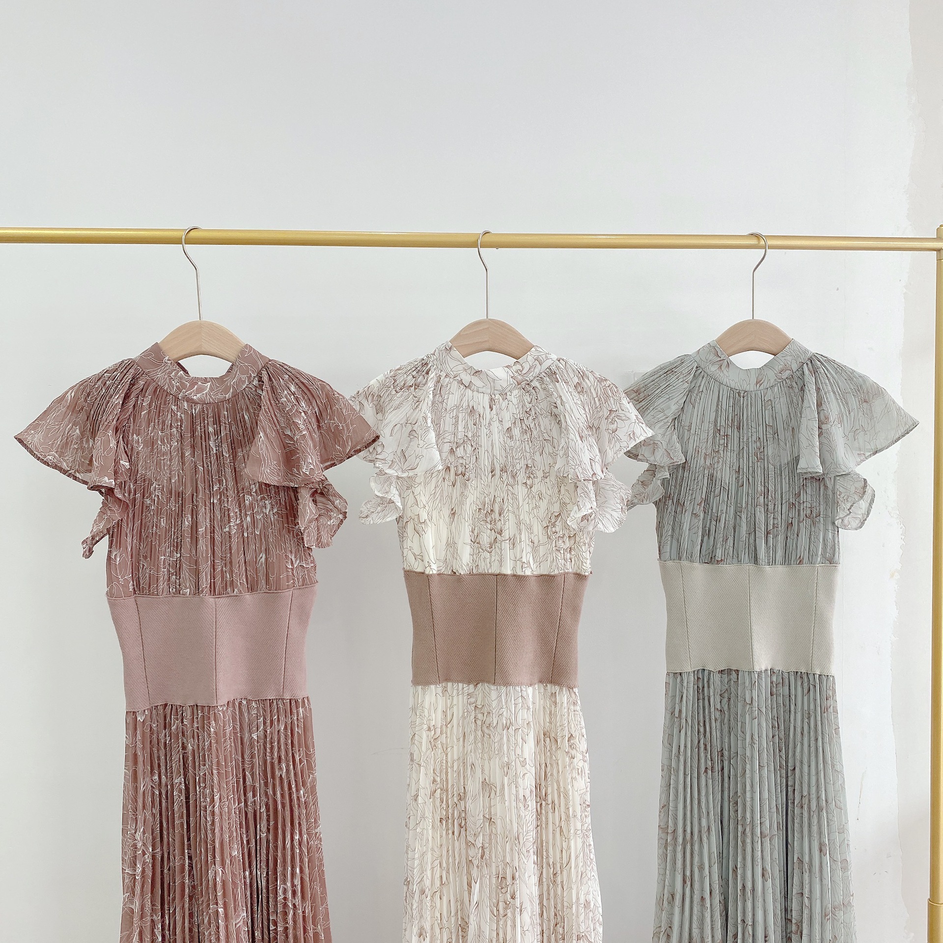柔らかく透けるシフォンに、トレンド感のある線画タッチの花柄を描きました。アイボリー、グレー、モカの3色展開です。