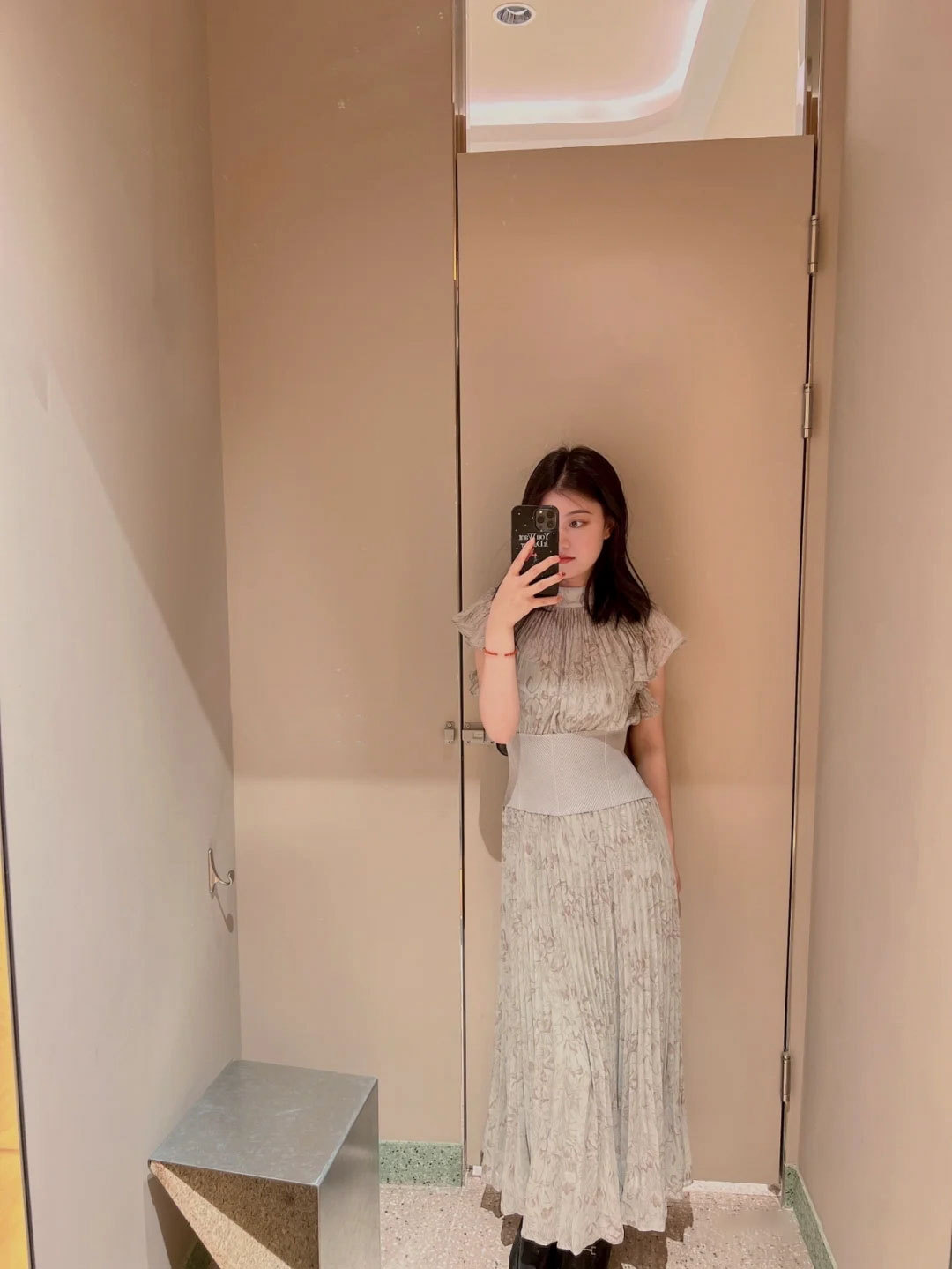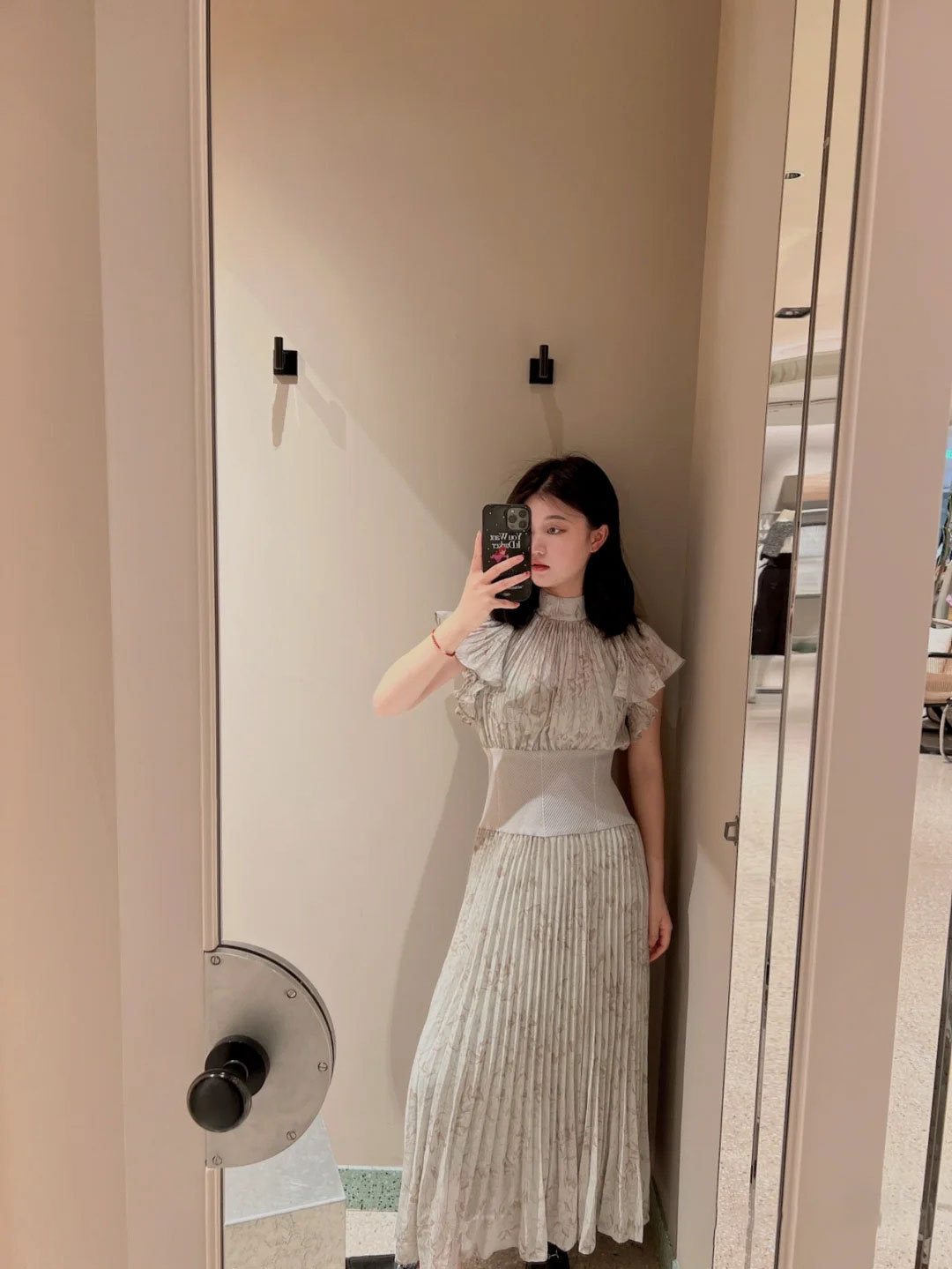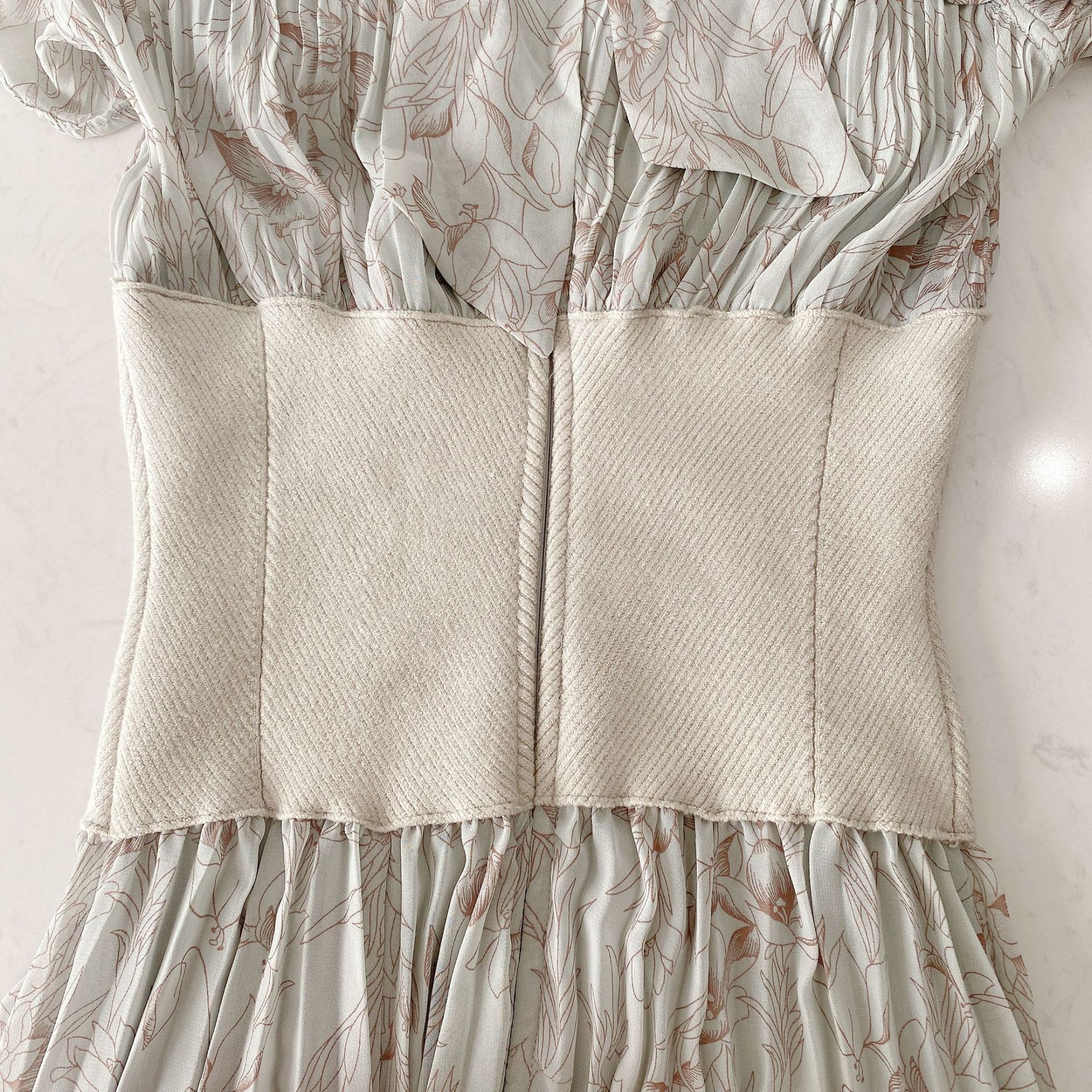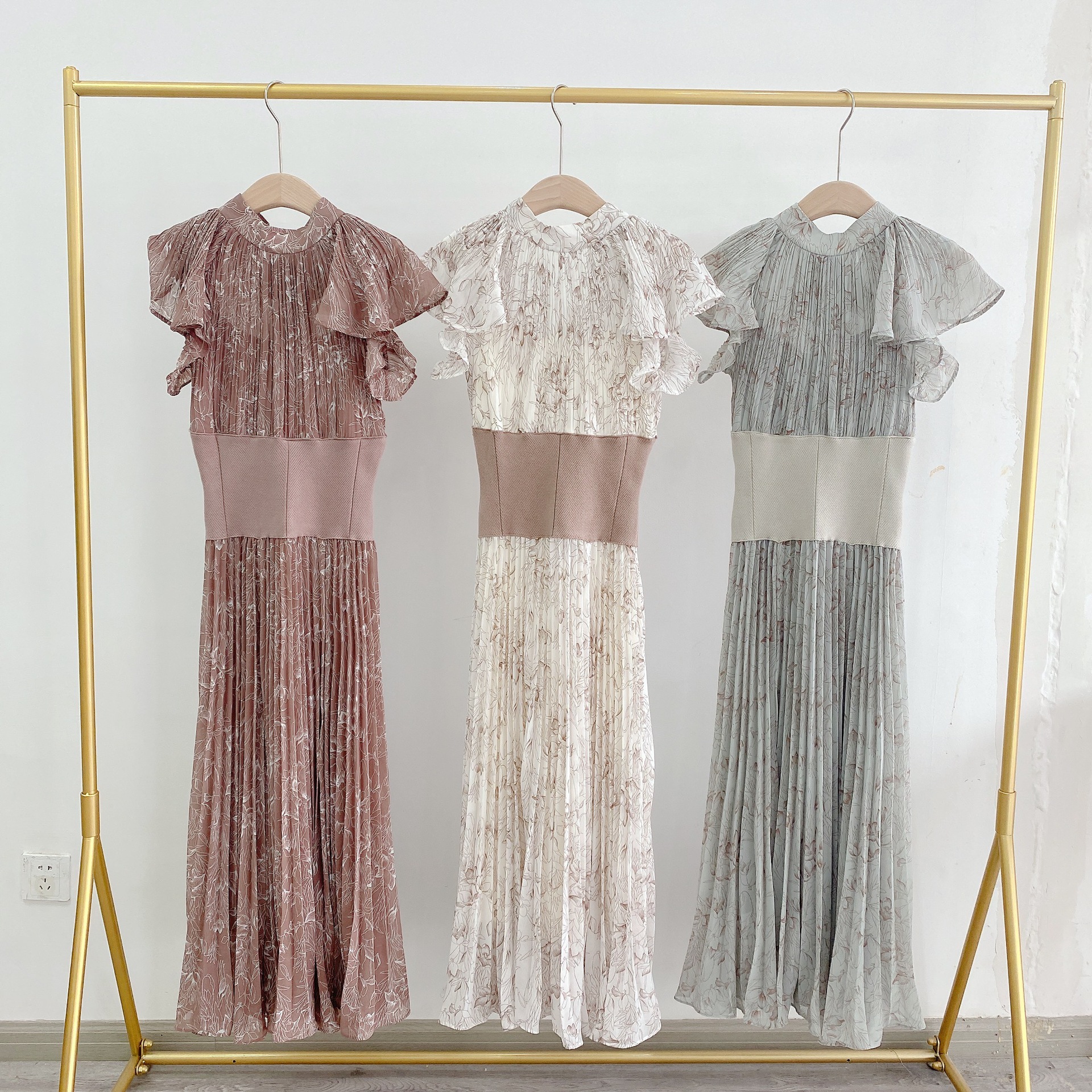 柔らかく透けるシフォンに、トレンド感のある線画タッチの花柄を描きました。アイボリー、グレー、モカの3色展開です。