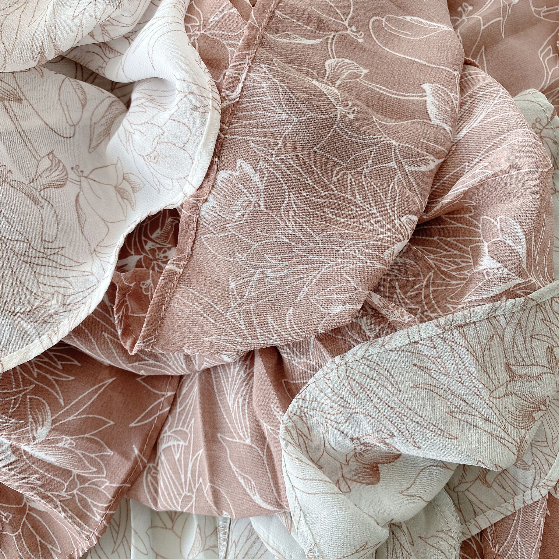優しい透け感を持つ繊細なシフォン素材を使用。柔らかな雰囲気のアイボリー、落ち着いた印象を与えるグレー、着まわしやすいモカの3色展開です。
