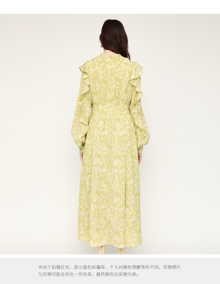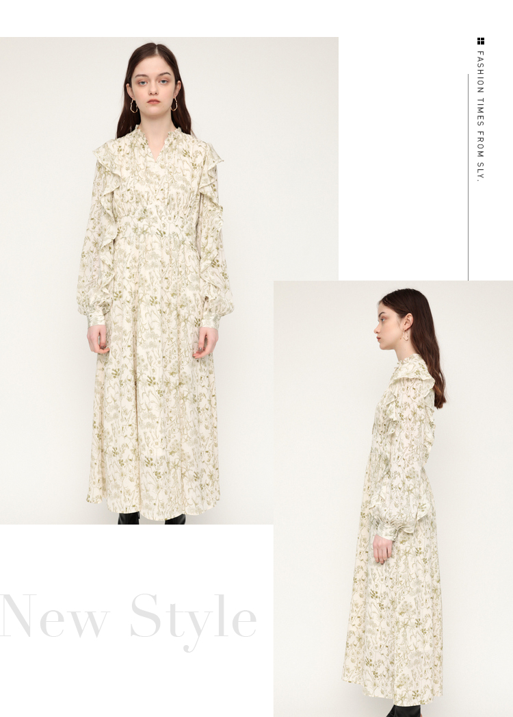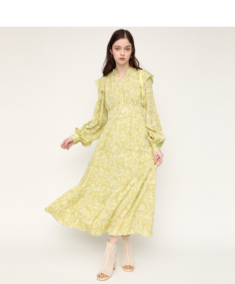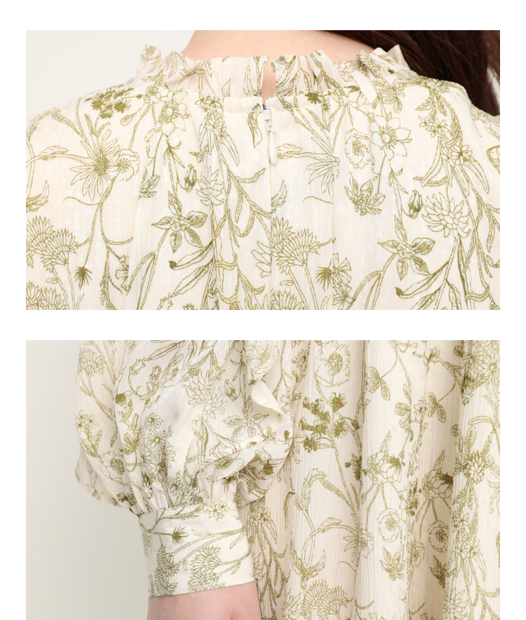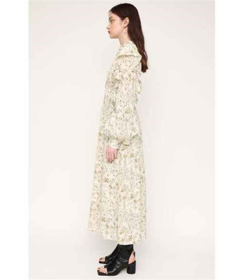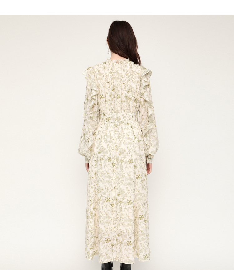 繊細な線画を女性らしいシルエットのワンピースに落とし込みました。いろんな種類の花を組み合わせた春を感じられる花柄です。ゆるかなマーメードシルエットとフリル付きのスリーブが女性らしい印象に。太めのウエストベルトのデザインは、ギャザーのボリュームを抑えてウエスト周りをシャープに見せてくれるアイテム。身頃には裏地が付いています。