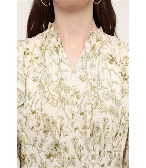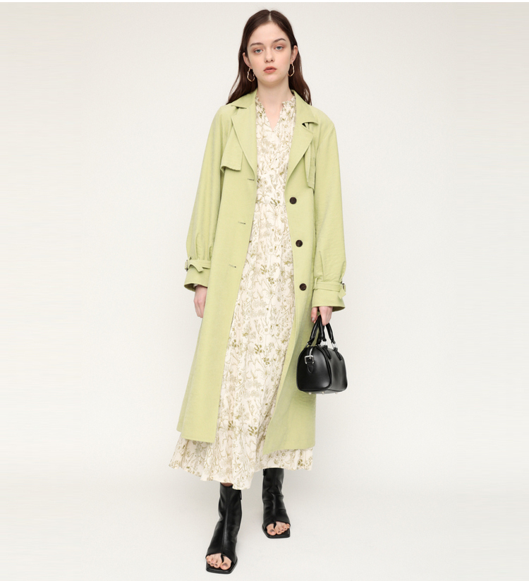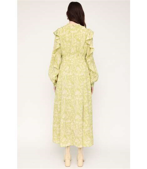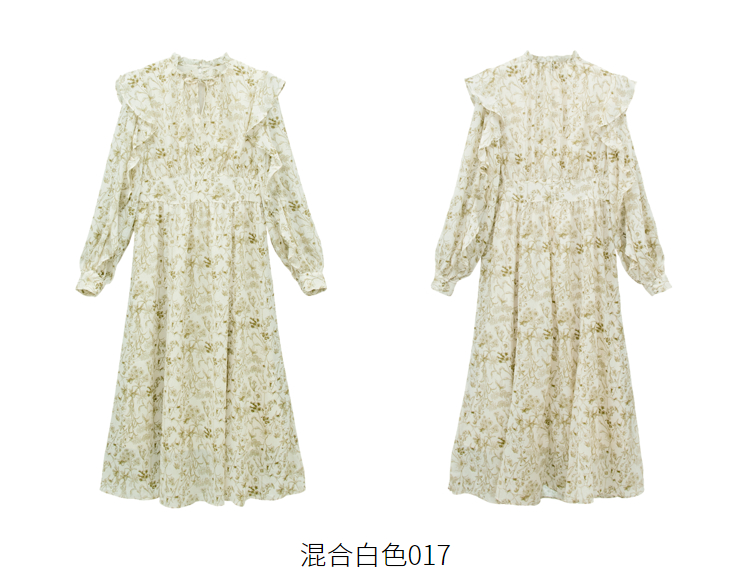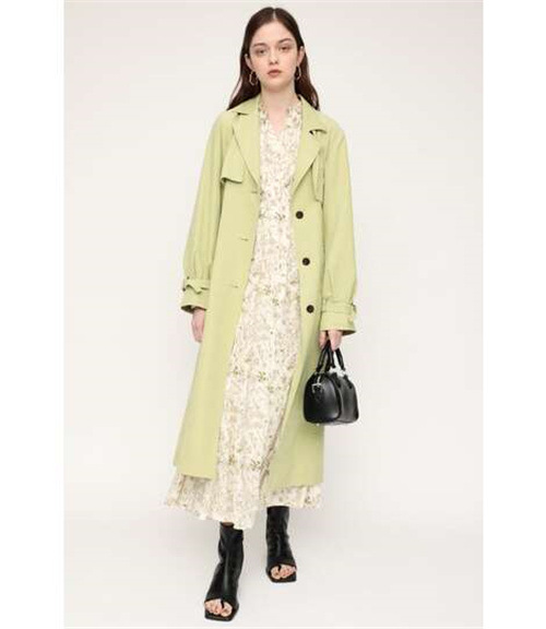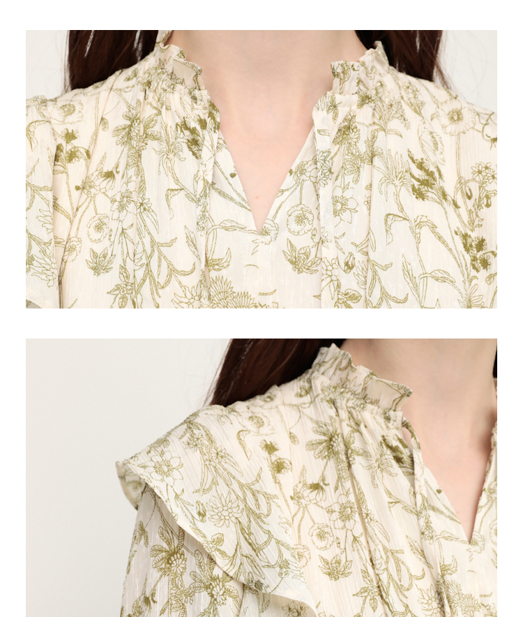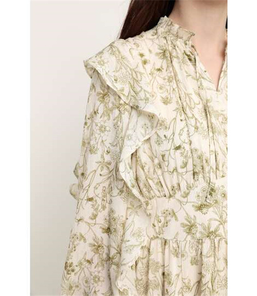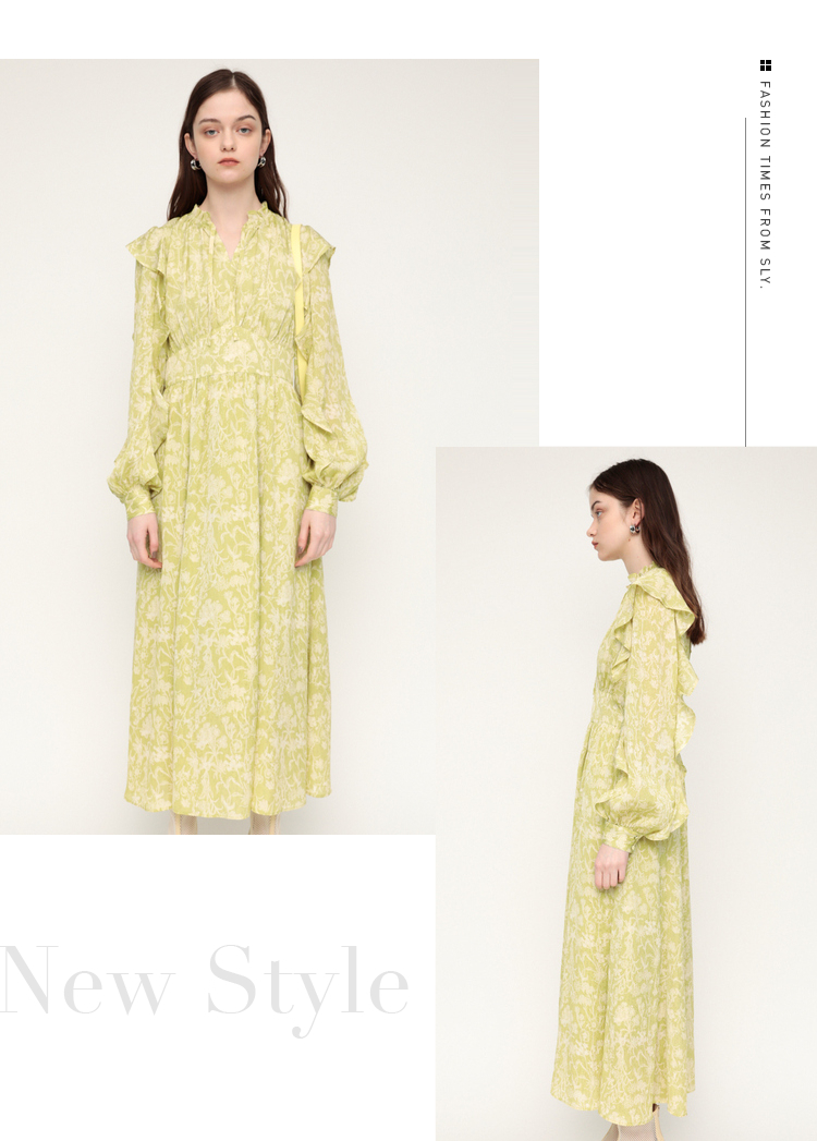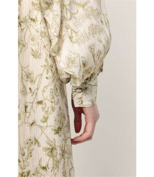 繊細な線画を女性らしいシルエットのワンピースに落とし込みました。いろんな種類の花を組み合わせた春を感じられる花柄です。ゆるかなマーメードシルエットとフリル付きのスリーブが女性らしい印象に。太めのウエストベルトのデザインは、ギャザーのボリュームを抑えてウエスト周りをシャープに見せてくれるアイテム。身頃には裏地が付いています。