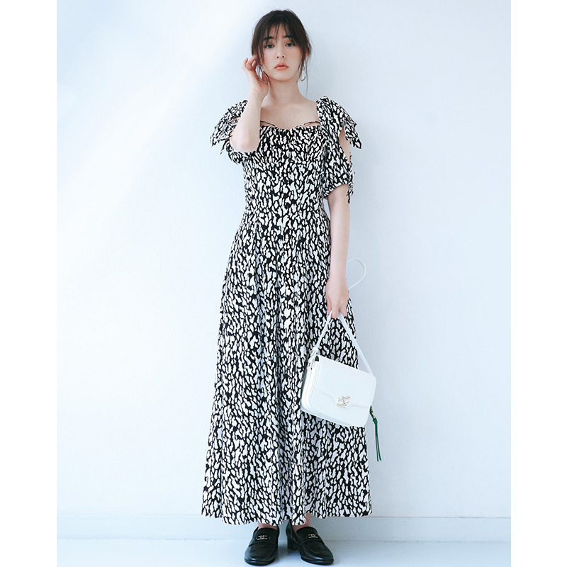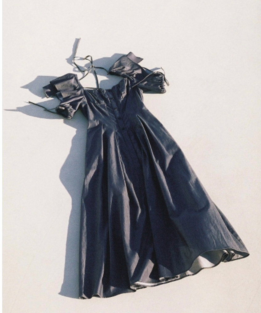 デコルテ見せのスクエアネック、コルセットライクな身頃、ほどよい肌見せの2枚重ねに仕立てたデコラティブなスリーブなど、トレンドライクなディテールを詰め込んだワンピース。華奢なストラップディテールが胸元&バックネックをセンシュアルに魅せ、女性らしさをぐっと高めています。ドロスト仕様の袖口はキュッと絞れ、フォルムのアレンジが可能。バックには太幅のシャーリングを効かせているのでフィット感があり、着心地も快適です。