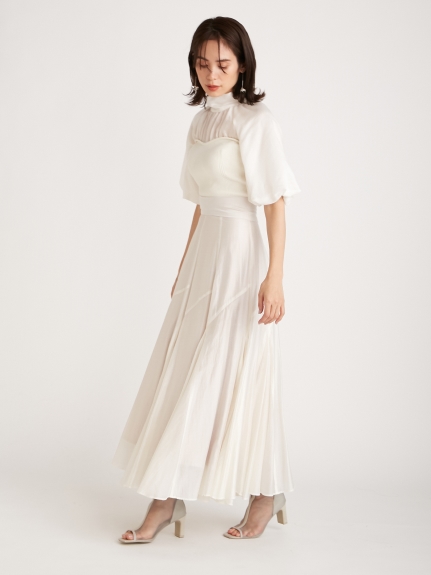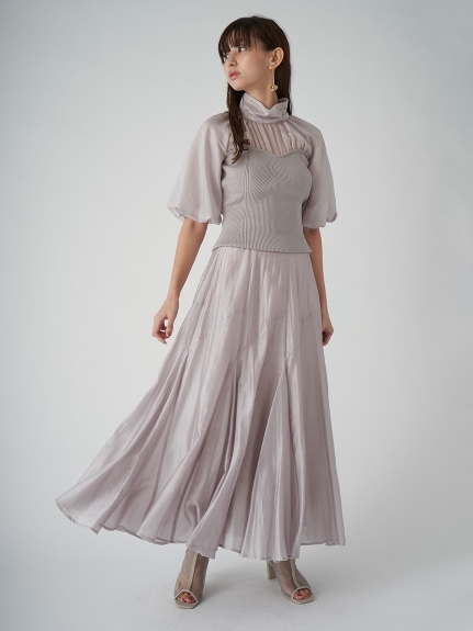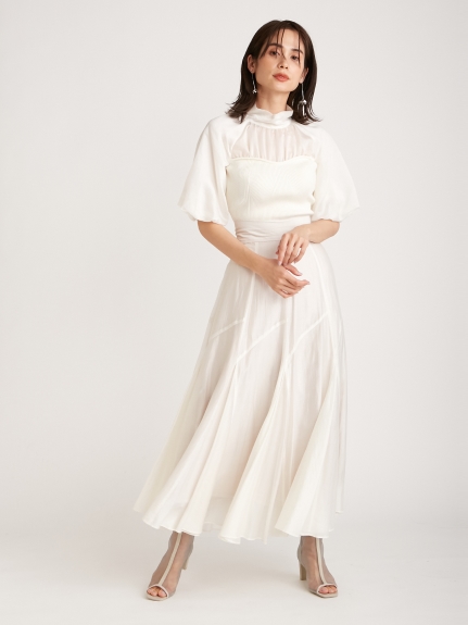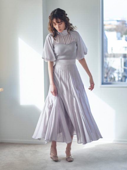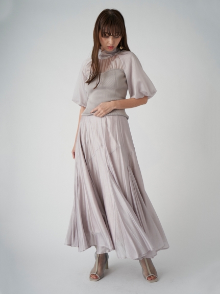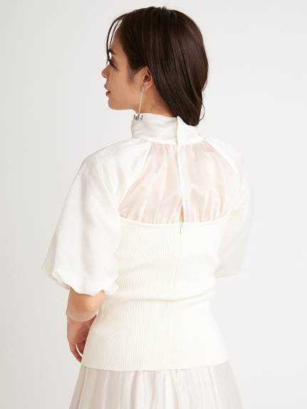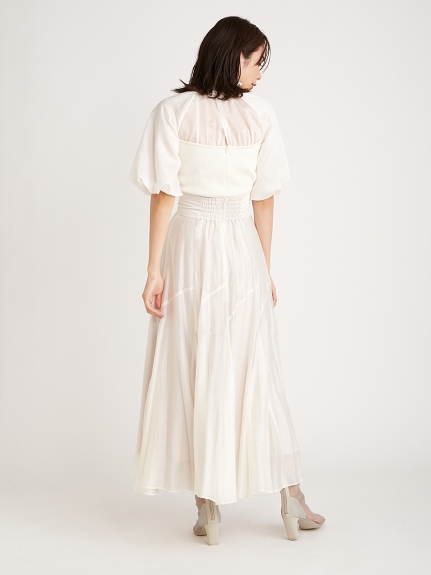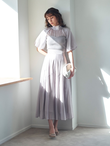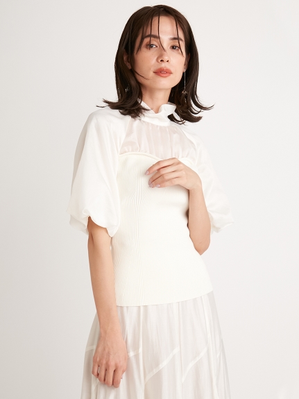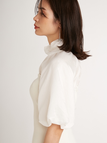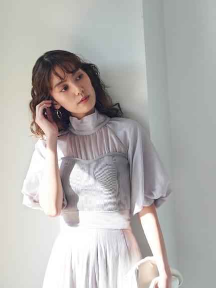 まるでビスチェをレイヤードしているかのようなドッキングデザインのブラウス。トレンドライクなボリュームスリーブ、品の良いスタンドカラーなど、こだわりのディテールを詰め込みました。生地の優しい透け感と背中のスリットでセンシュアルな肌見せができ、女性らしさは一気に加速。同じカラー展開のフレアスカート(SWFS221145)と組み合わせるのはもちろん、パンツコーデでモードに着こなすのもオススメです。