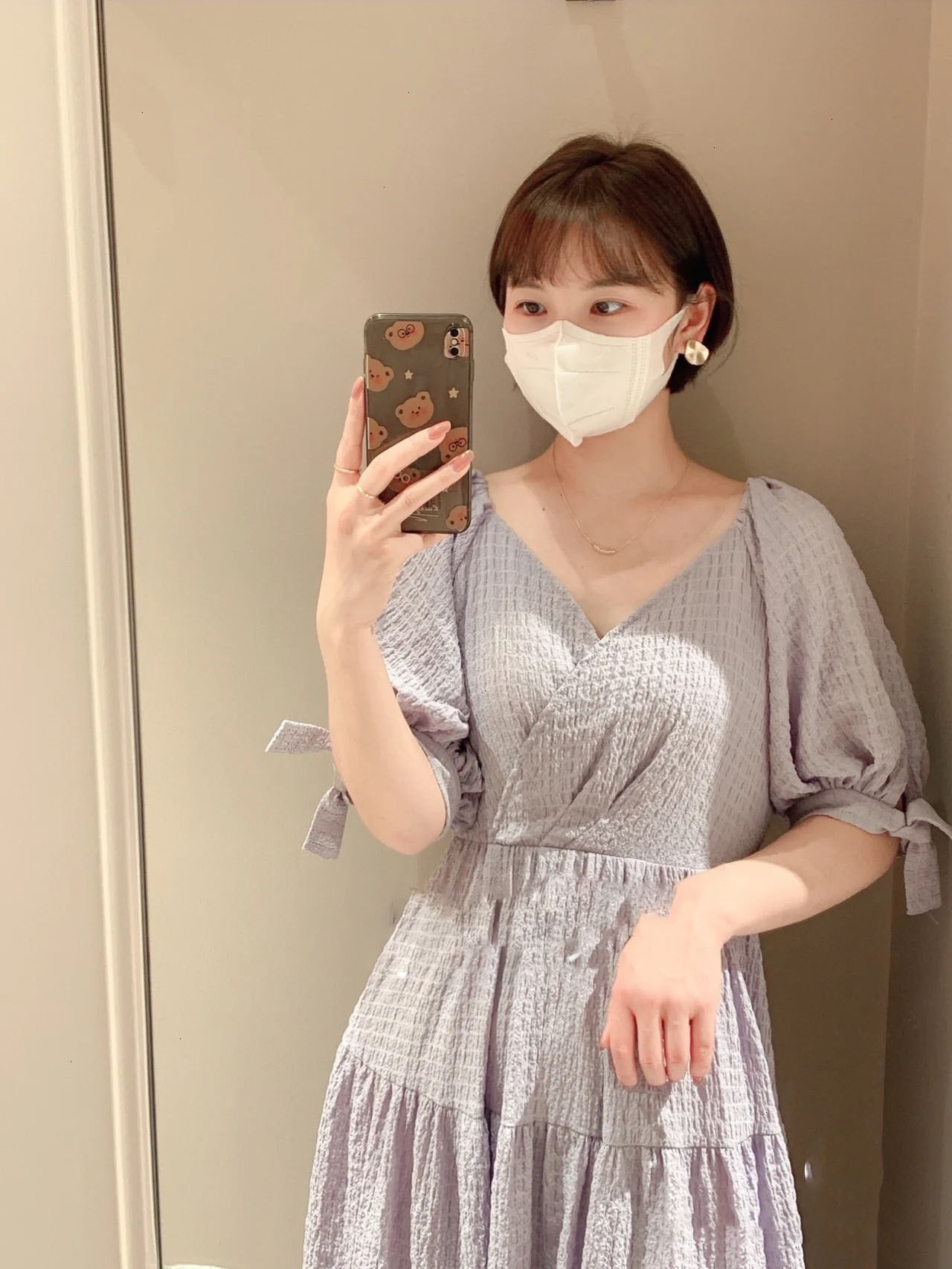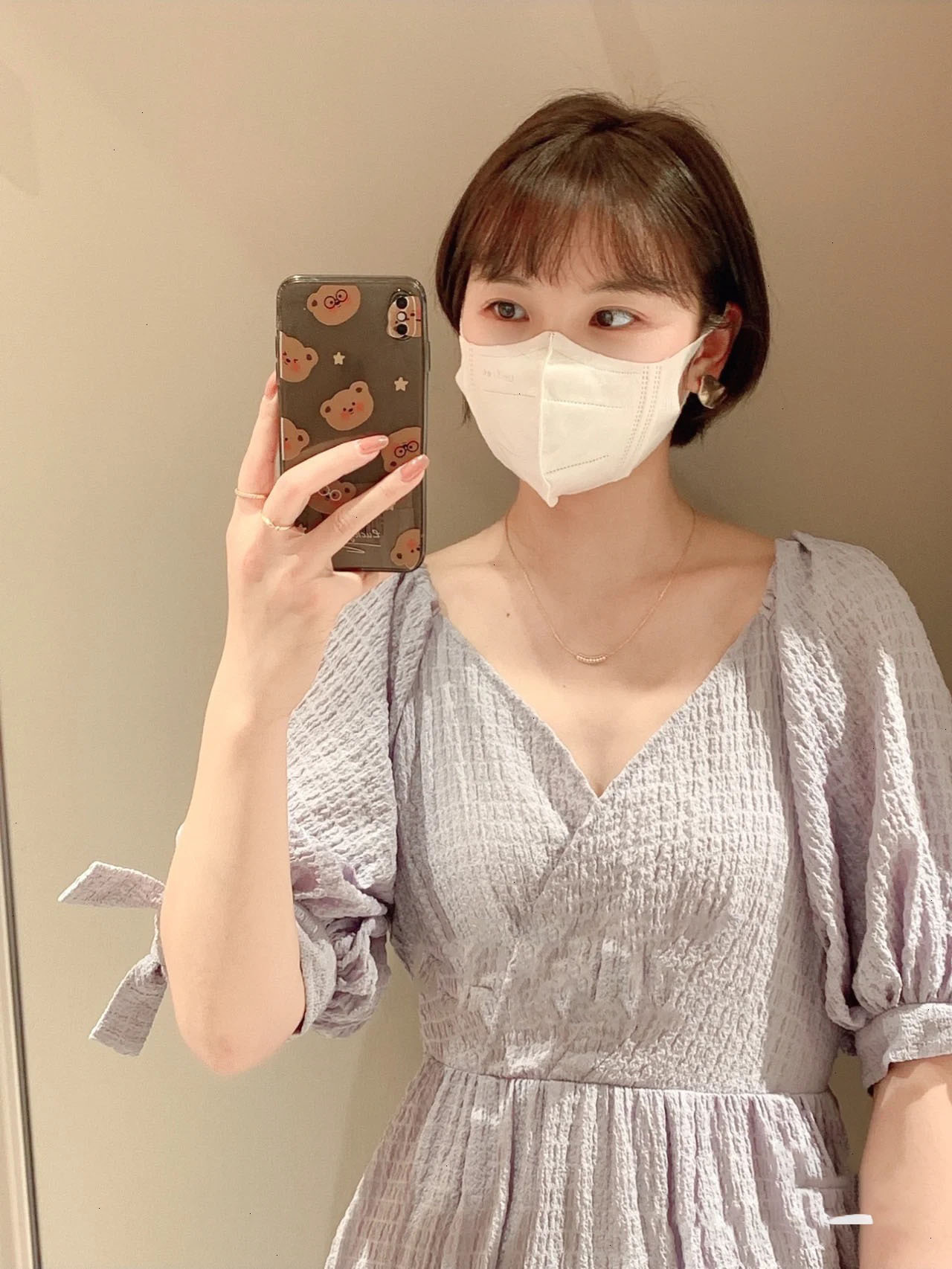 襟ぐりはデコルテが綺麗に見えるような程よく開いたVネックにしています。