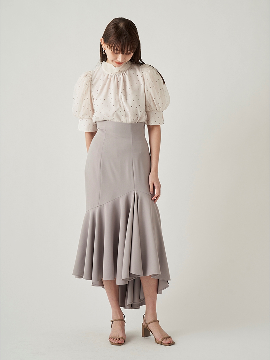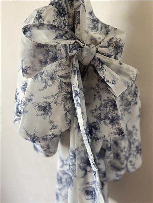 品の良いシアー感と光沢を持つオーガンジー素材を使用。合わせやすいオフホワイト、モカに、愛らしいドット柄、クラシカルなフラワー柄を加えた4色のカラー展開でお届けします。