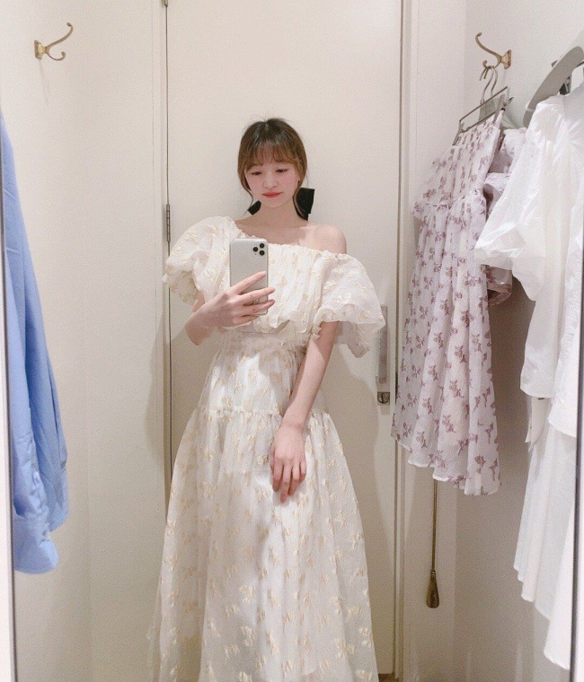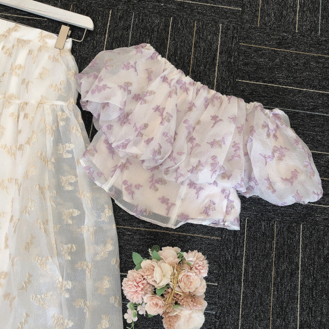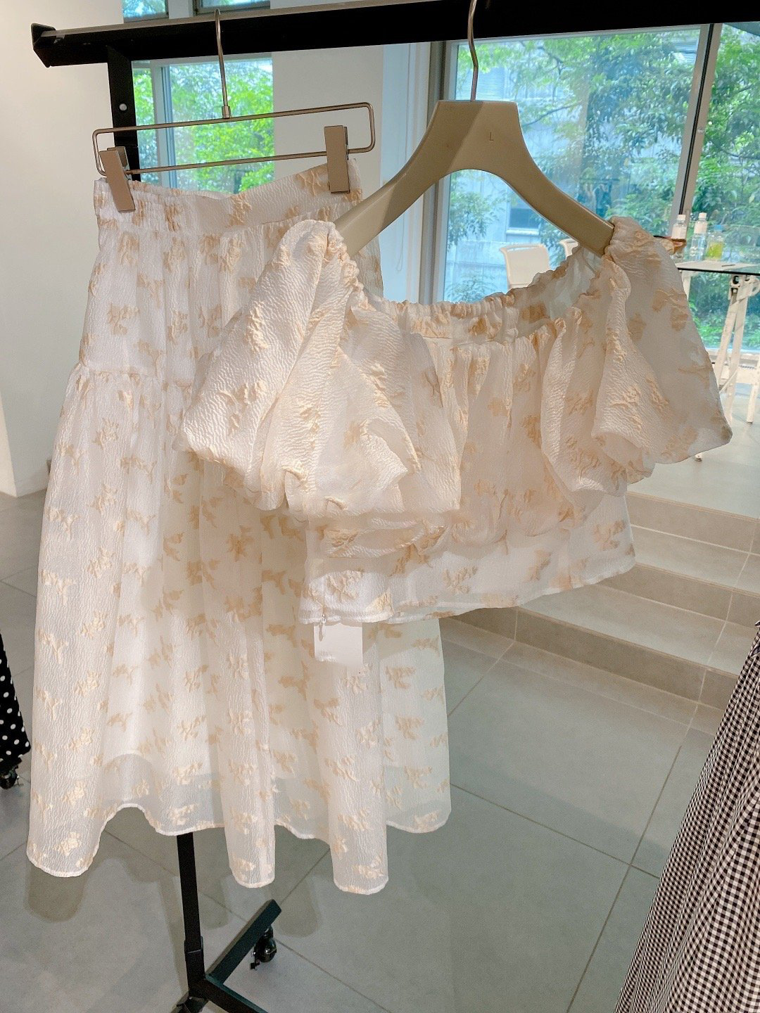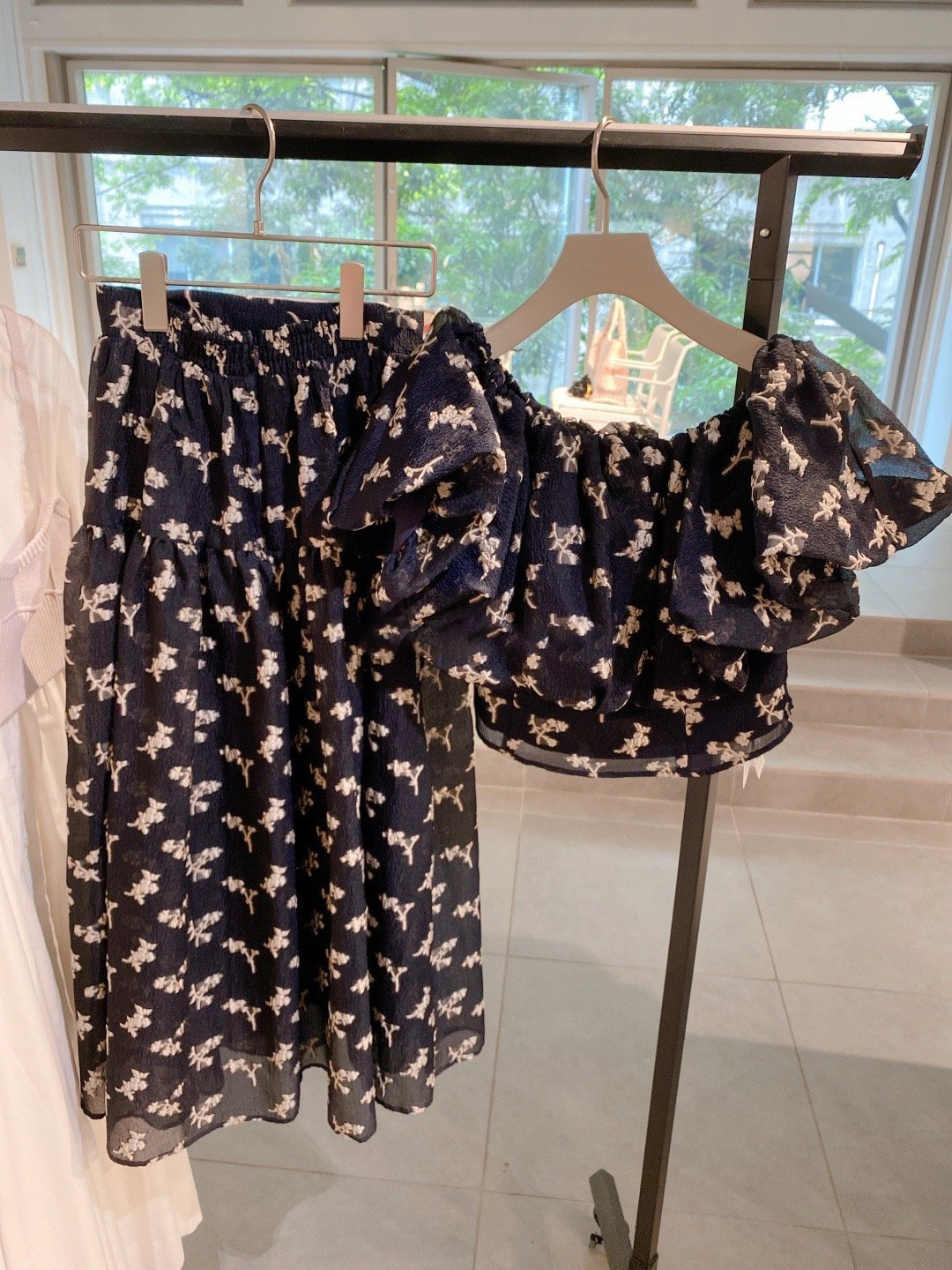 ジャカードオフショルブラウス+ジャガードボリュームスカート