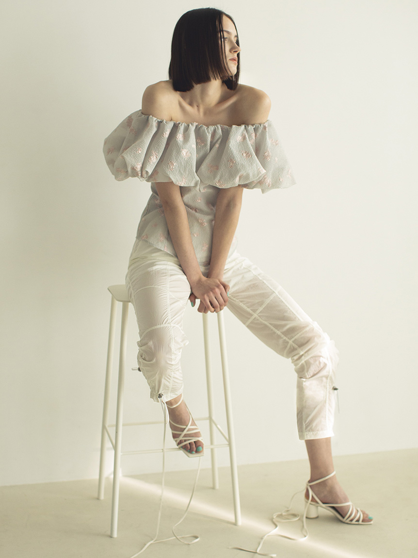 オリジナルのジャカード模様で華やかに仕上げたブラウス。肩まわりにはゴムを入れているので肩に乗せてもオフショルダーとしても着られるアレンジ上手なデザイン。トップにボリュームがあるため身頃部分はパネル切り替えで体に沿うように仕立て、メリハリ感をプラスしています。パンツに合わせてカジュアルMIXに、スカートに合わせて華やかにと様々なコーディネートが楽しめる万能な1着です。