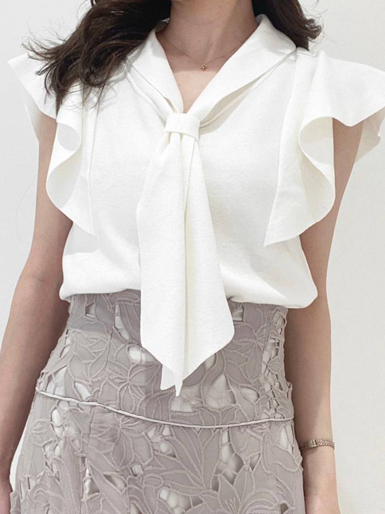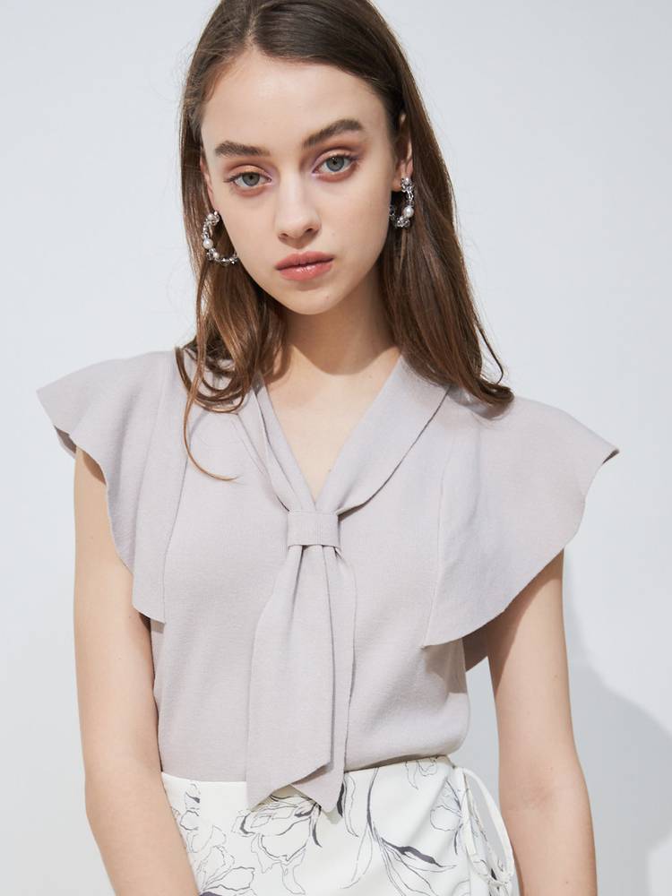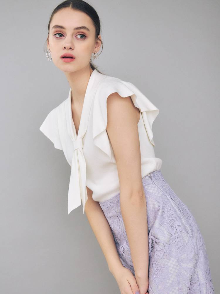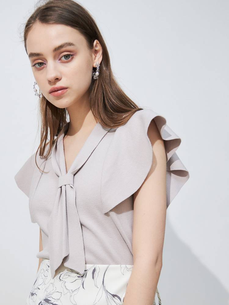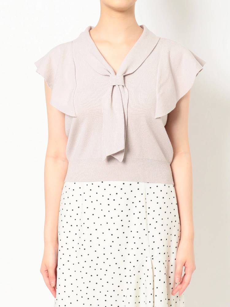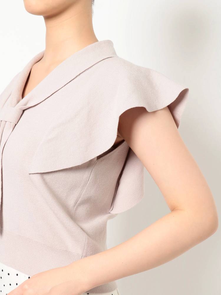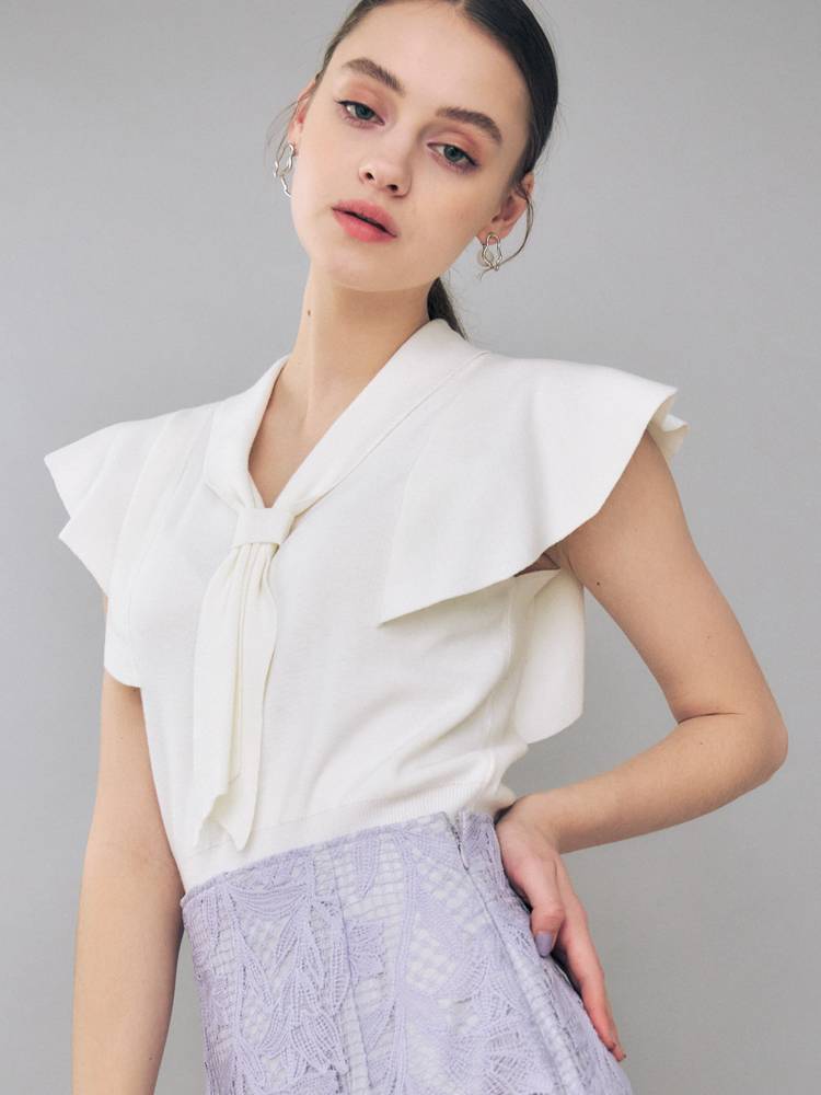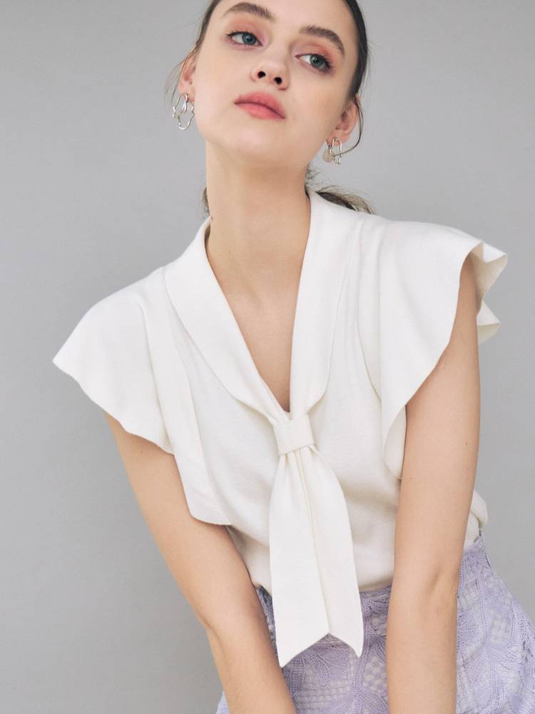 ラッフルデザインにすっきりとしたボウタイをデザインしたコンパクトニット。
