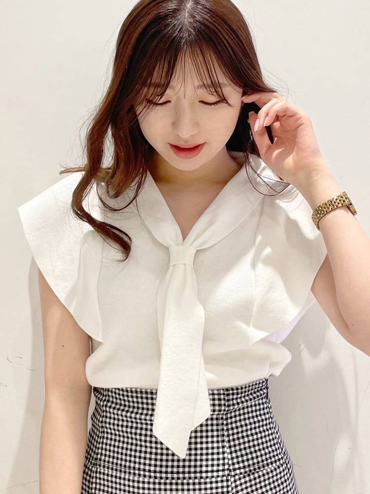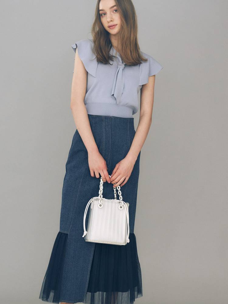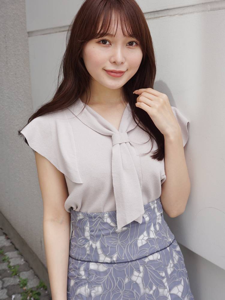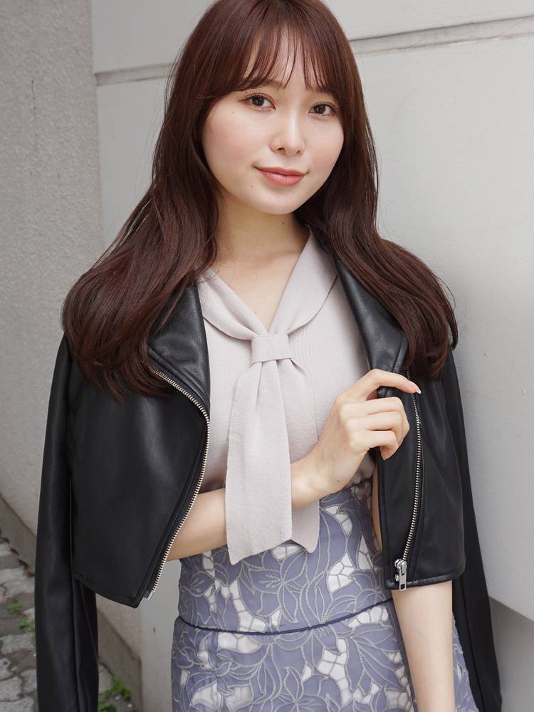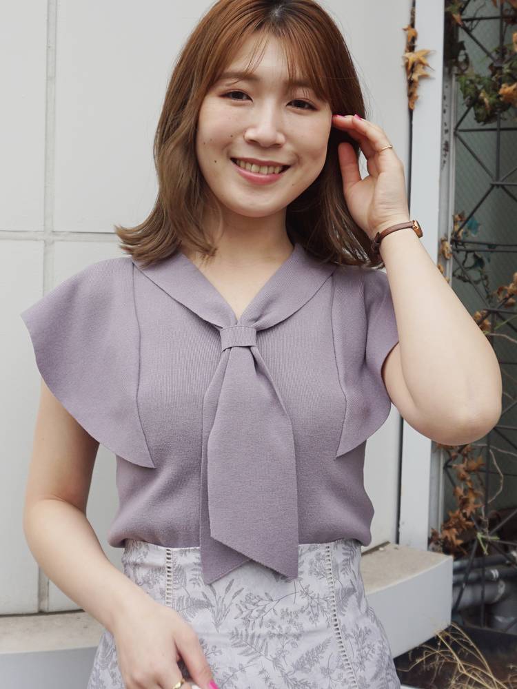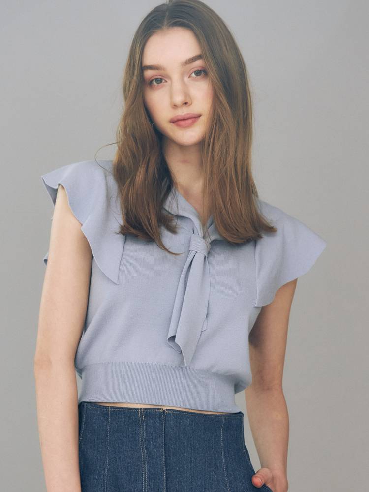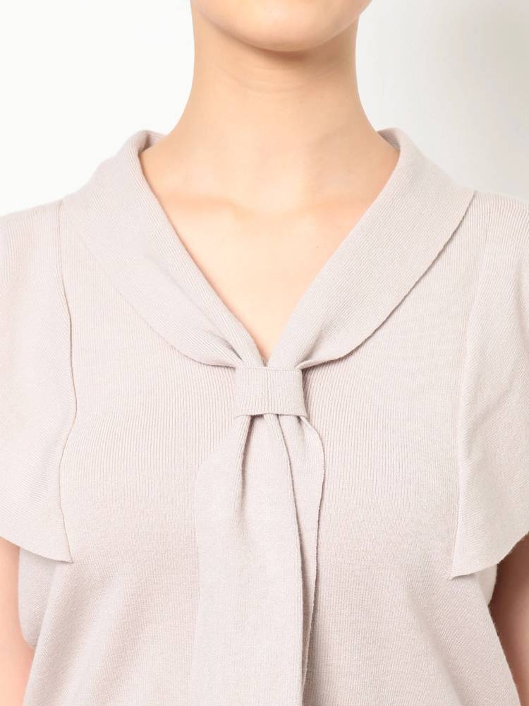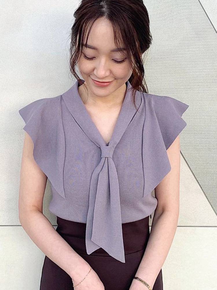 ラッフルデザインにすっきりとしたボウタイをデザインしたコンパクトニット。