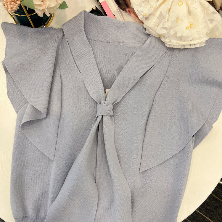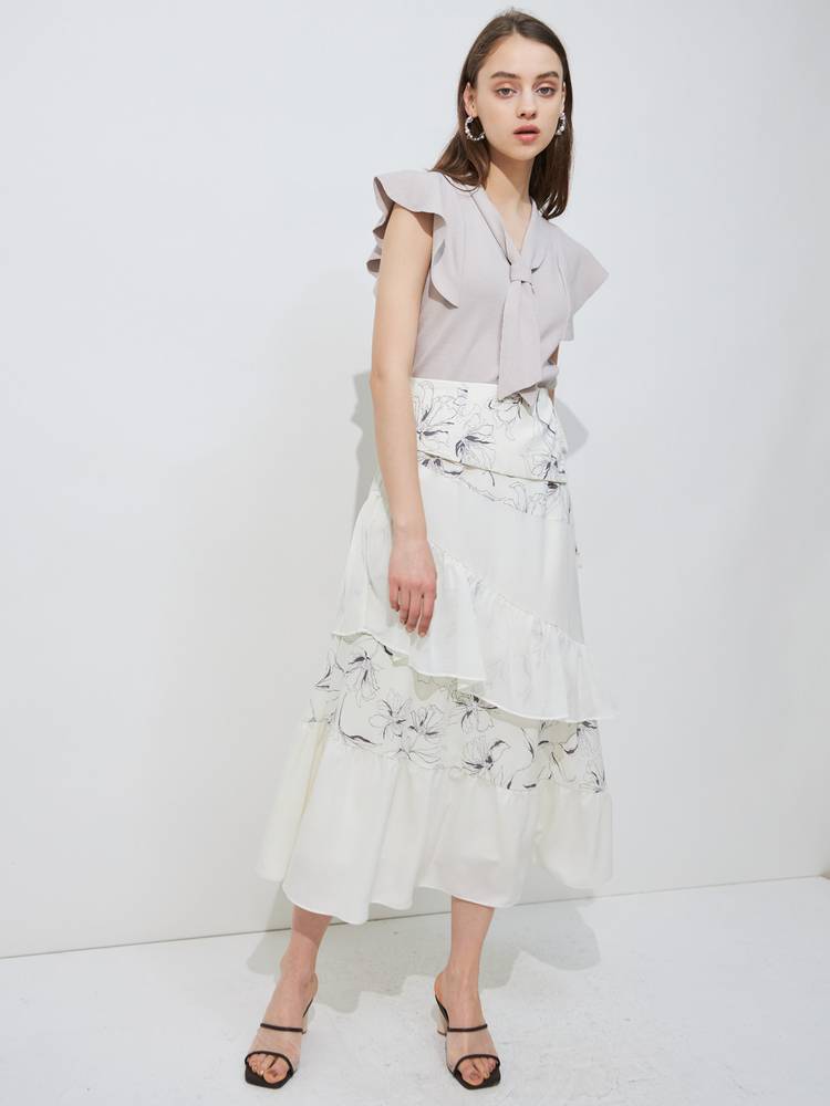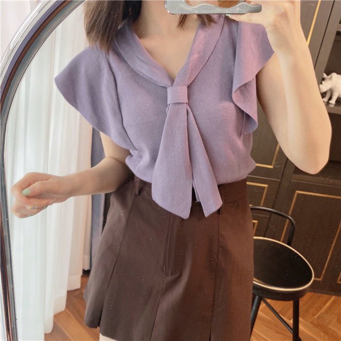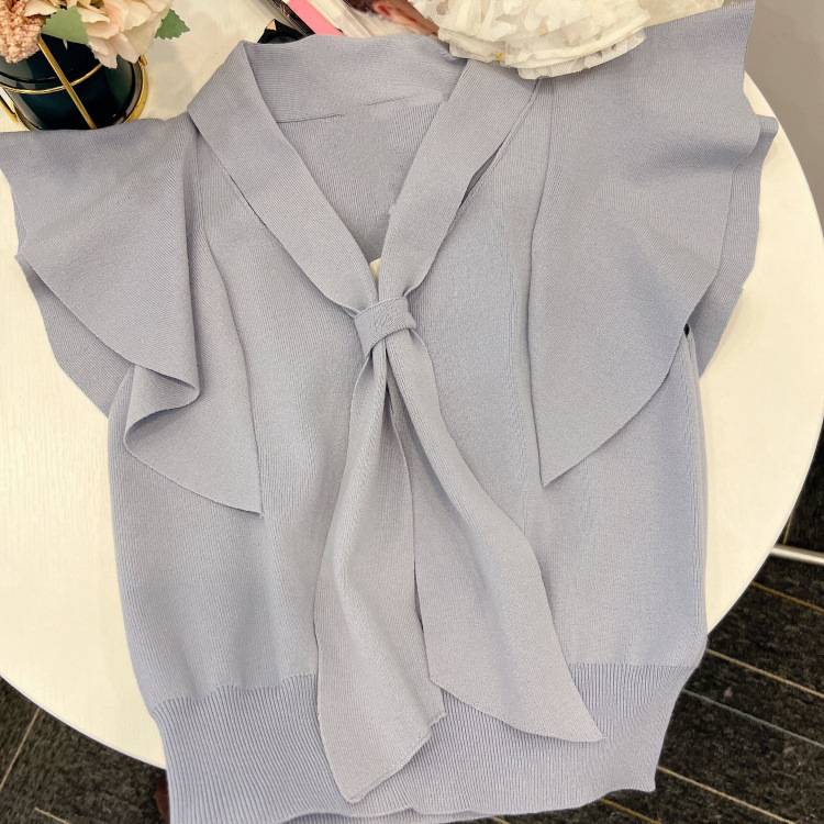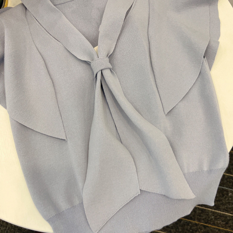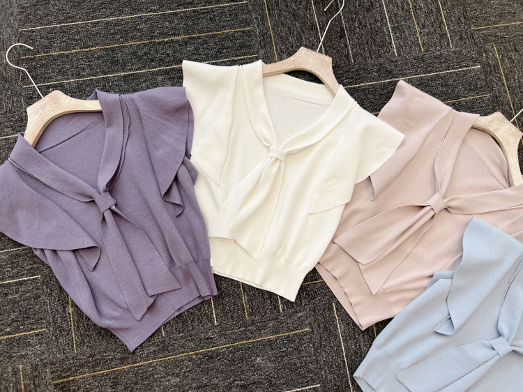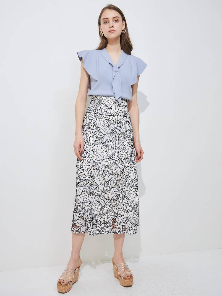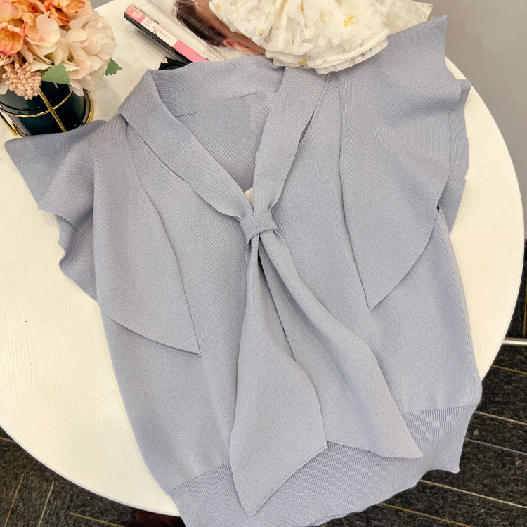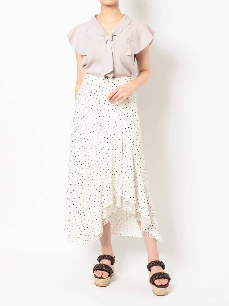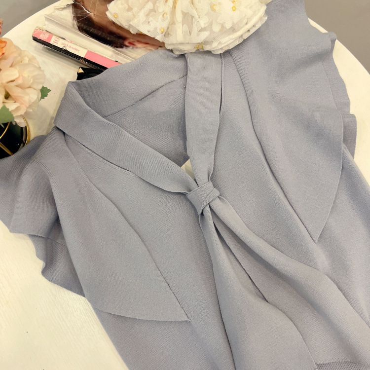 ラッフルデザインにすっきりとしたボウタイをデザインしたコンパクトニット。