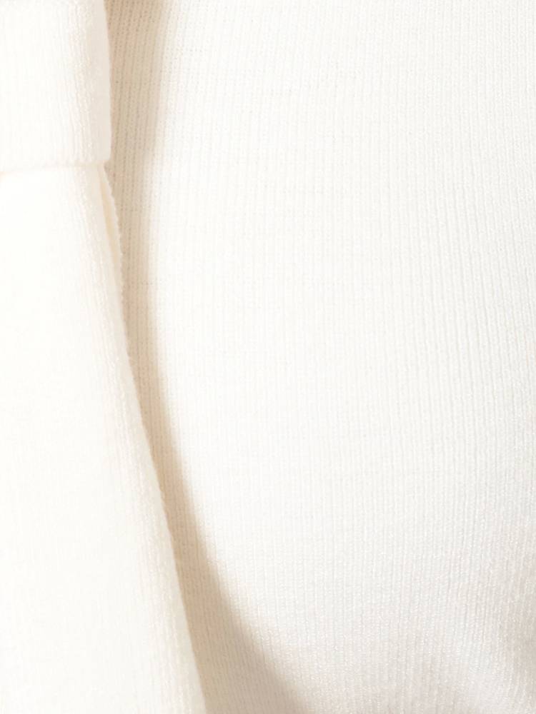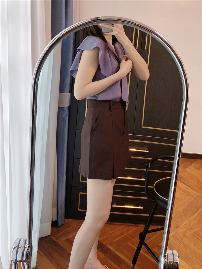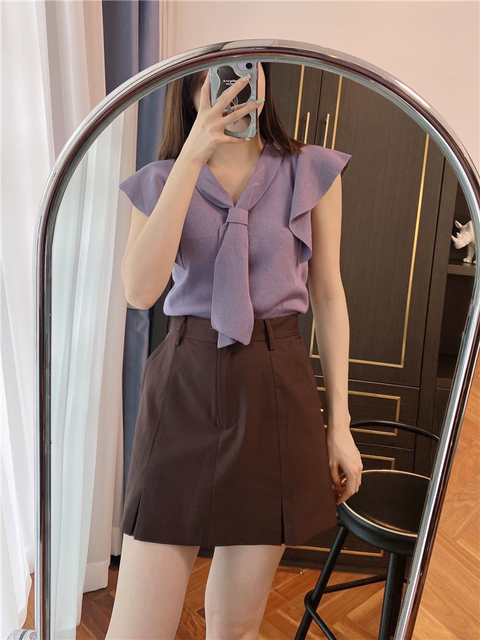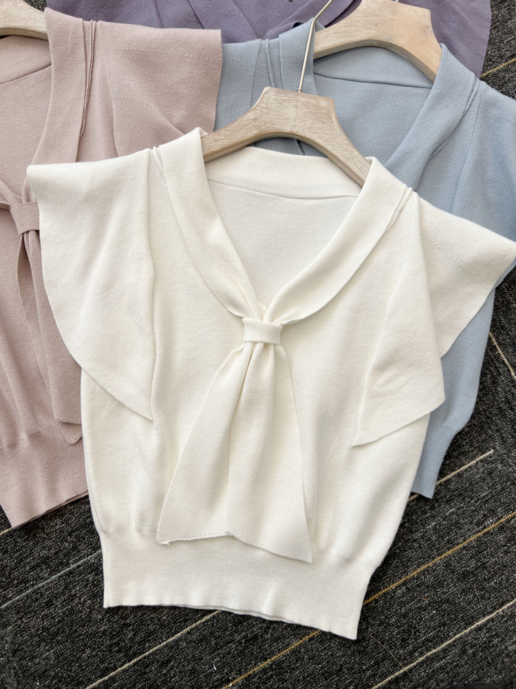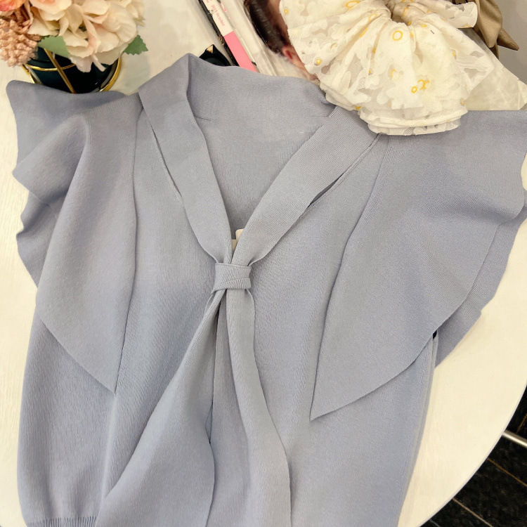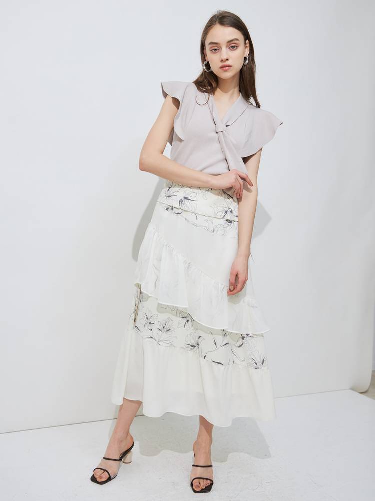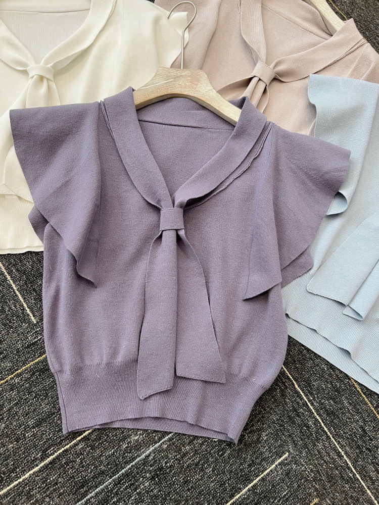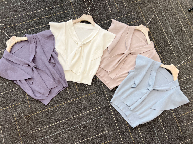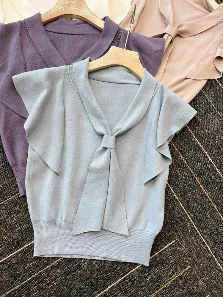 ラッフルデザインにすっきりとしたボウタイをデザインしたコンパクトニット。