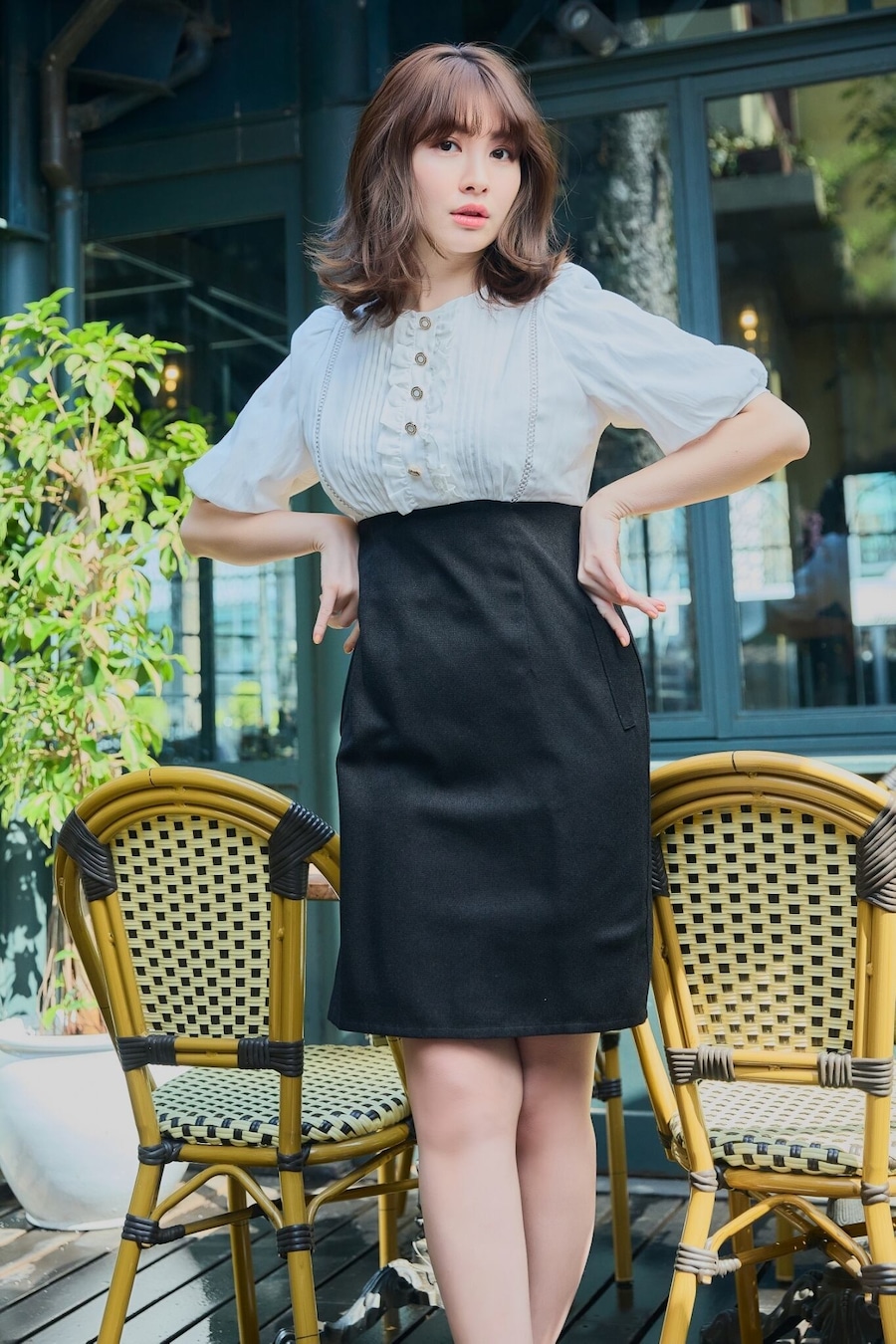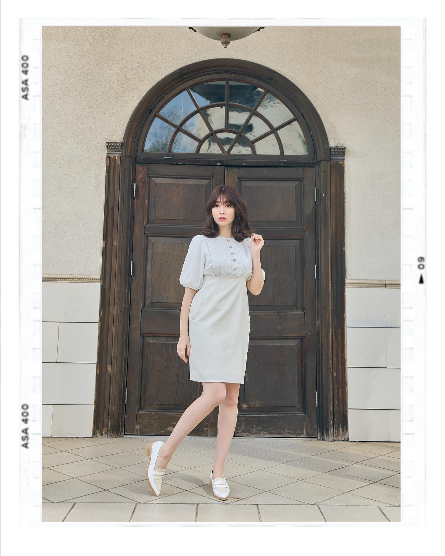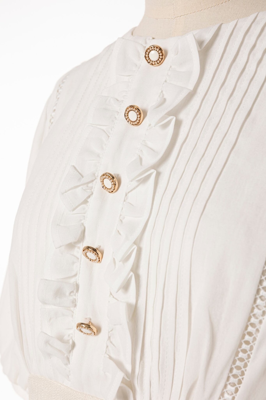 リュクスなボタンや2枚に重ねて仕立てられたボリューム袖など一層フェミニンさを引き立てるデザインもポイントです。